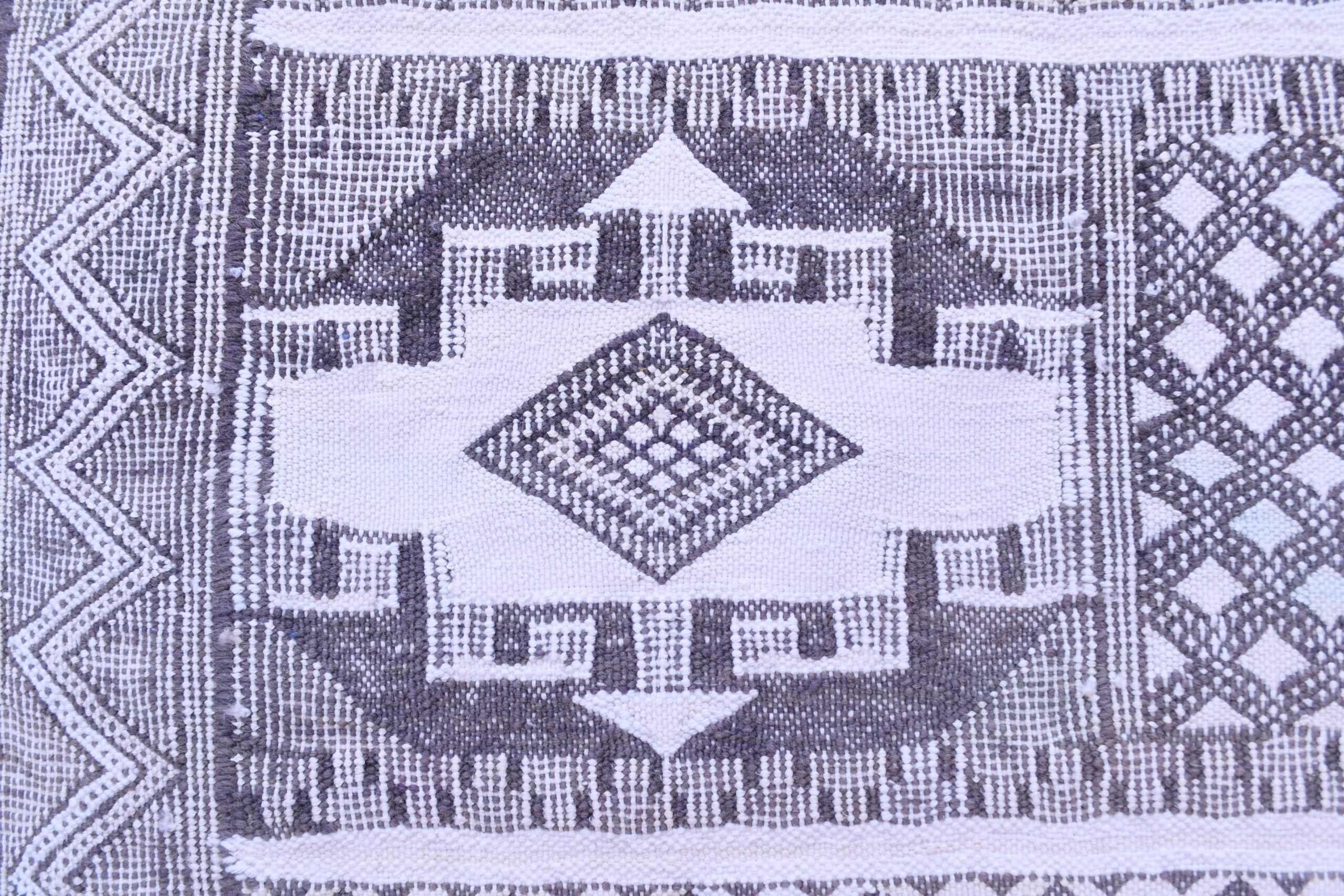 このモロッコ産ティフレット・キリム・ラグは、伝統と現代が融合した精緻なモチーフが織りなす美しい幾何学模様が特徴です。シンメトリーな配置と緻密な職人技が光るデザインは、モロッコの芸術性を体現しており、どんなお部屋にもぴったりのセンターピースです。