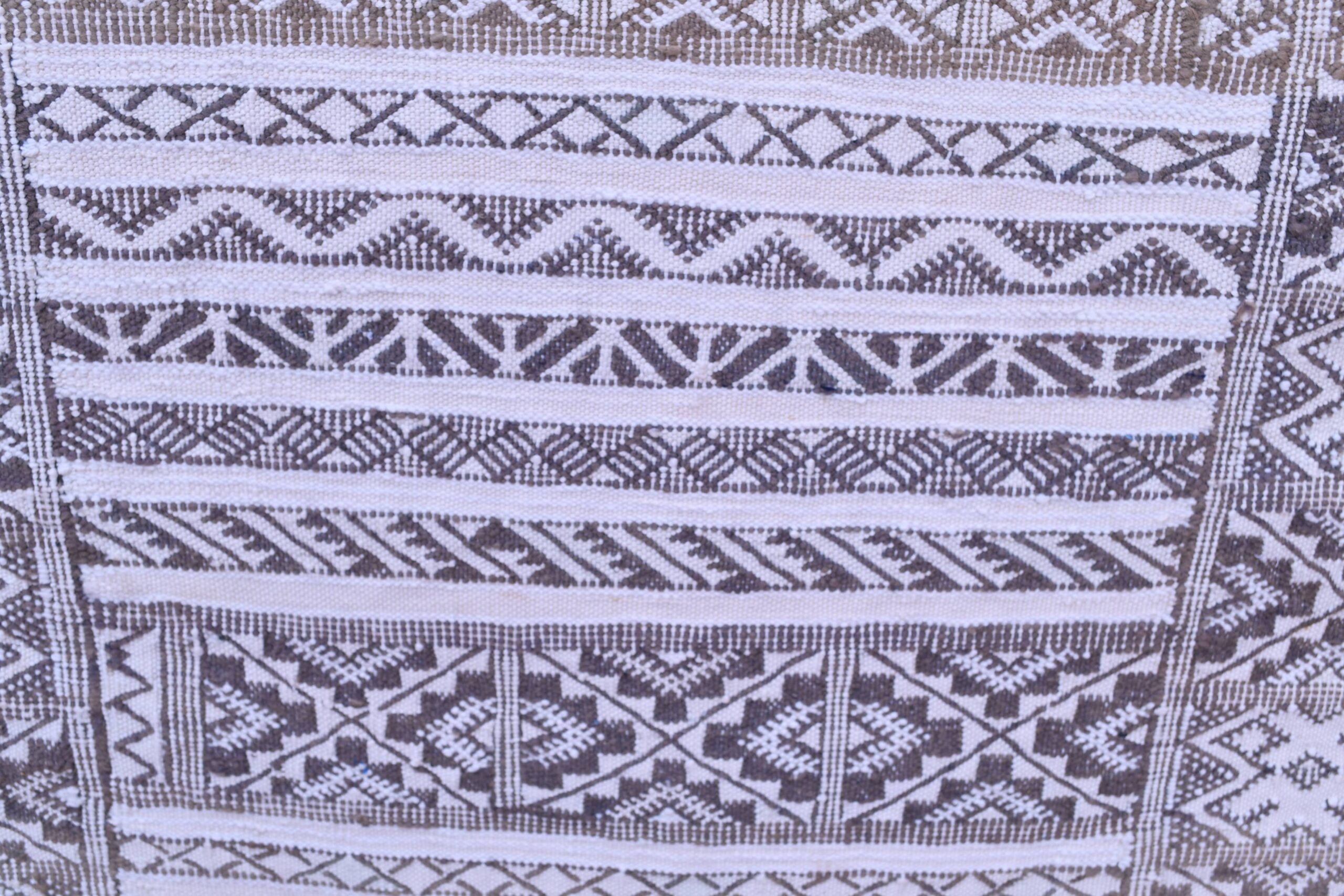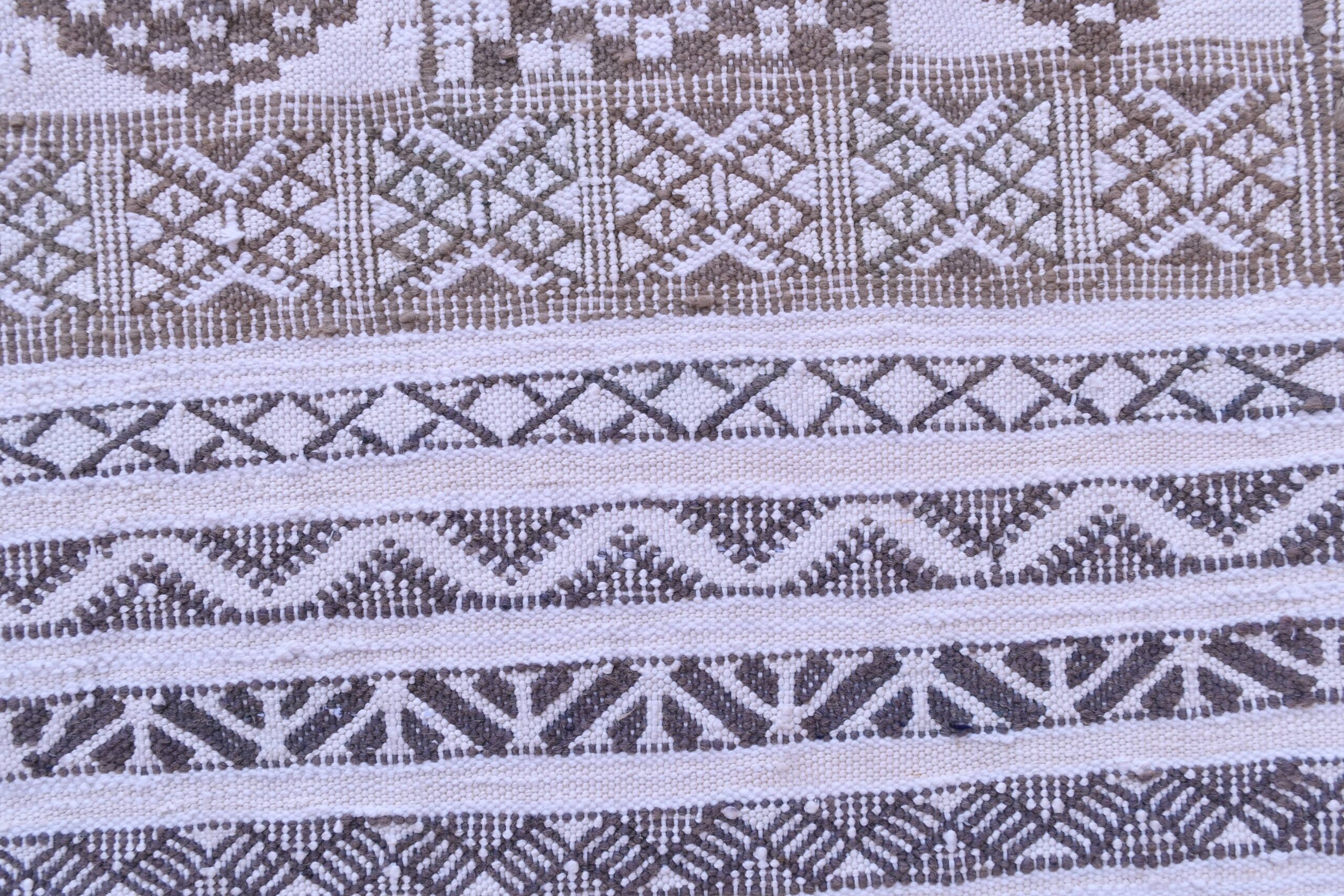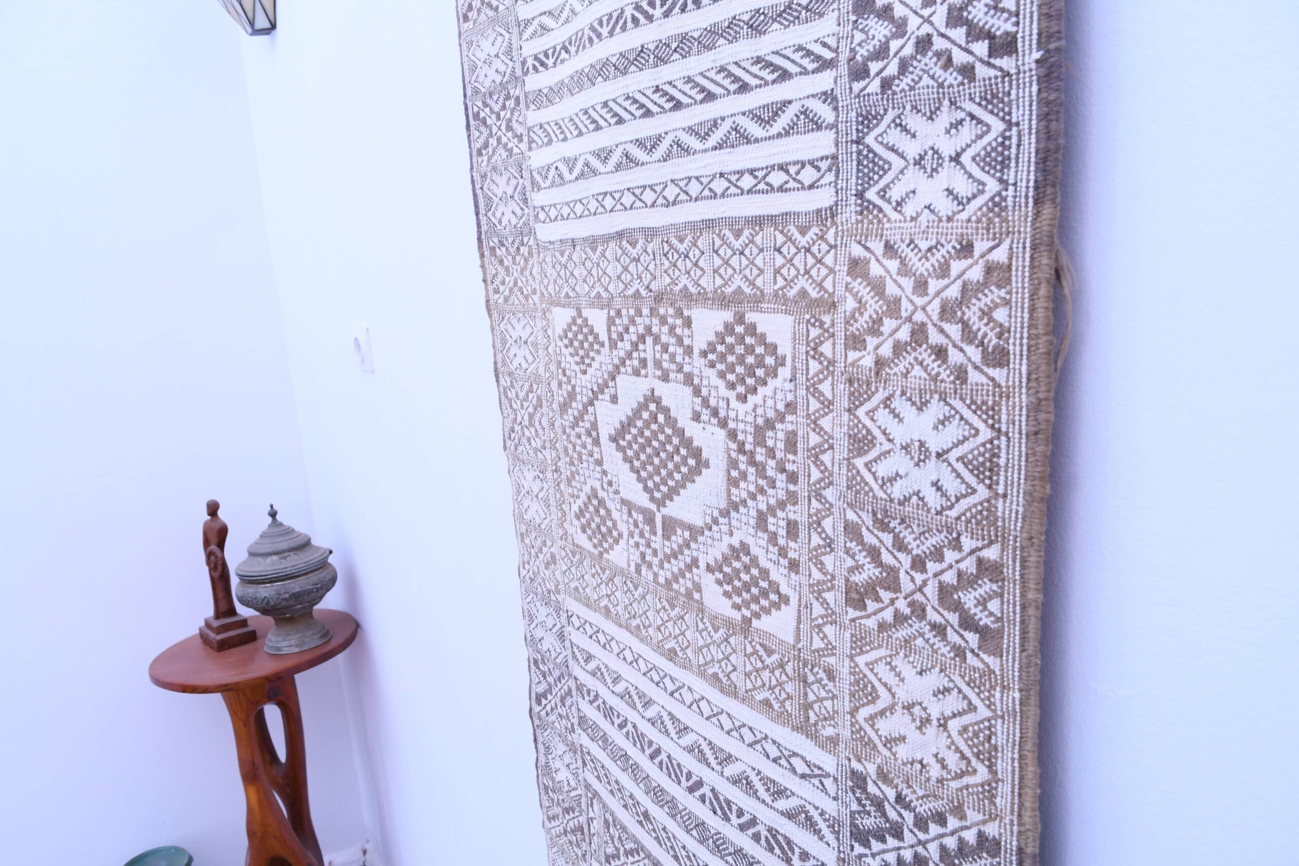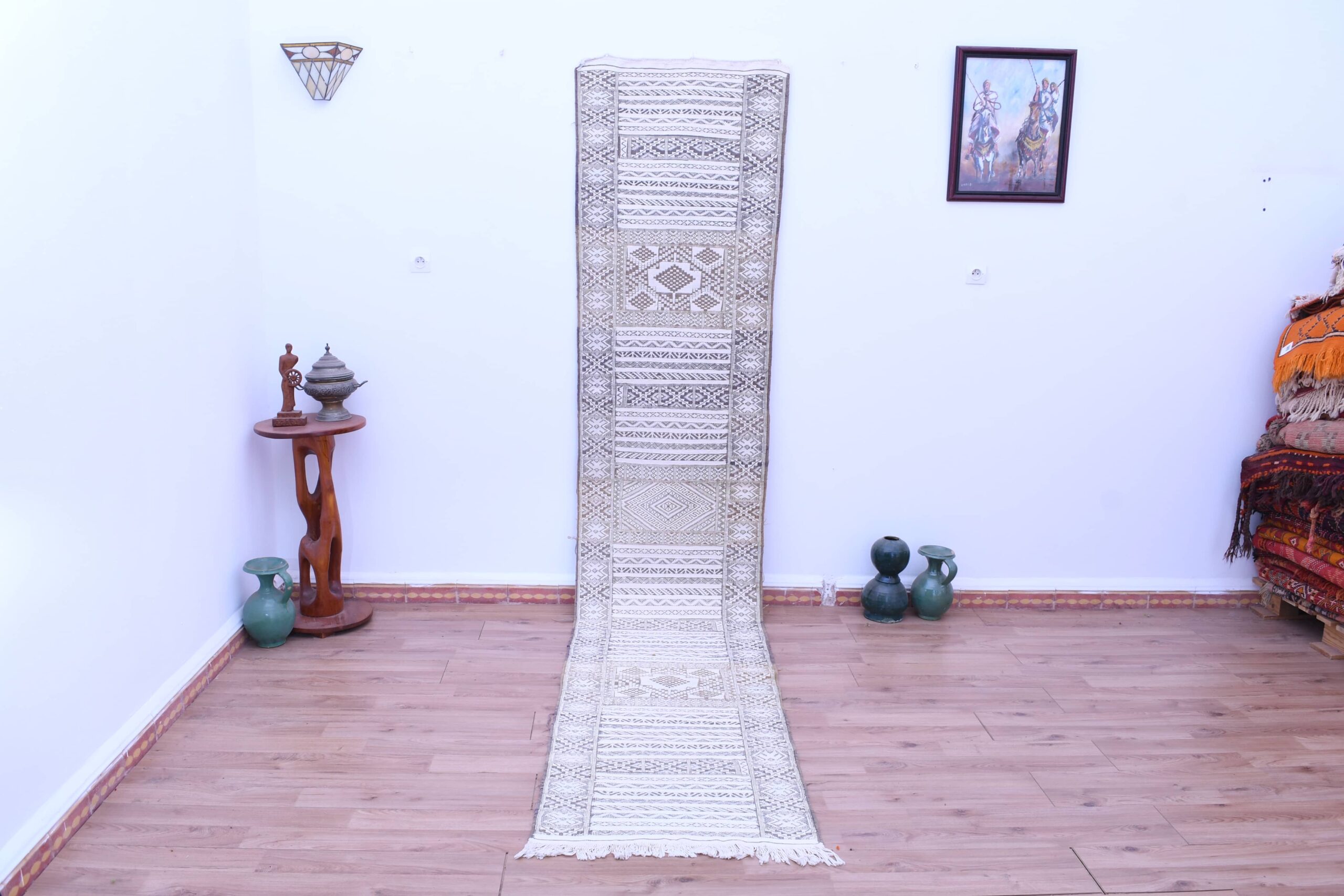 この 72×363 cm のモロッコ ティフレット キリム ラグは、複雑なパターンとニュートラルな色調が特徴で、さまざまな装飾スタイルを引き立てるのに最適です。