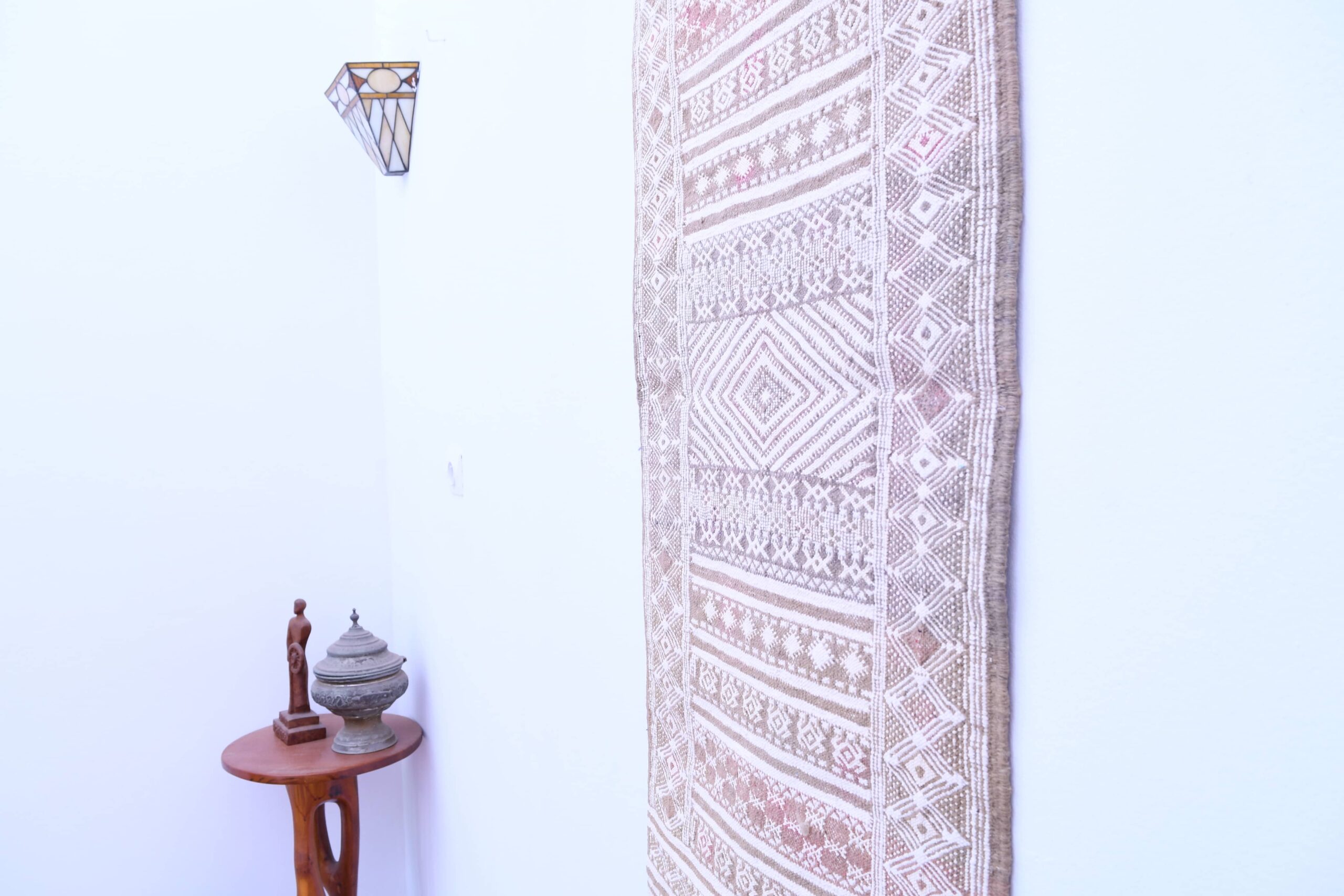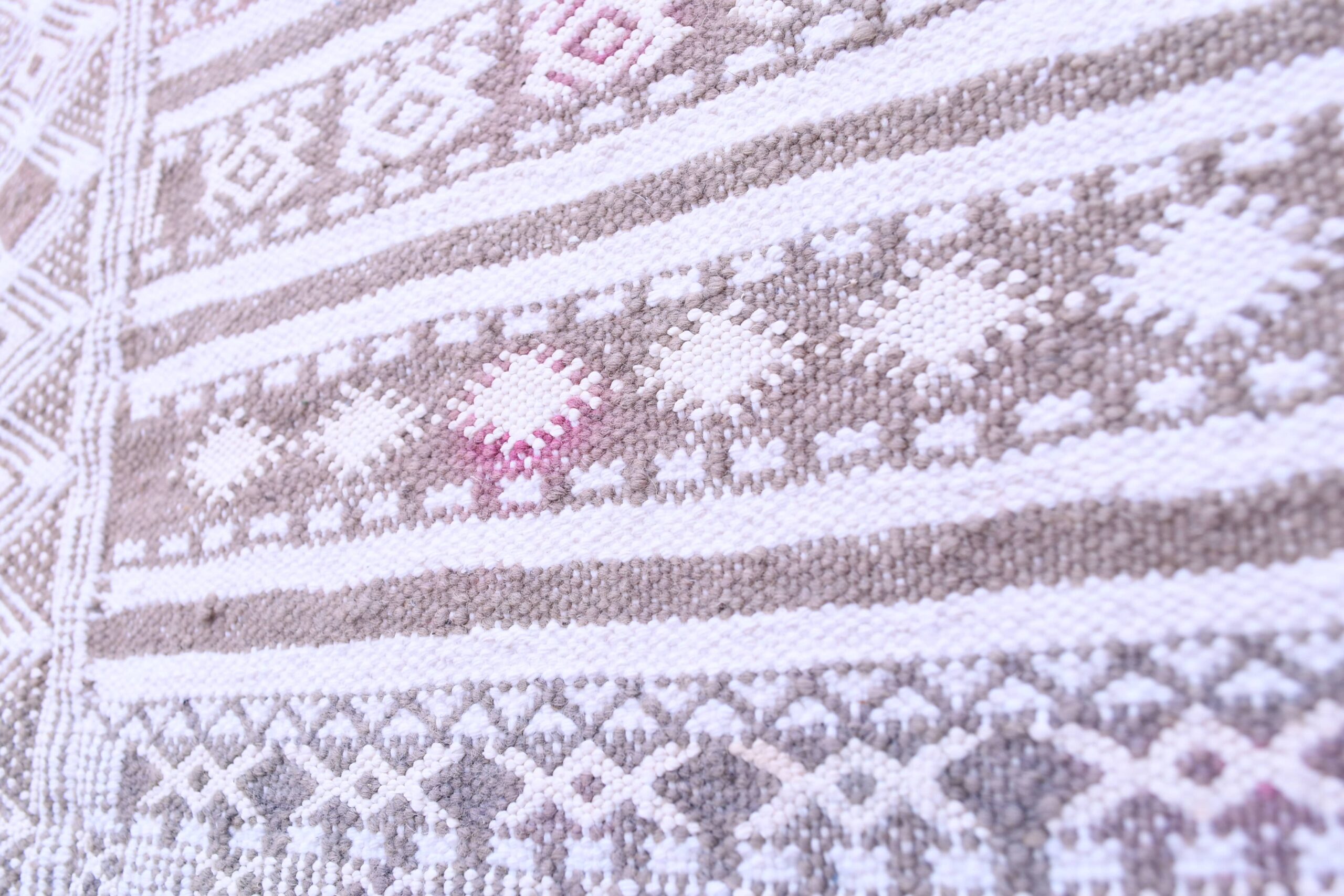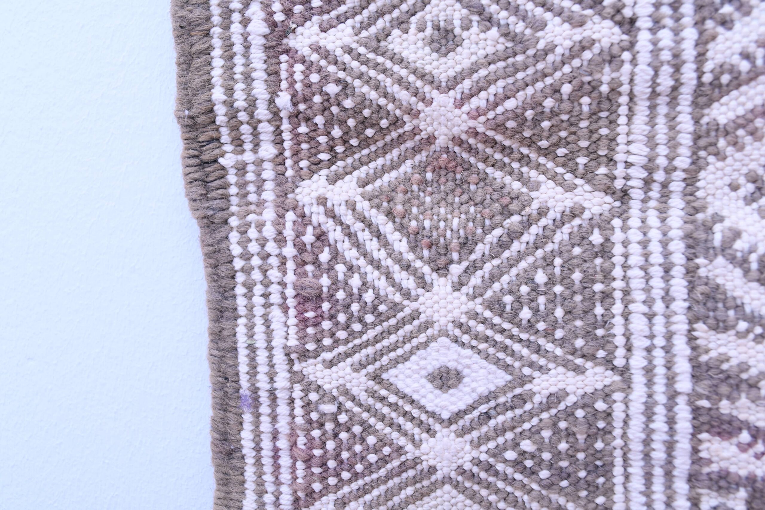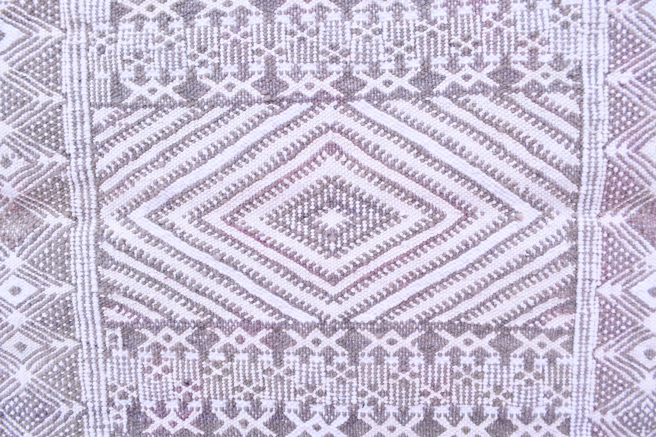 この美しいティフレット・キリム・ラグは、伝統的なモロッコデザインを象徴する精緻な幾何学模様が特徴です。ダイヤモンドと直線が美しく調和したモチーフは、モロッコの職人たちの豊かな文化遺産を反映した、視覚的にも魅力的なタペストリーです。