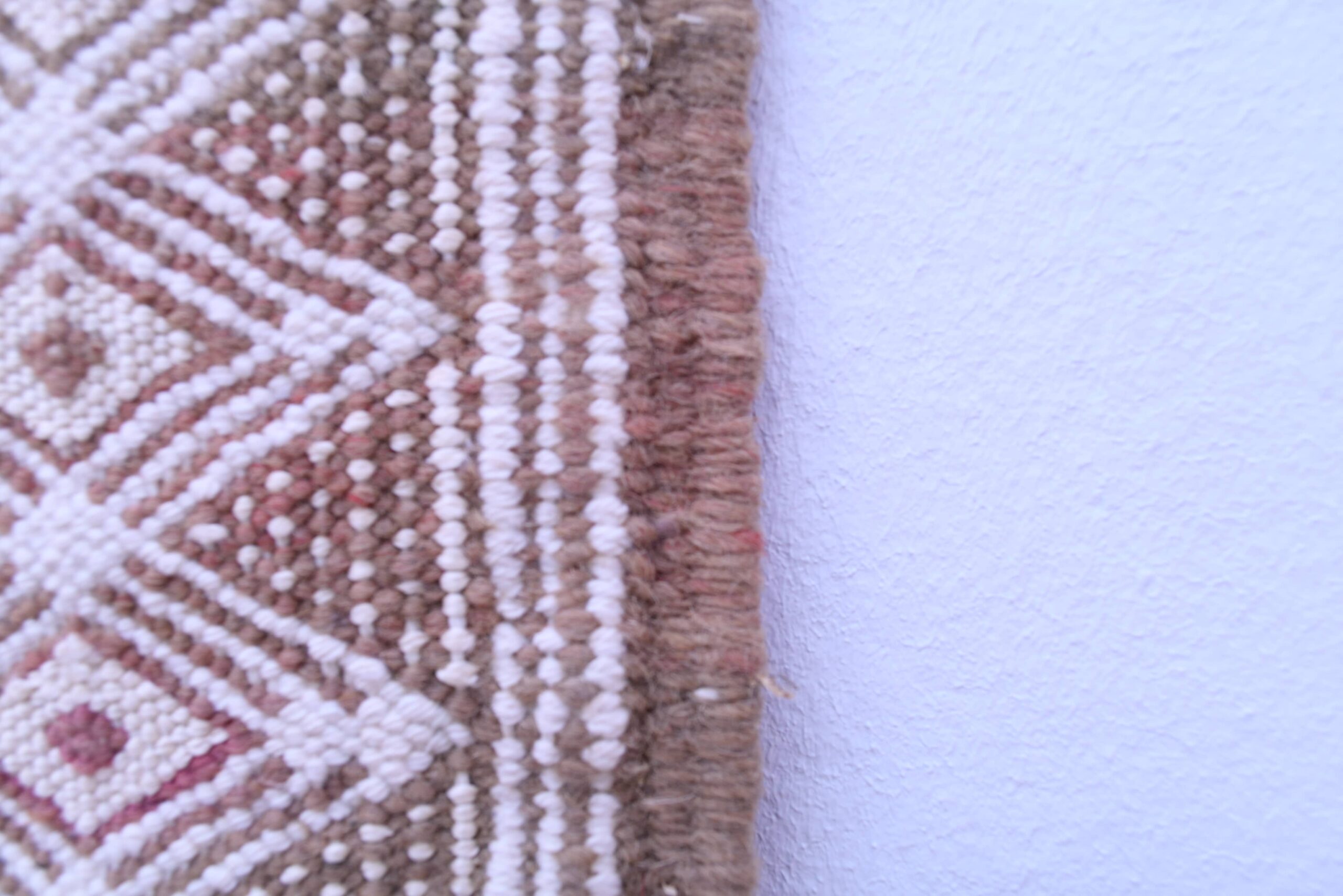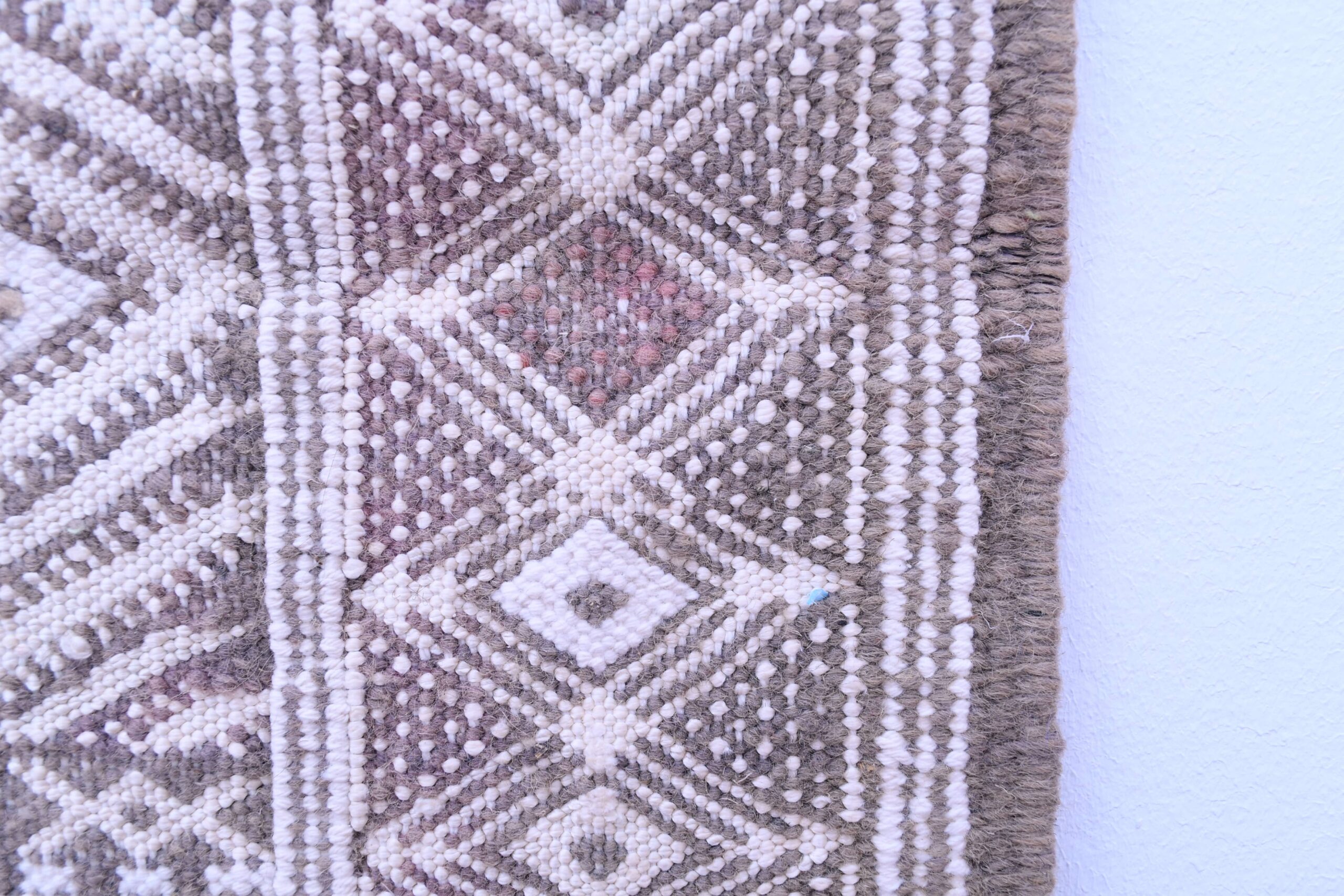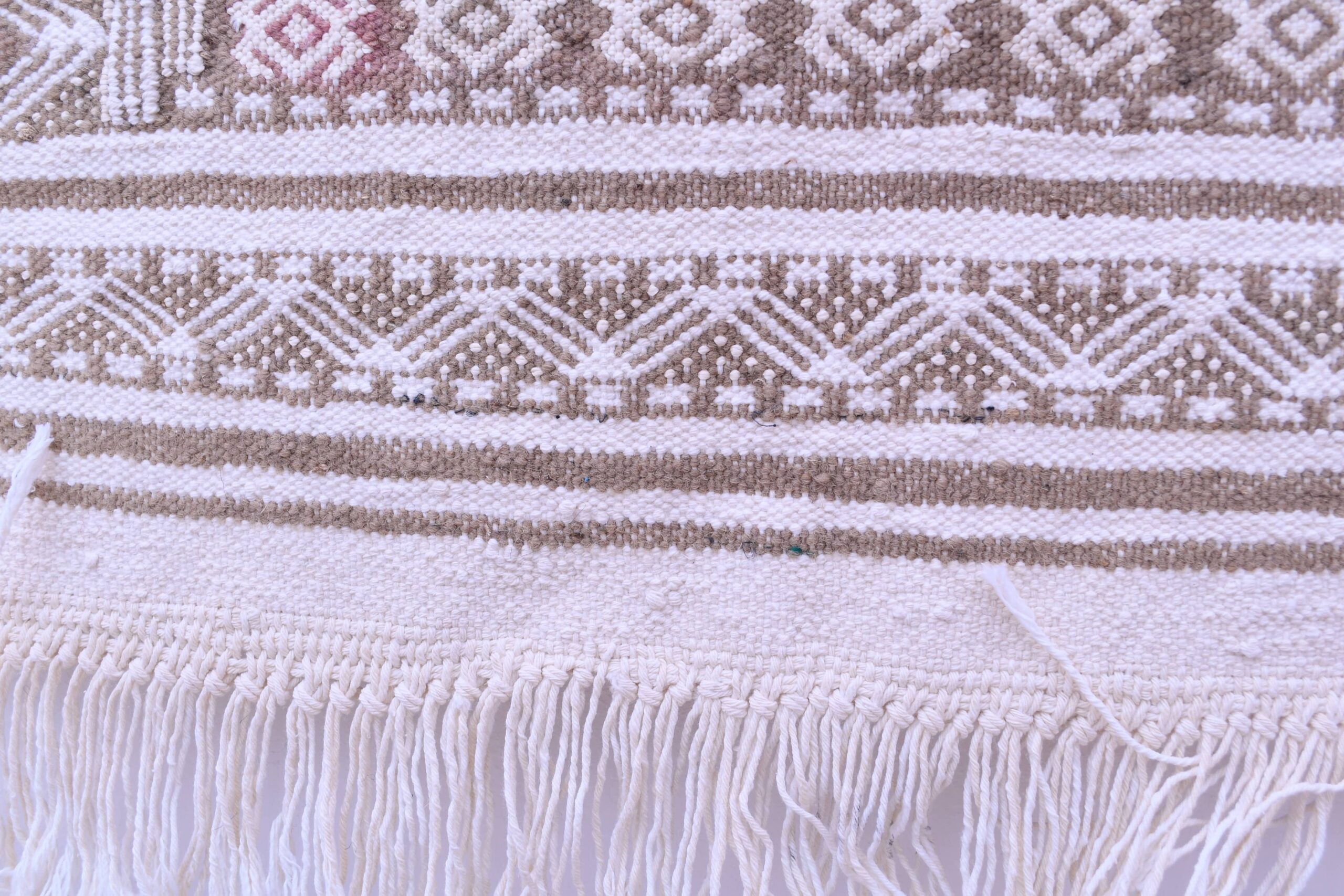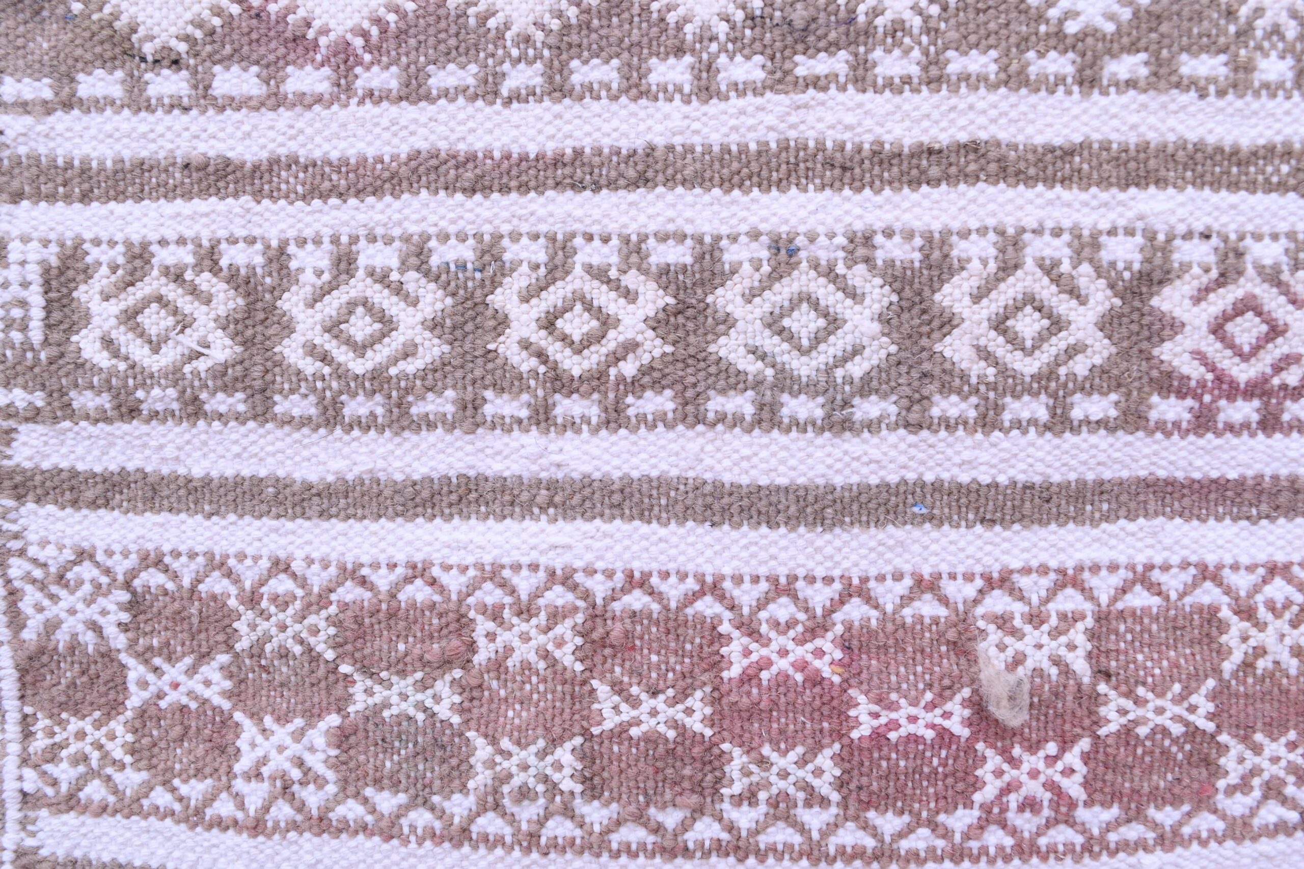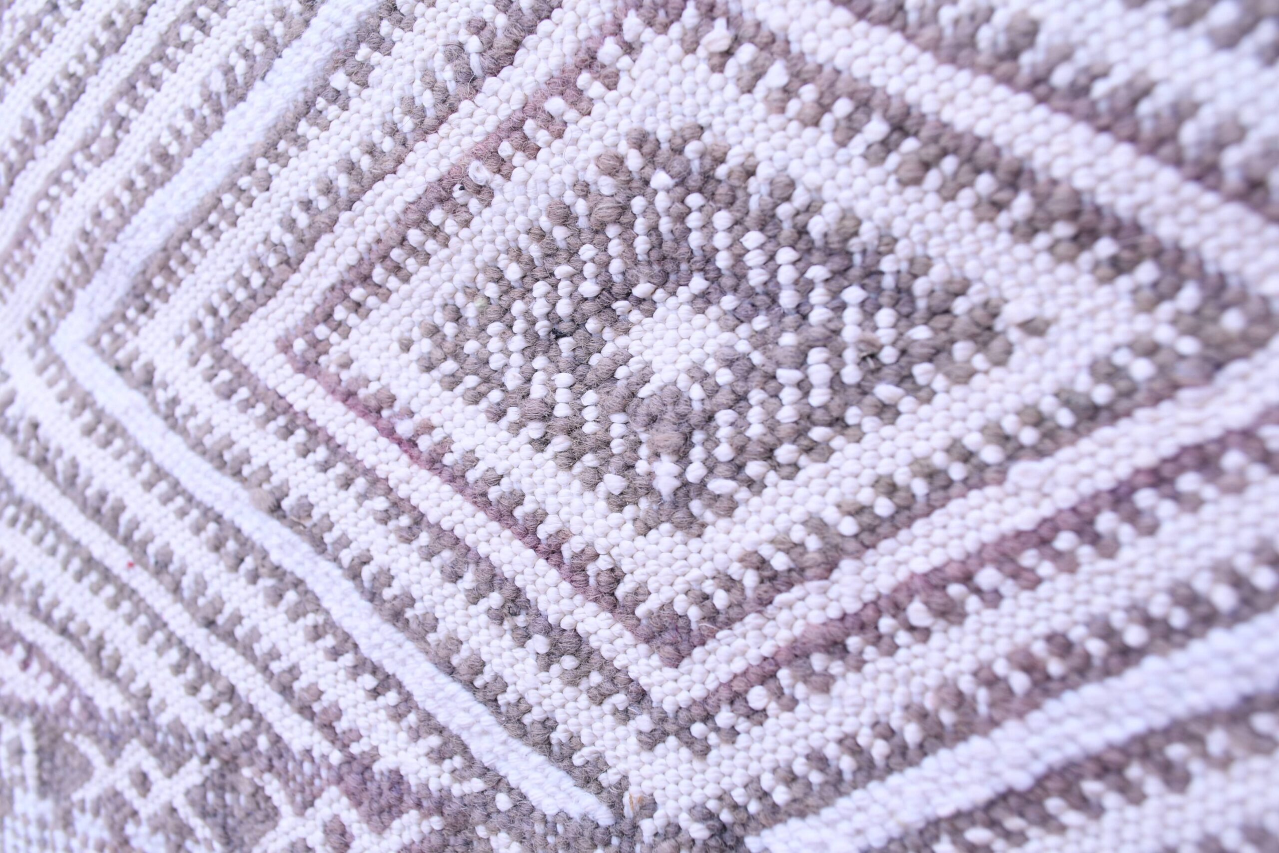 この美しいティフレット・キリム・ラグは、伝統的なモロッコデザインを象徴する精緻な幾何学模様が特徴です。ダイヤモンドと直線が美しく調和したモチーフは、モロッコの職人たちの豊かな文化遺産を反映した、視覚的にも魅力的なタペストリーです。
