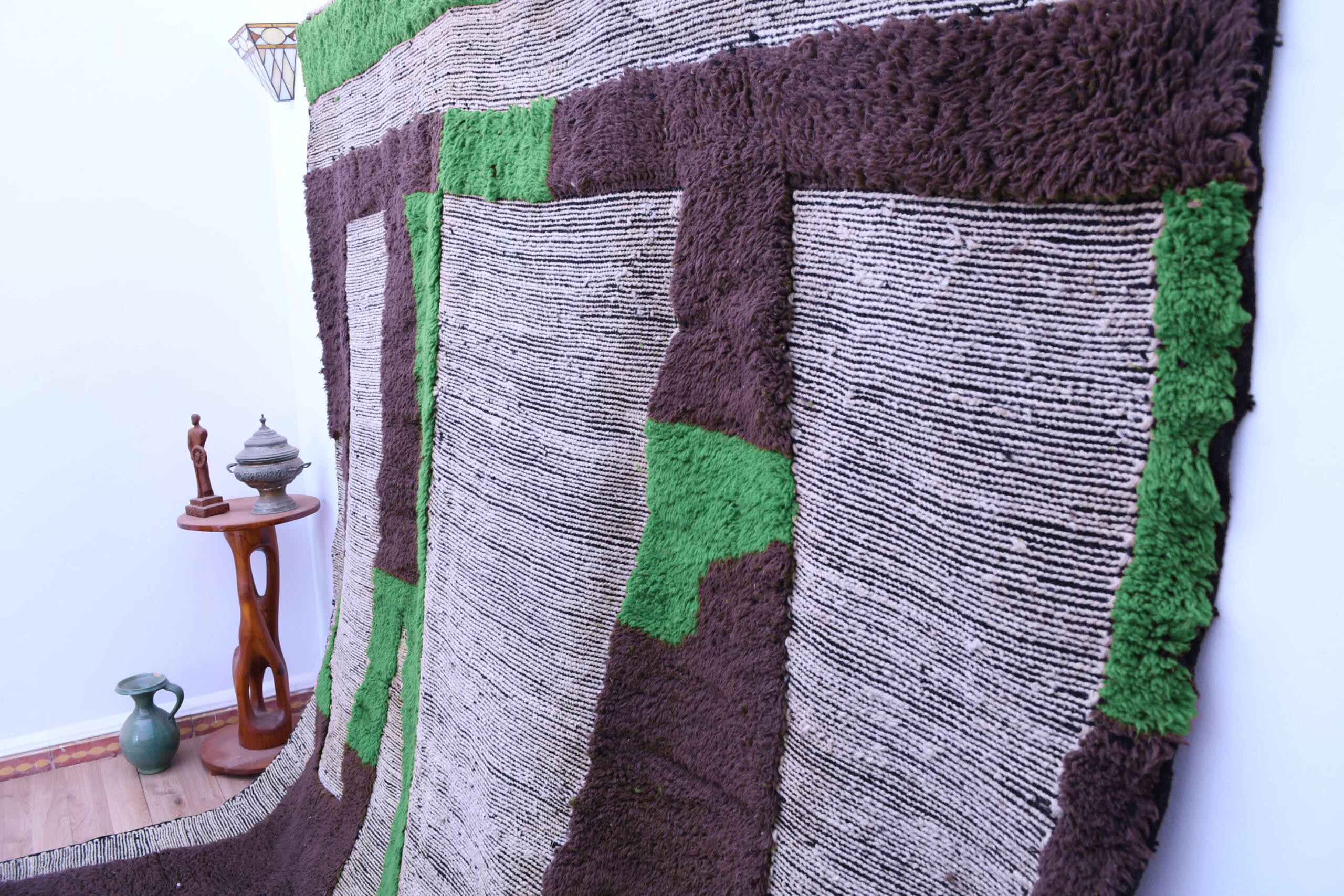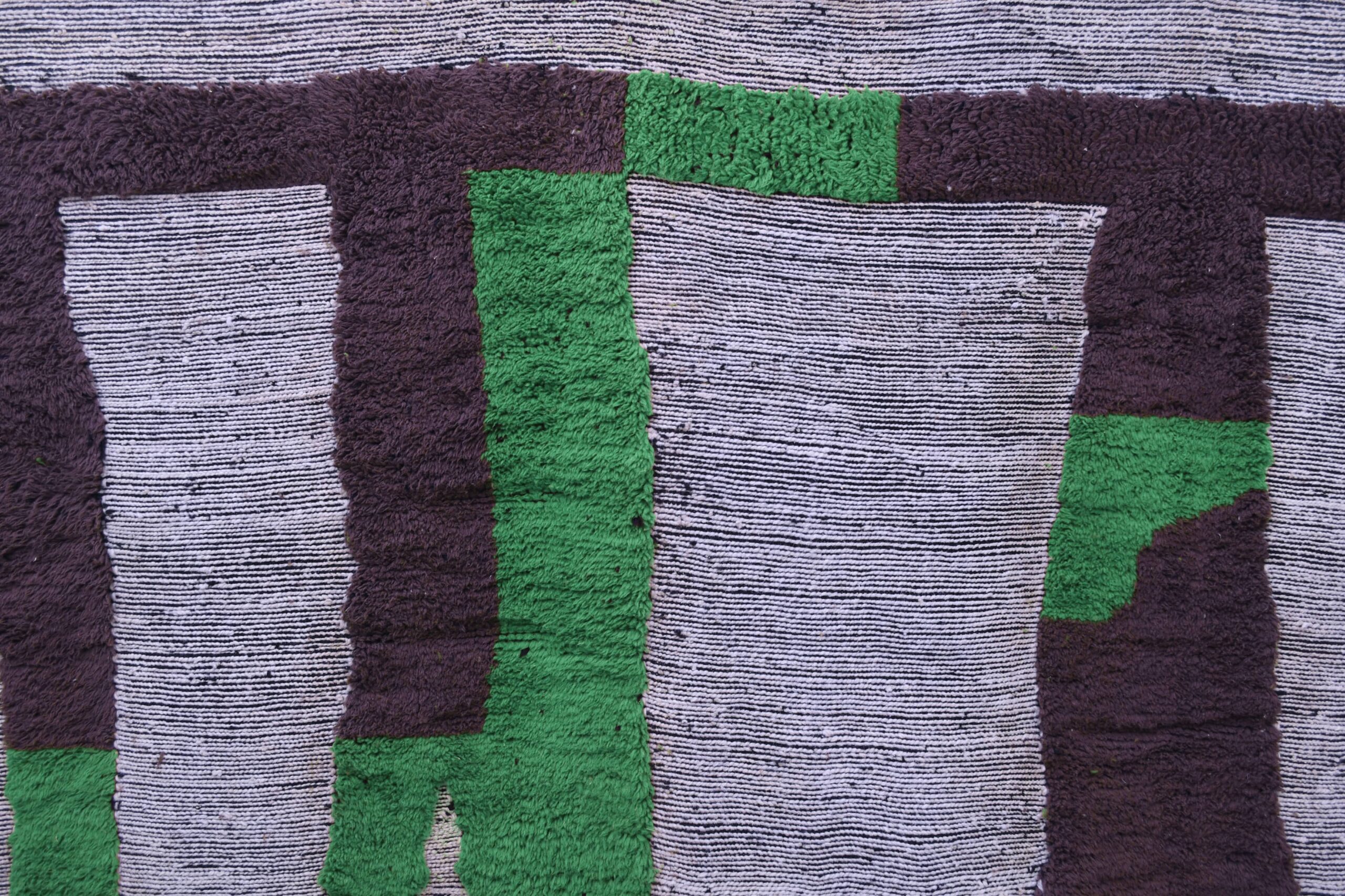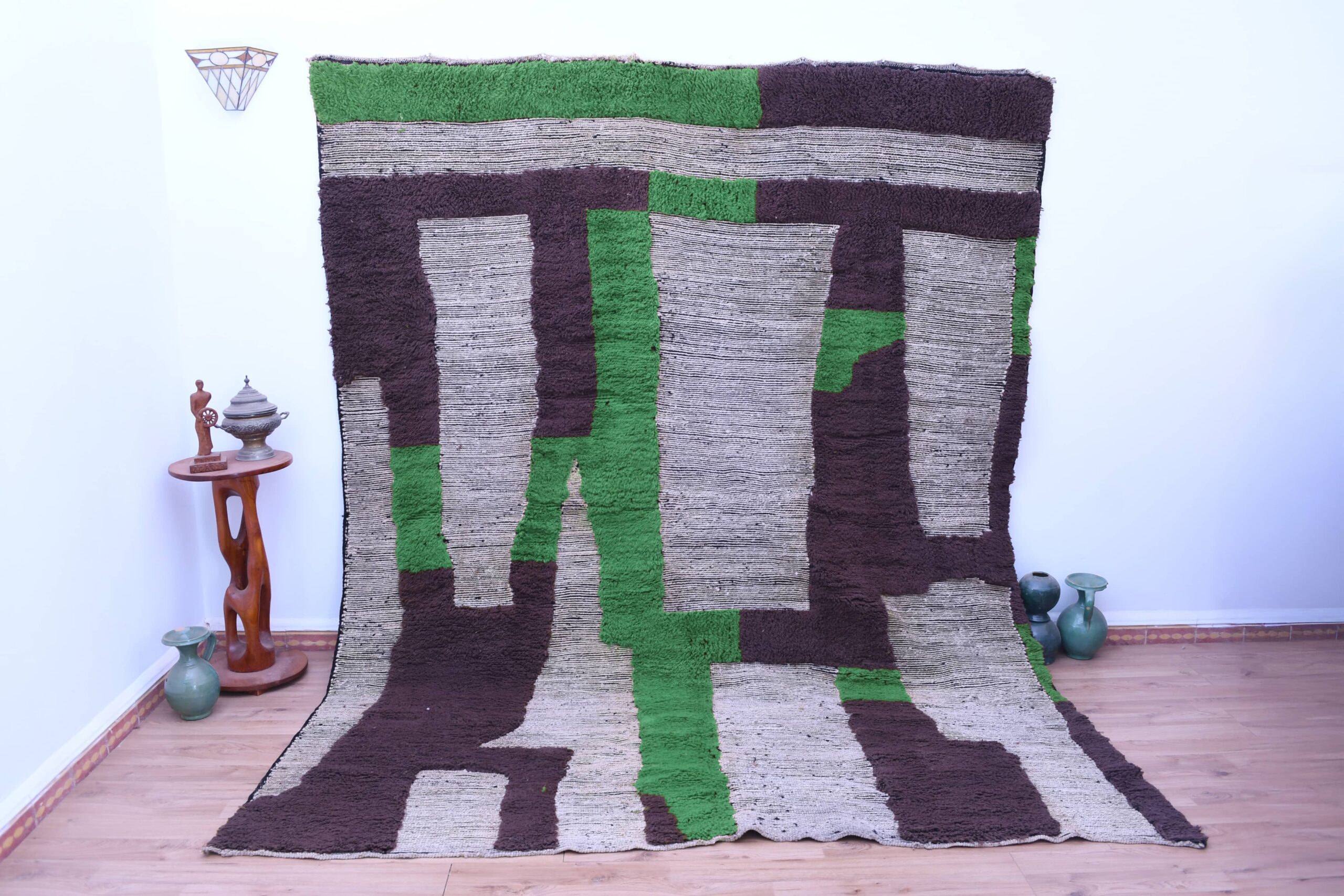 この本格的なハンドメイドモロッコラグは、温かみとくつろぎの空間をアメリカンスタイルの家に演出する、大胆でモダンなステートメントピースです。7×10フィート(約2.1×3メートル)のこのモロッコラグは、リビングルームラグとしても、寝室の広いエリアラグとしても美しくお使いいただけます。3世代にわたるベルベル人の職人によって天然ウールから手織りされたこのラグは、ニュートラルグレーのベースに深みのあるブラウン、そして鮮やかなグリーンのアクセントが調和し、モダンなボヘミアンスタイルを演出します。さらに、フェアトレード認証を受けた職人技で仕上げられた、信頼できる逸品です。