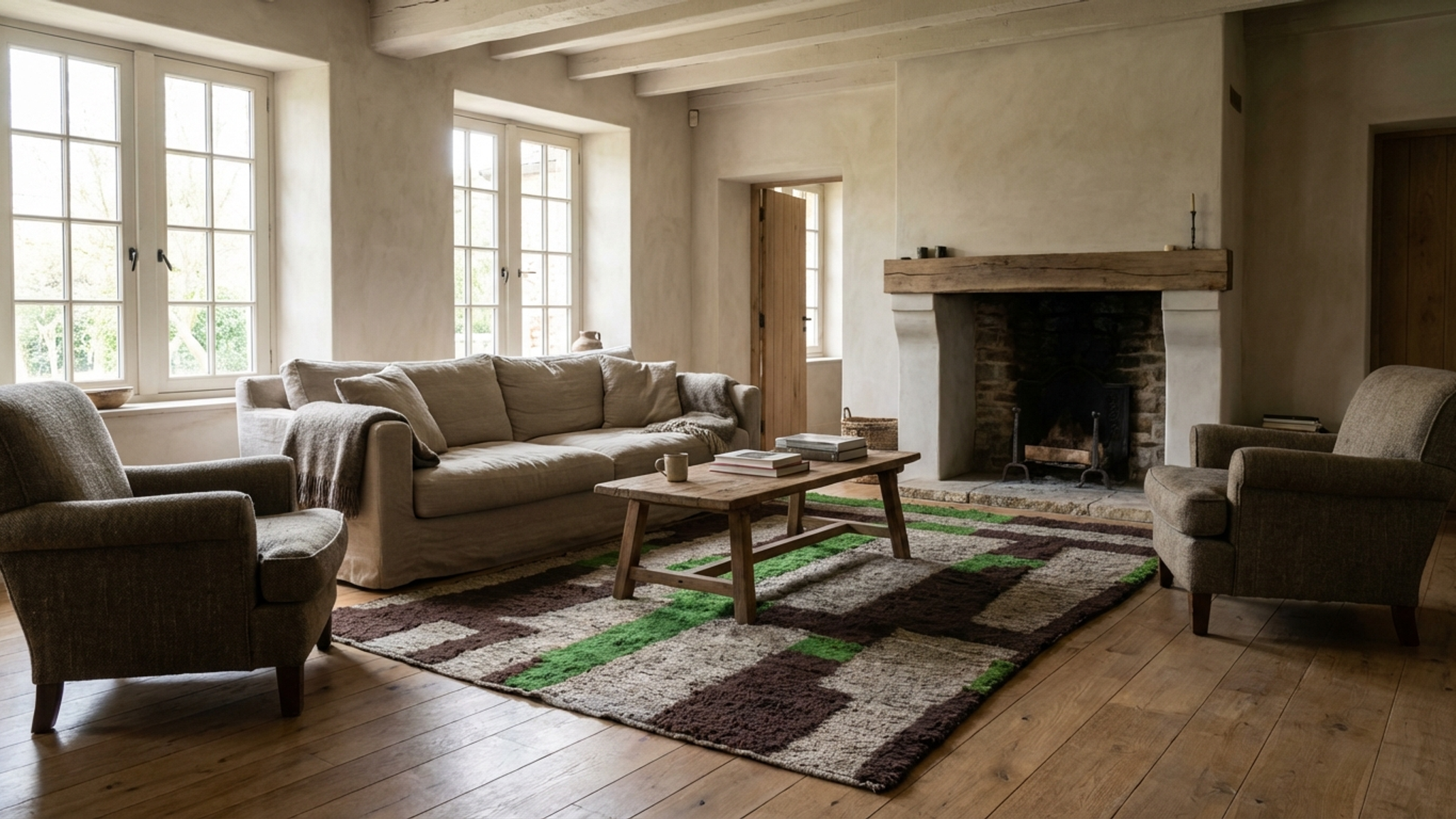 カラーファーストのスタイリング:ニュートラルグレーのラグは、アイボリーのソファ、ブラックのアクセント、オーク材の床、温かみのある白い壁と合わせやすく、チョコレートブラウンのブロックが部屋の落ち着きを与えます。フレッシュグリーンのセクションは、植物や自然な質感と相性が良く、派手さを感じさせないデザイナーのポップな雰囲気を添えています。モダンな幾何学模様/抽象模様は、ボヘミアン、ミニマリスト、コンテンポラリーなインテリアに最適です。特に、スカンジナビア風の空間で、存在感のある一枚が欲しい場合におすすめです。ウール製のエリアラグなので、足元は心地よく、しっかりとした感触です。