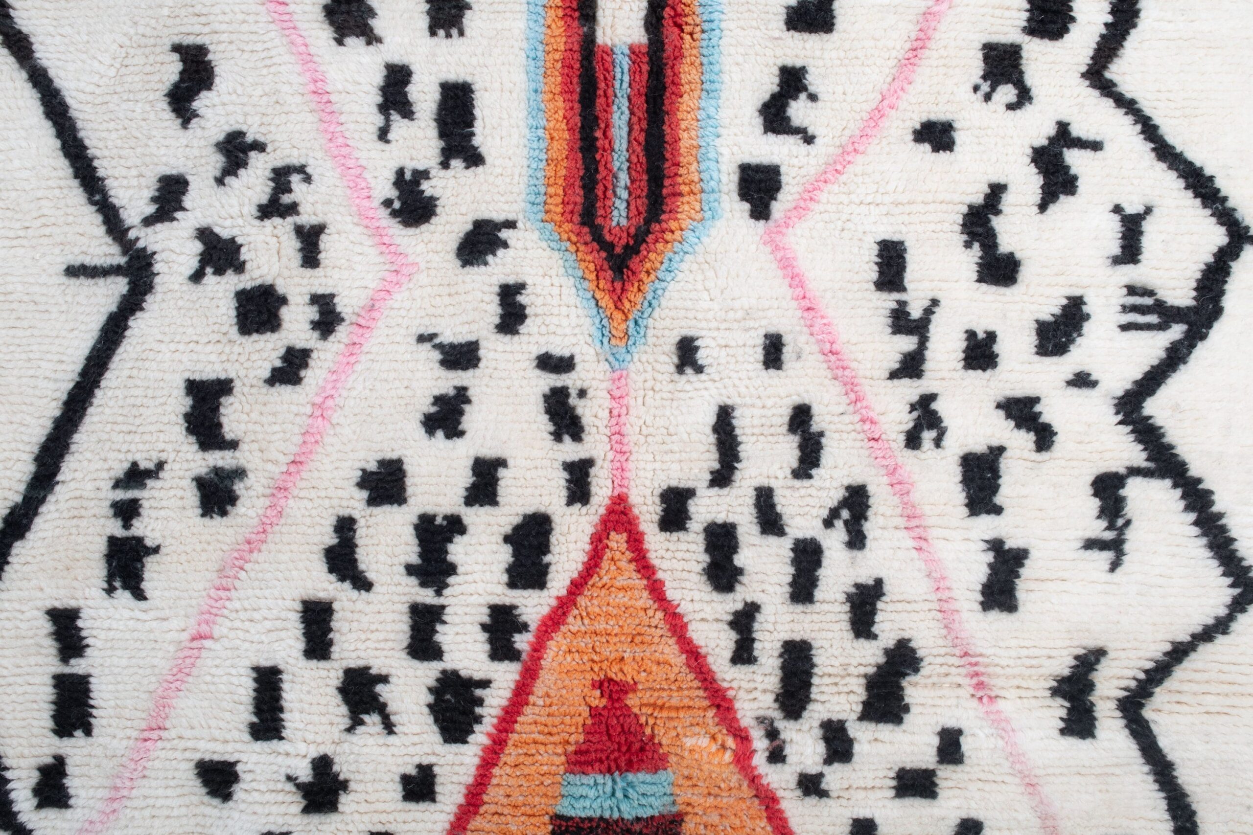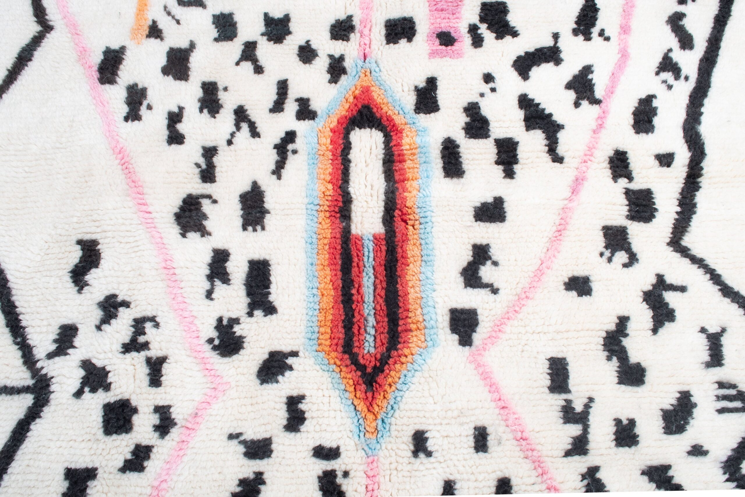 This Azilal Moroccan rug features an ivory/cream ホワイト field with scattered black motifs, framed by bold zigzag borders and soft pink lines that create a striking tribal geometry. Two central diamond medallions add warm orange, coral 赤, and sky blue accents for a true multicolor statement without feeling busy. The handwoven wool pile has a cozy, touchable texture and a soft medium pile feel underfoot—perfect as a ベルベル絨毯 in a reading corner, entry nook, or bedside area rug. Works beautifully in boho, Scandinavian, minimalist, and modern farmhouse interiors.