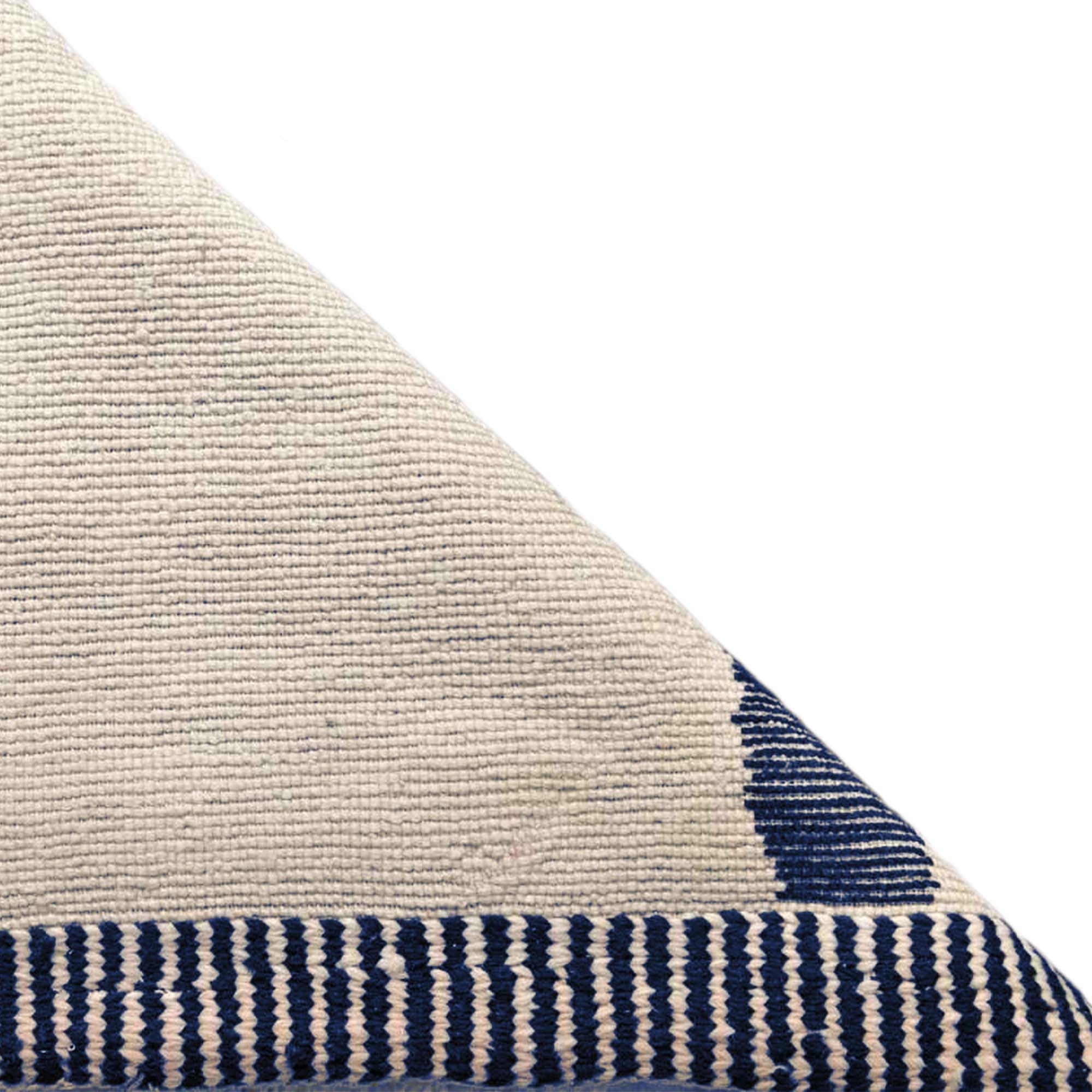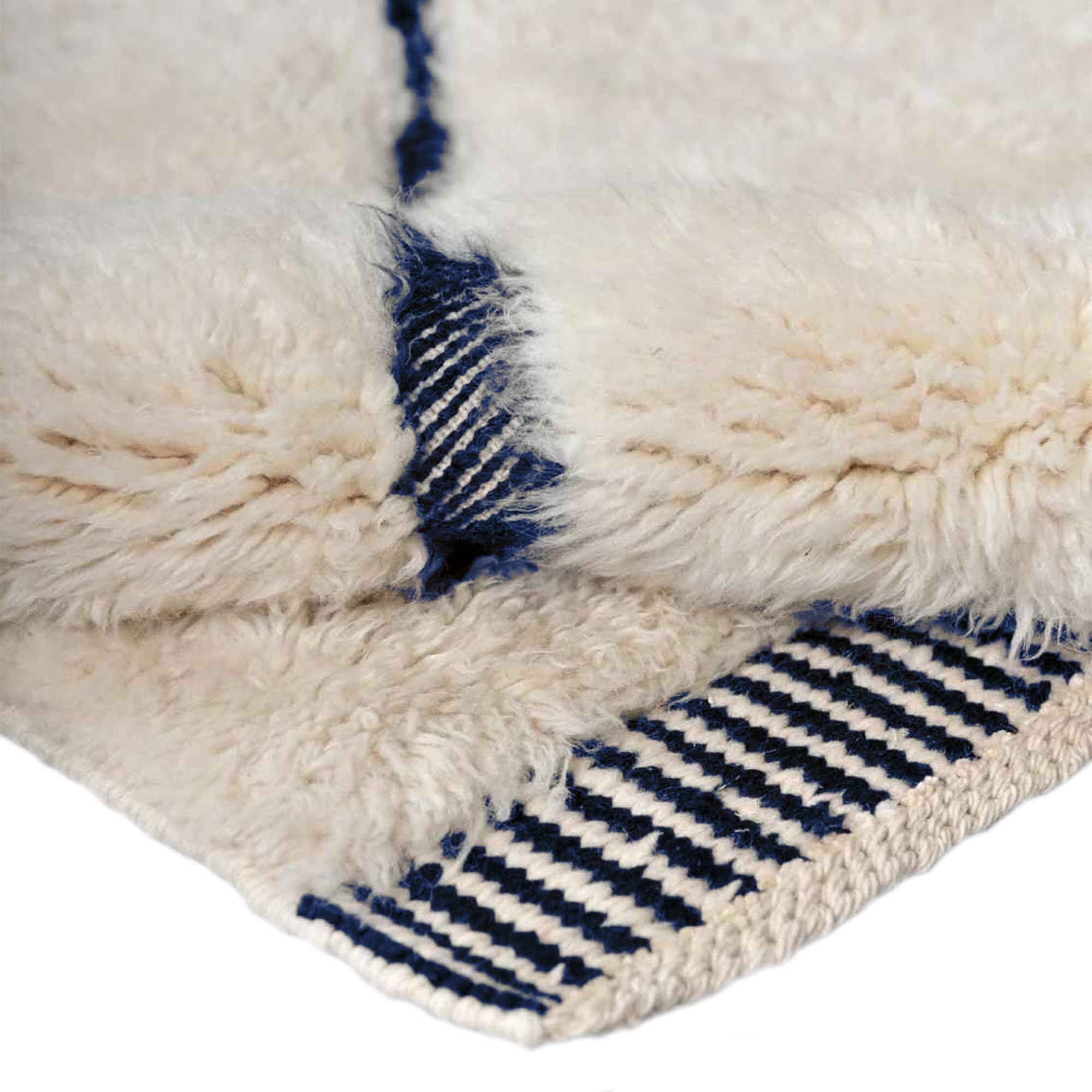 Designed to anchor a space without overpowering it, this Berber rug features an ivory/cream wool field with bold navy blue abstract lines and a crisp striped border. The pattern reads like minimalist tribal calligraphy—graphic, balanced, and easy to style. The handwoven wool pile has a soft, cozy texture with visible artisanal character, making it an elevated area rug for modern farmhouse, Scandinavian, boho, or contemporary interiors. Use it as a statement living room rug or a calming bedroom rug that still has personality.