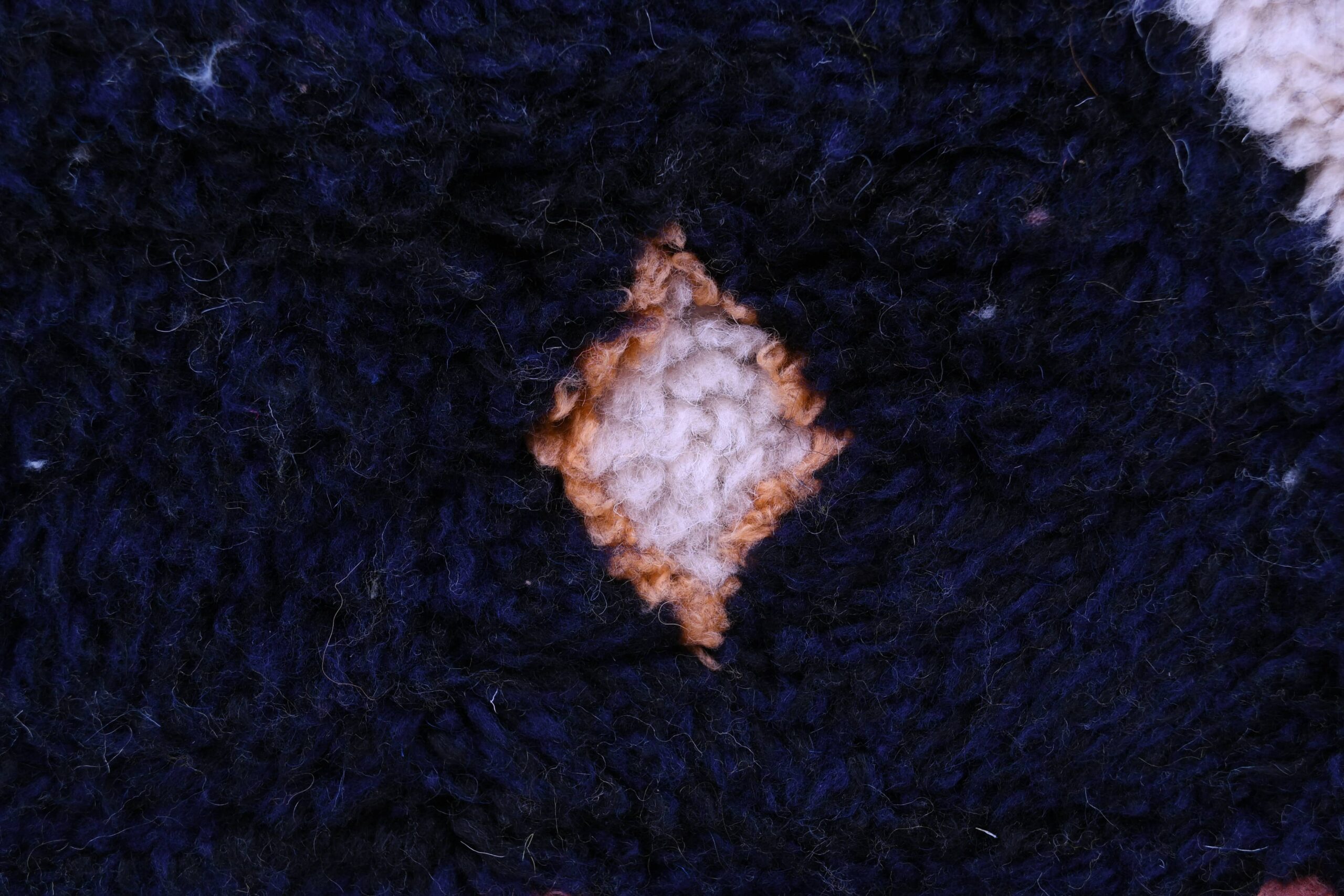 色彩豊かなウールラグ:深みのあるネイビー/インクブルーに、サンシャインイエロー、スカイブルー、クリーム/アイボリー、フォレストグリーン、そして温かみのあるテラコッタのアクセントが絶妙に調和したこのウールラグは、モダンなアブストラクト/モダントライバルを思わせるデザイン。伝統的な雰囲気ではなく、現代的なモロッコ風エリアラグをお探しの方にぴったりです。重層的なテクスチャーでボヘミアン風にアレンジしたり、ミニマルな空間にアクセントとして一枚で存在感を放つアイテムとして取り入れたりと、様々なスタイルにマッチします。スカンジナビア、ミッドセンチュリーモダン、モダンファームハウス、そして海岸沿いのボヘミアンスタイルのインテリアによく合います。
