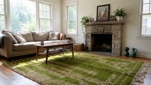 The color is a true olive/forest green with warm ivory-beige detailing—perfect if you’re looking for a green area rug that still reads “neutral” in a room. The pattern feels modern and minimalist with a subtle tribal influence, making it easy to style with Scandinavian-inspired interiors, mid-century modern furniture, or modern farmhouse decor. As a soft wool rug with a plush feel underfoot, it’s ideal for everyday lounging, movie nights, and cozy mornings.
