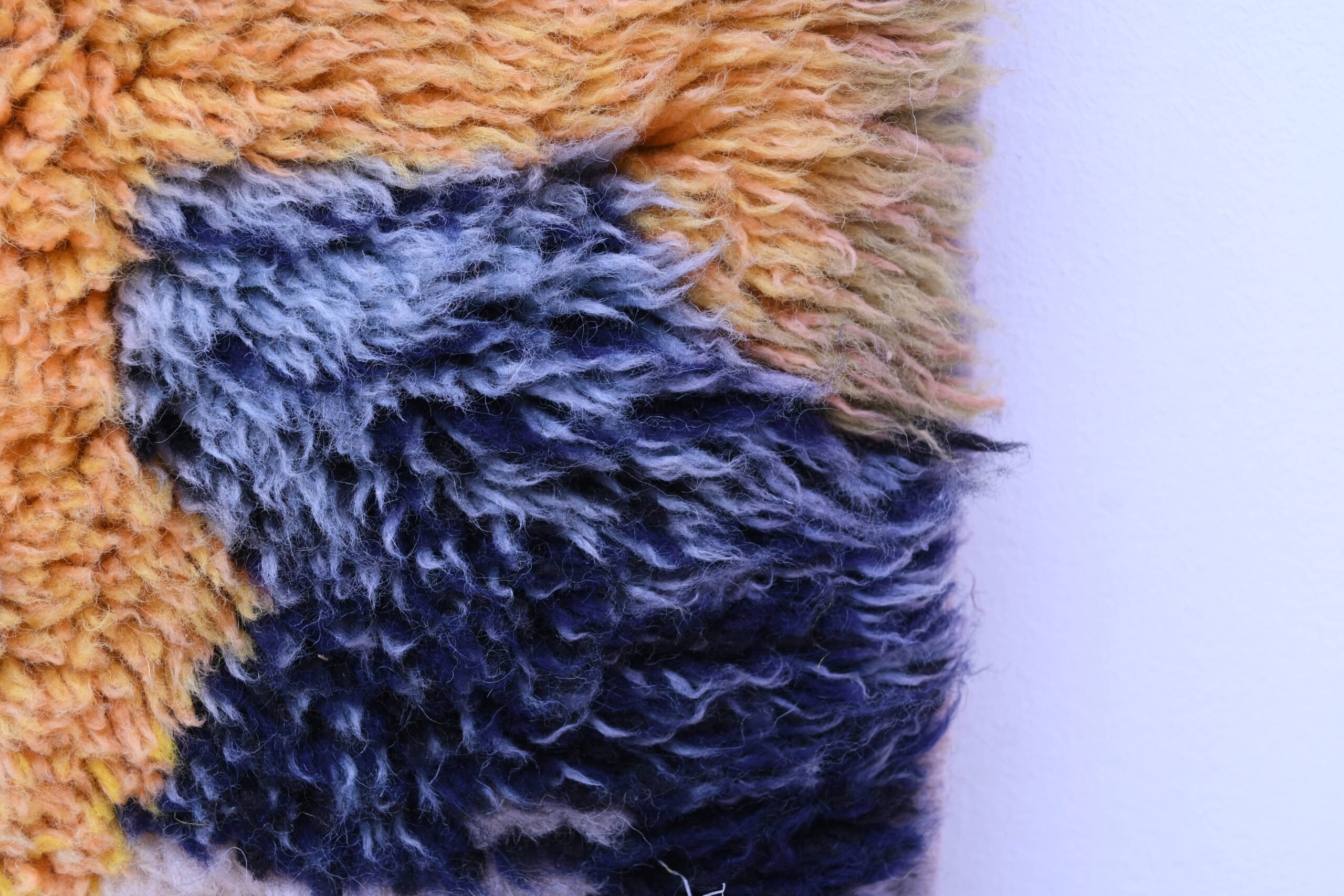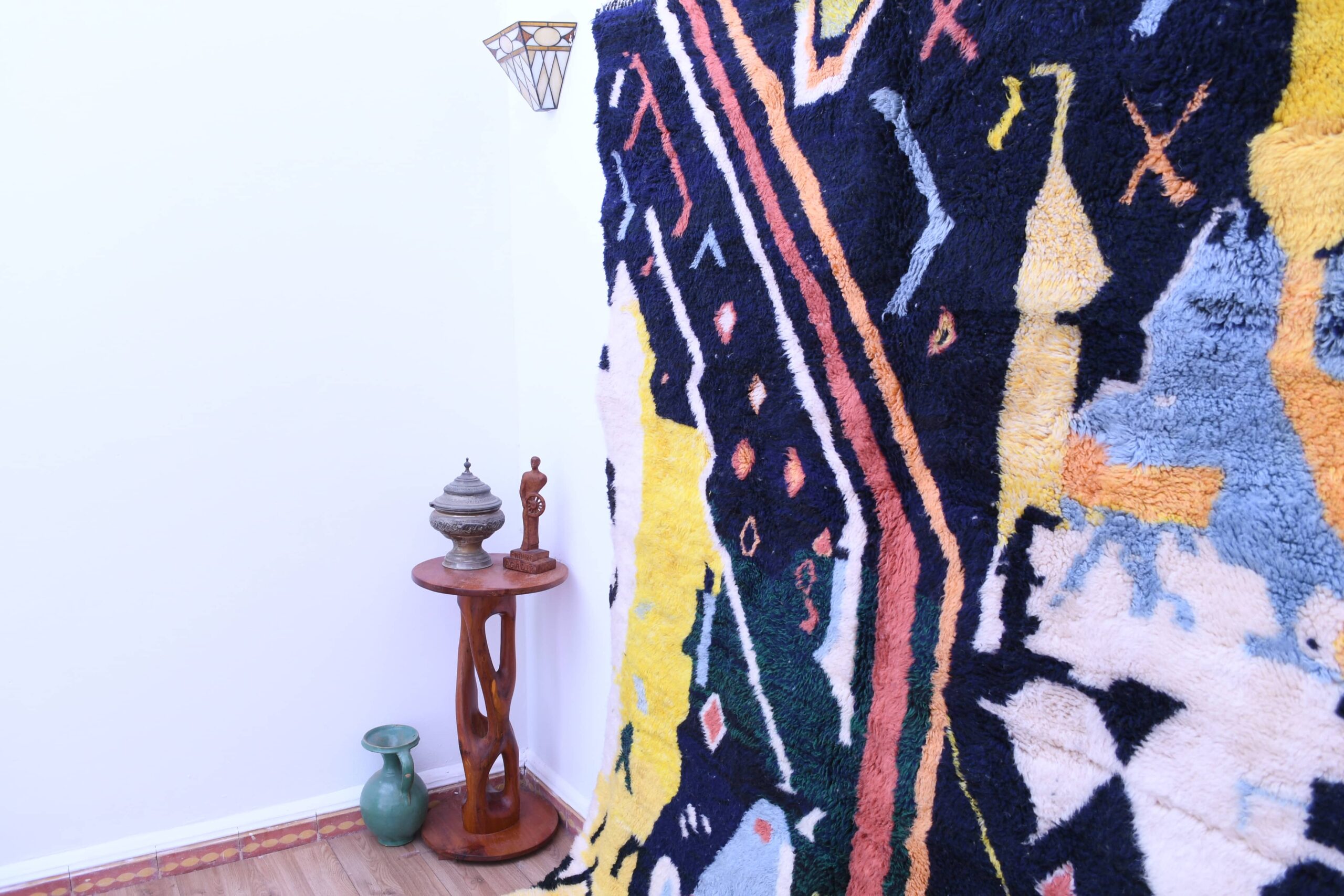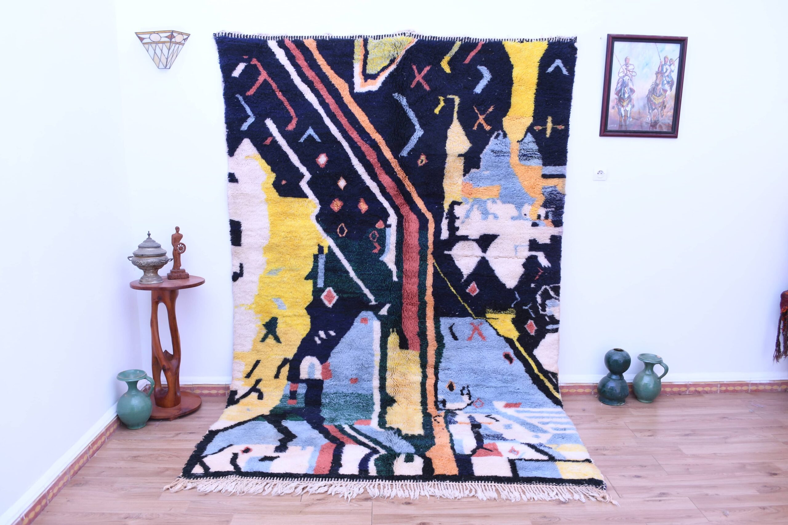 Ковёр выполнен в яркой цветовой палитре с глубоким тёмно-синим, тёплым жёлтым, мягким голубым и землистыми тонами. Эти цвета гармонично сочетаются друг с другом, придавая ковру глубину и индивидуальность, а также обеспечивая универсальность для сочетания с различными стилями интерьера.