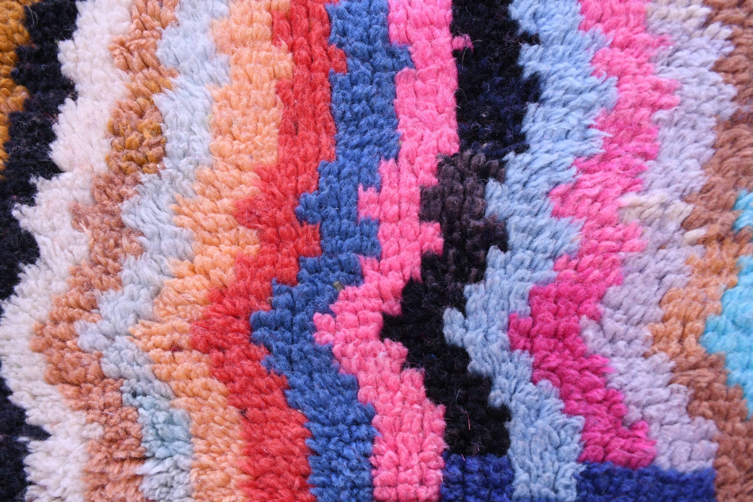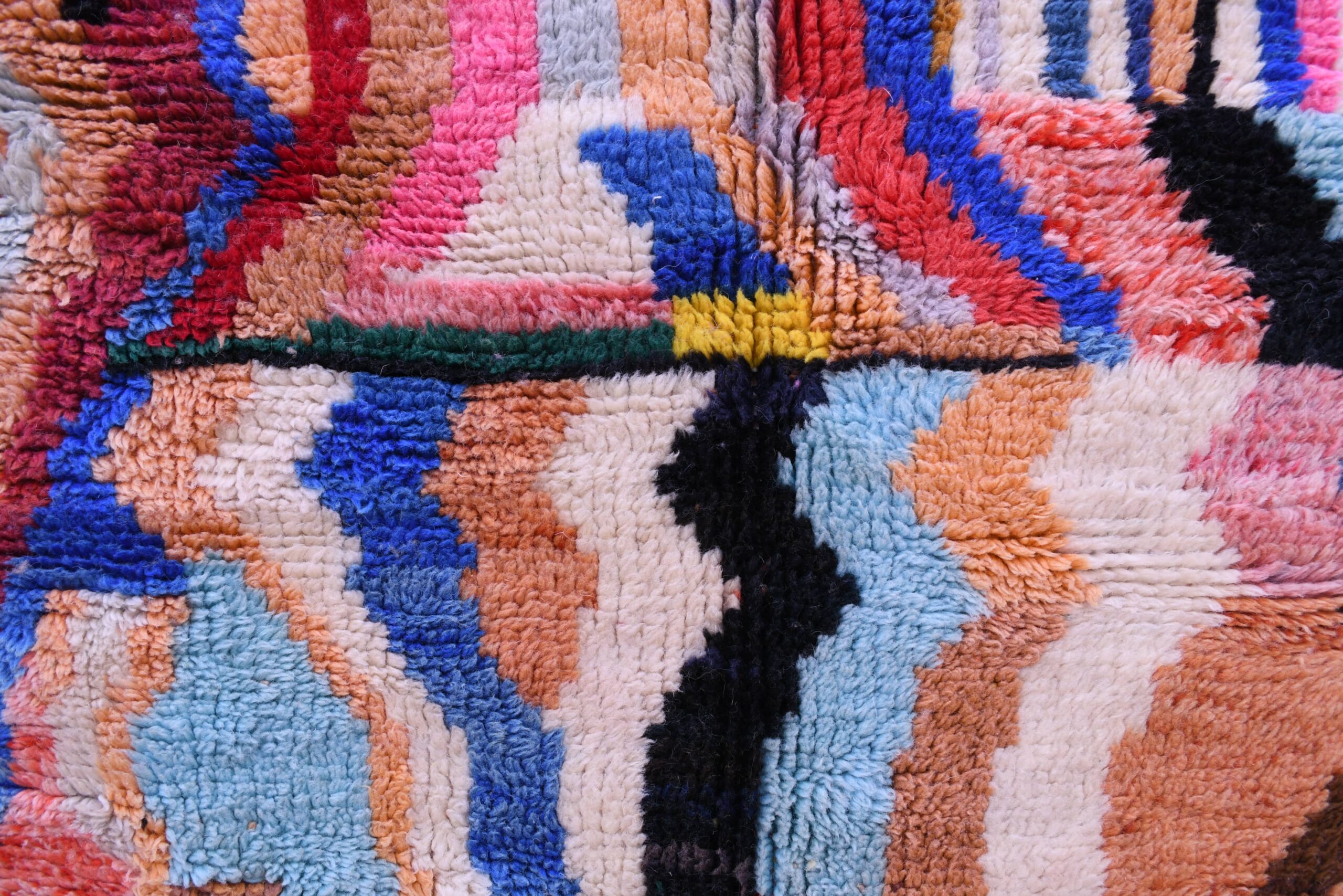 This stunning Mrirt rug showcases an intricate design that blends traditional Moroccan motifs with a contemporary flair. The rug features an abstract pattern, characterized by bold geometric shapes and dynamic zigzag lines, offering a visual feast for the senses.