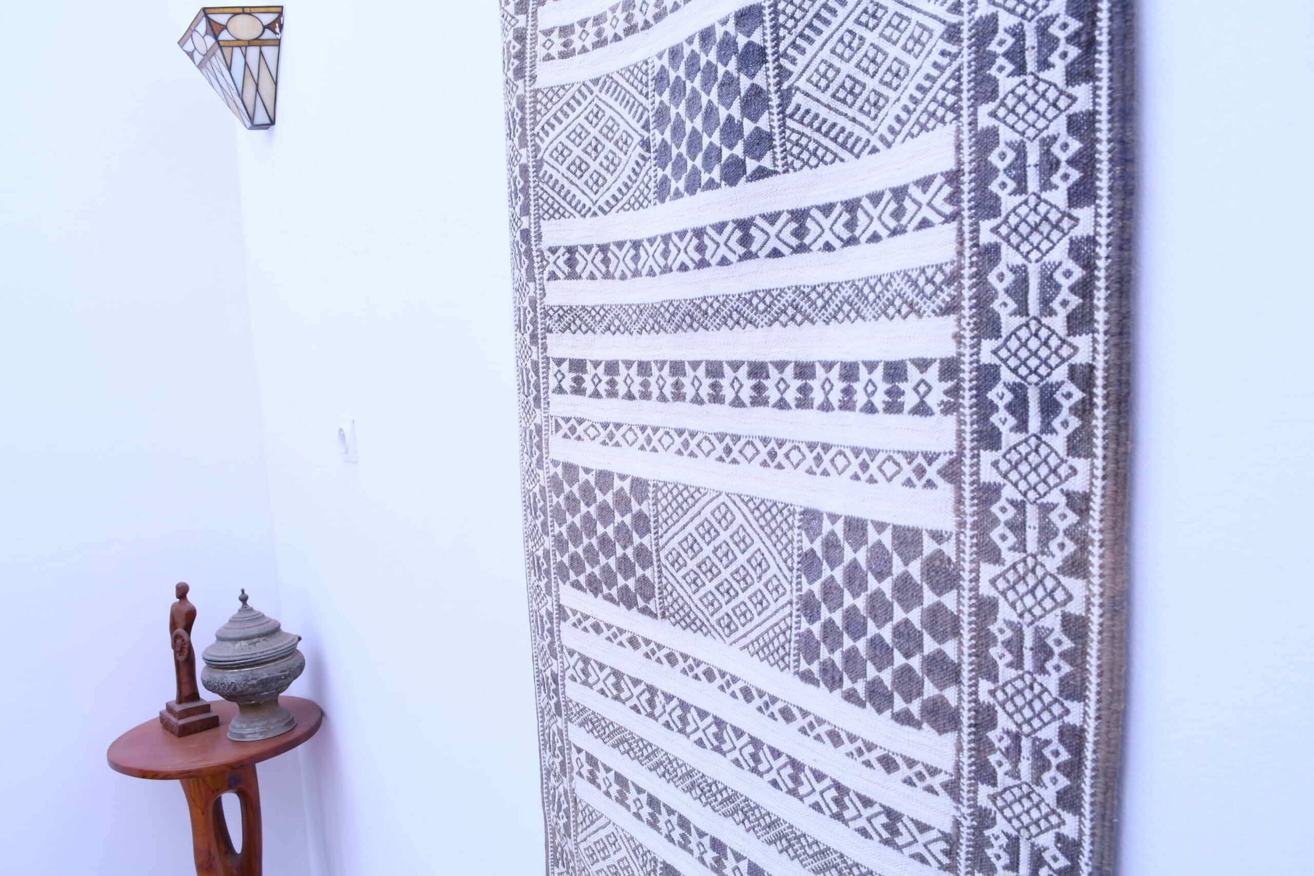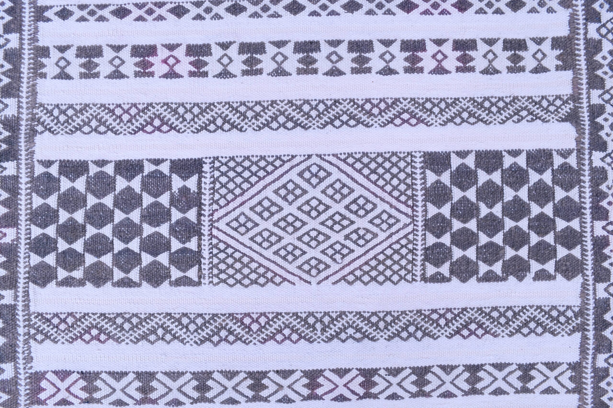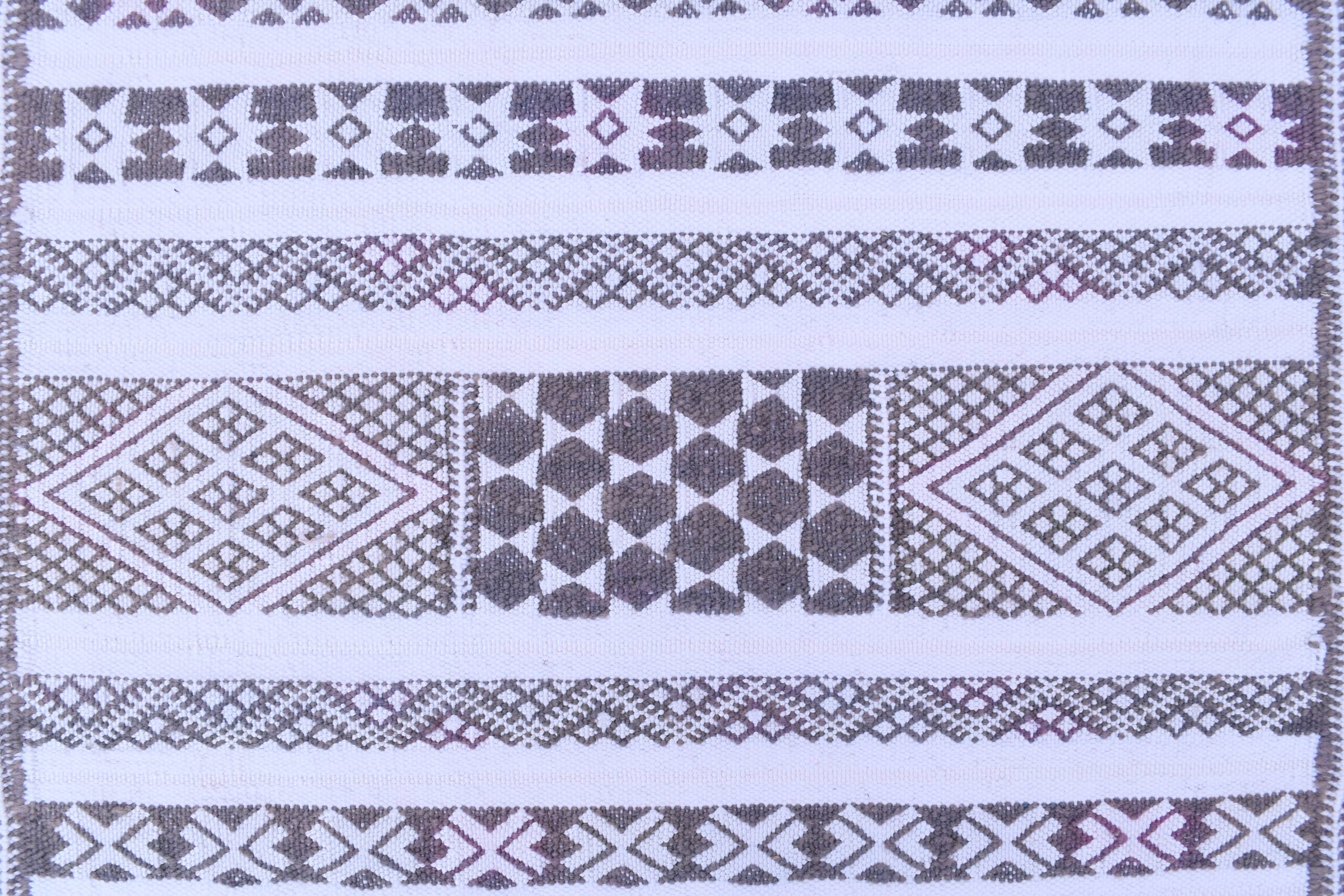 Этот ковёр «Тифлет Килим» размером 74,00 × 370,00 см украшен сложным набором геометрических узоров и традиционных мотивов, характерных для марокканского дизайна. Эффектное сочетание ромбов и линейных узоров придаёт ковру нотку культурной аутентичности и элегантности.