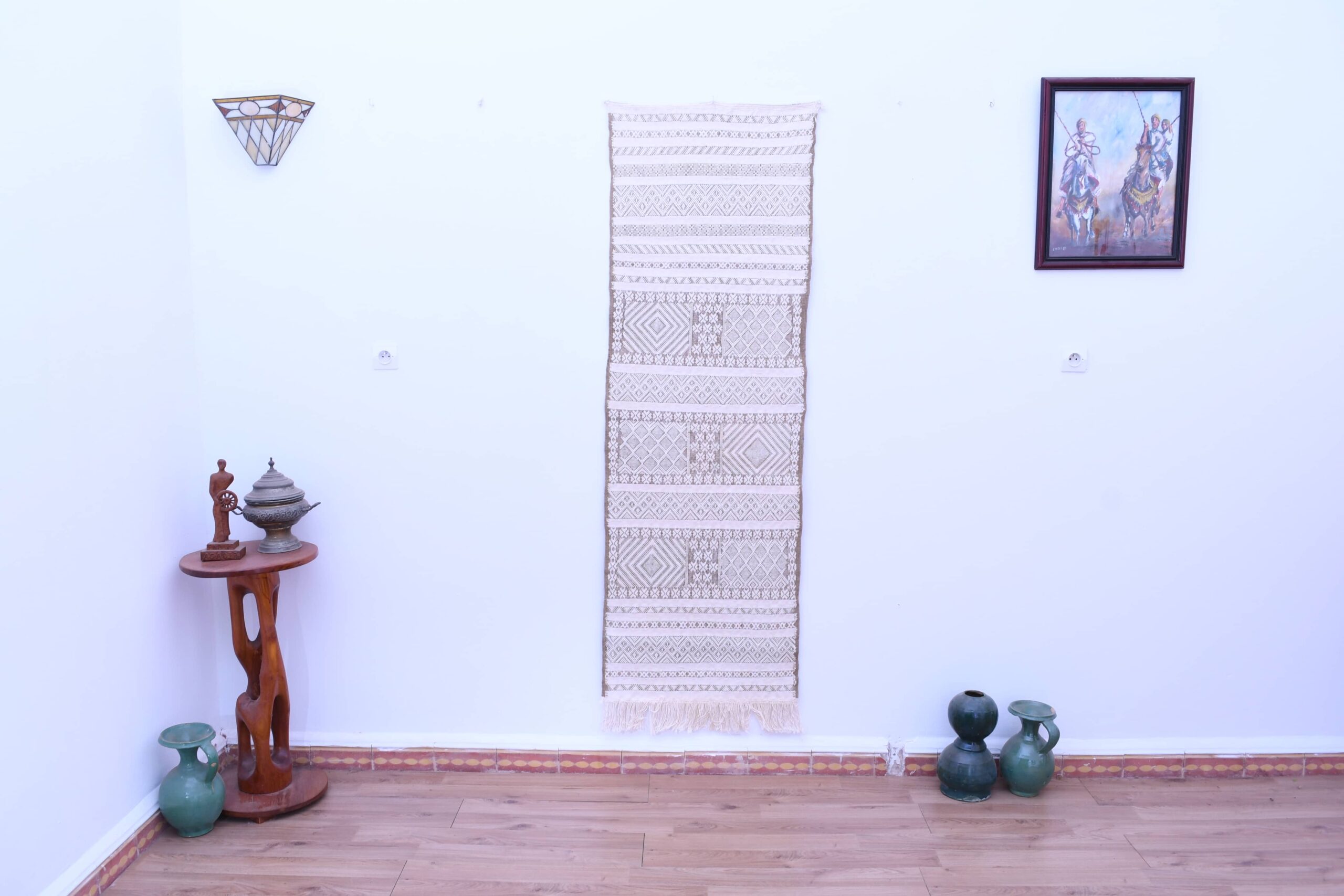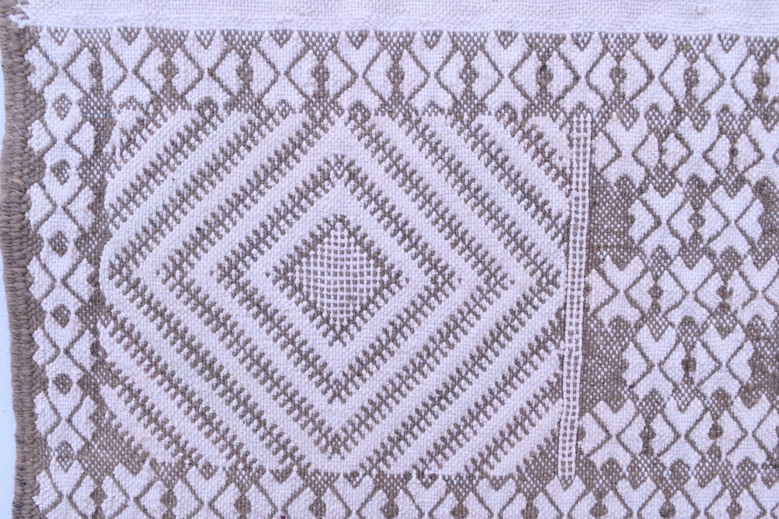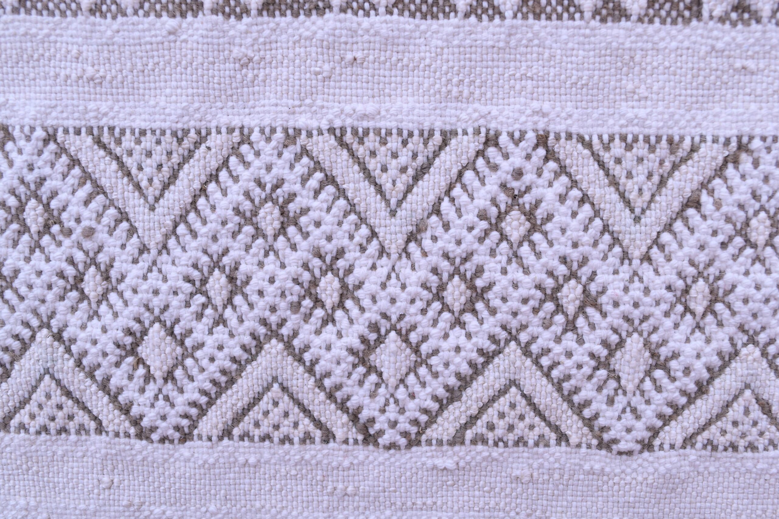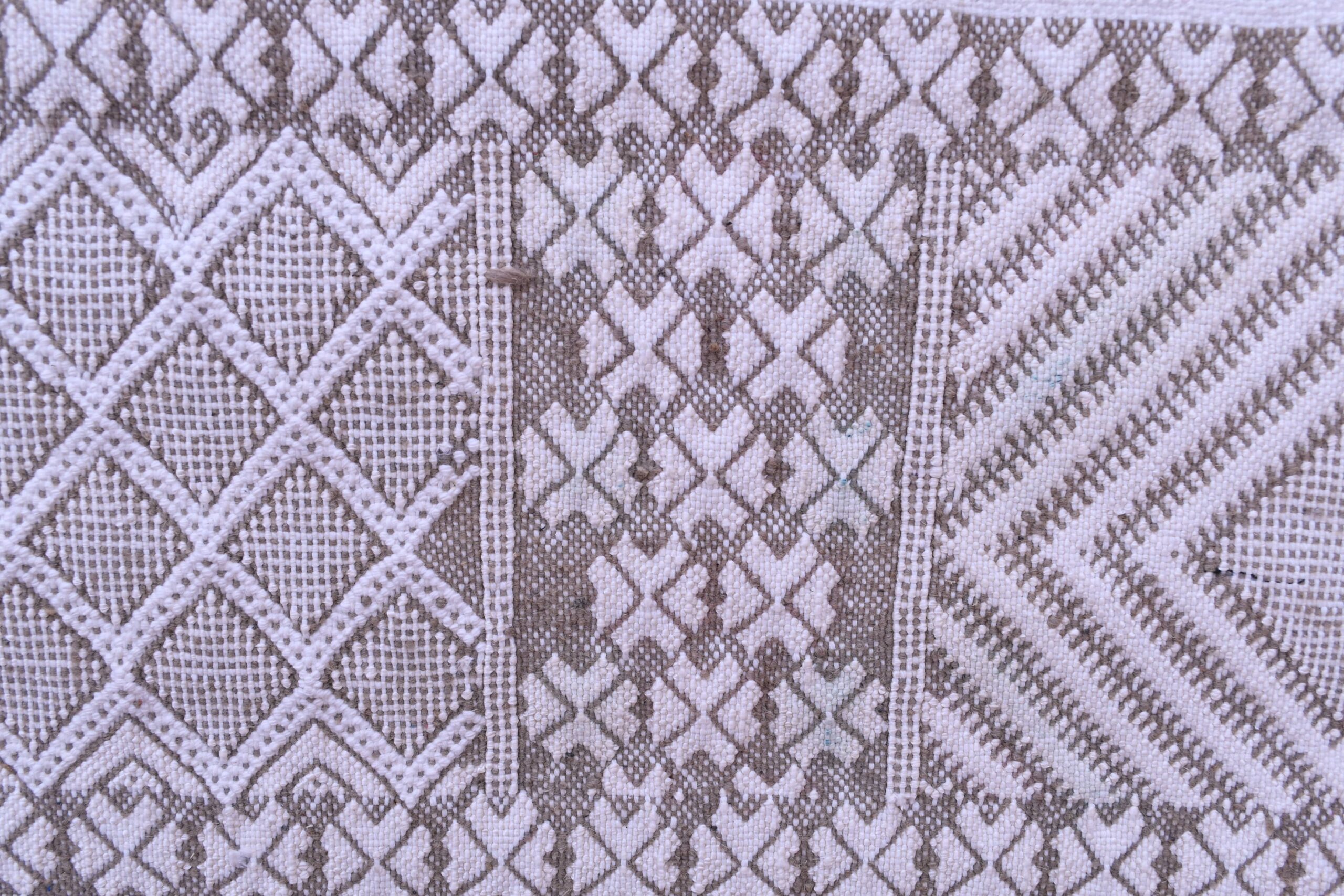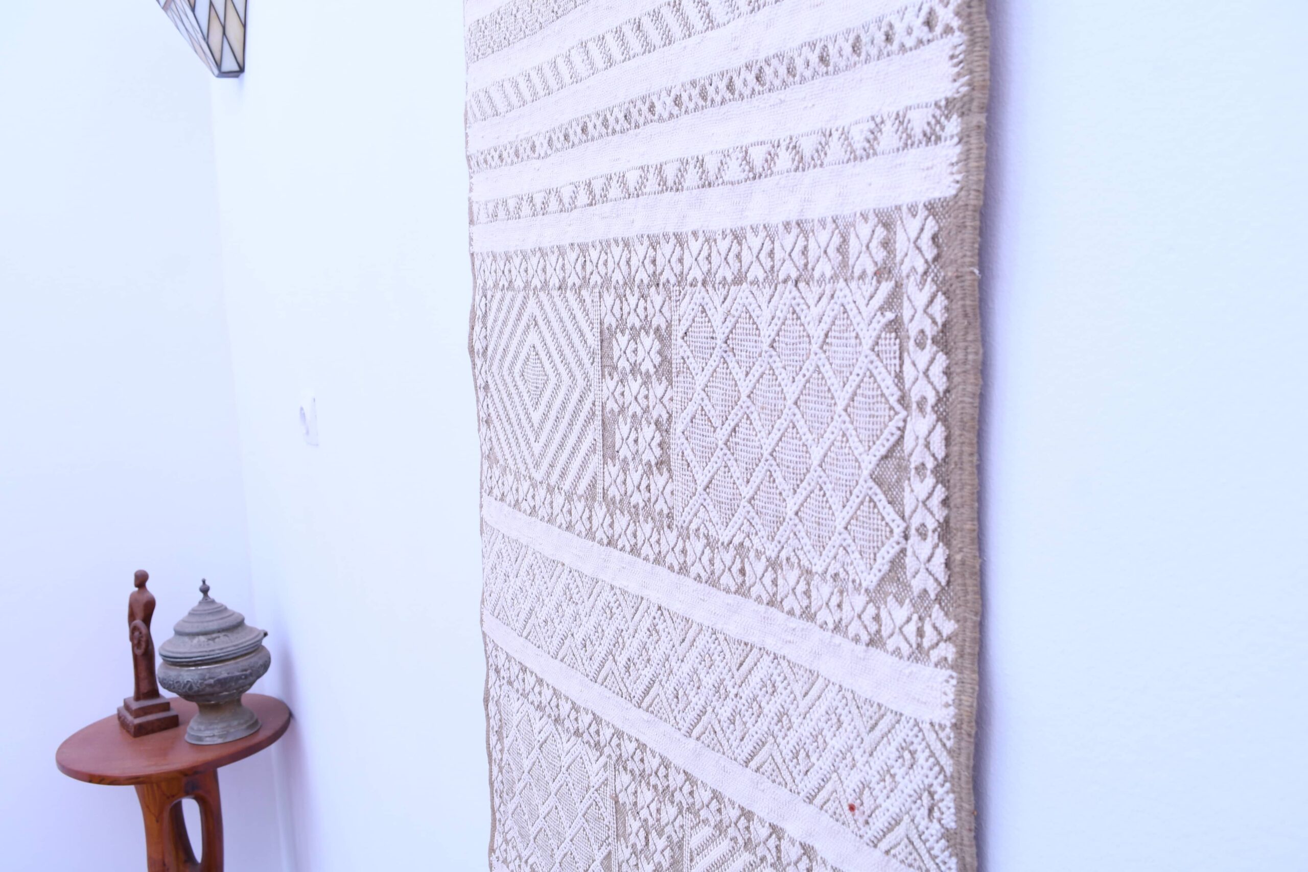 Этот ковёр Тифлет Килим демонстрирует впечатляющее разнообразие традиционных марокканских мотивов, искусно сотканных для создания гармоничного сочетания геометрических узоров. Замысловатые узоры свидетельствуют о богатом культурном наследии и мастерстве марокканских мастеров.