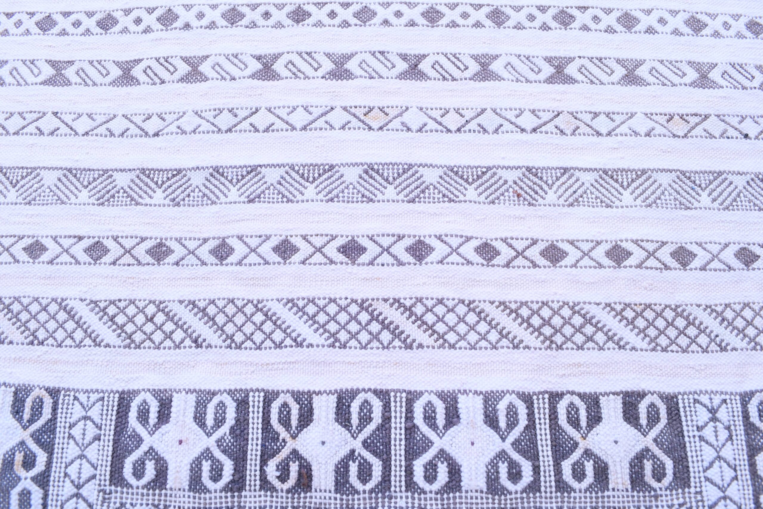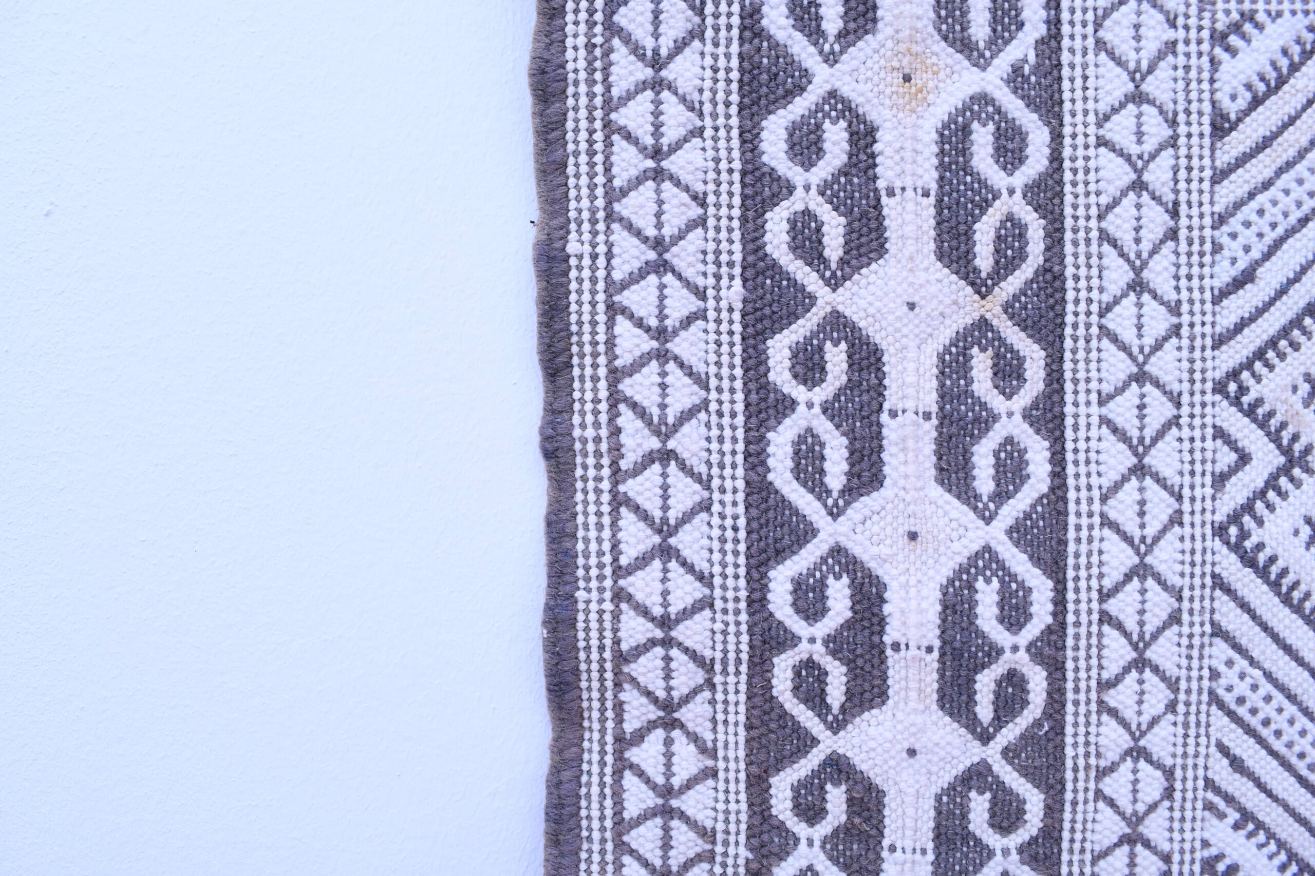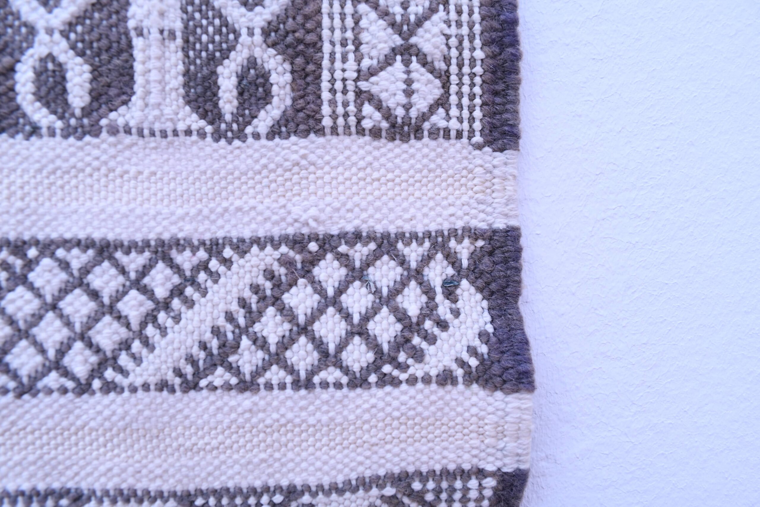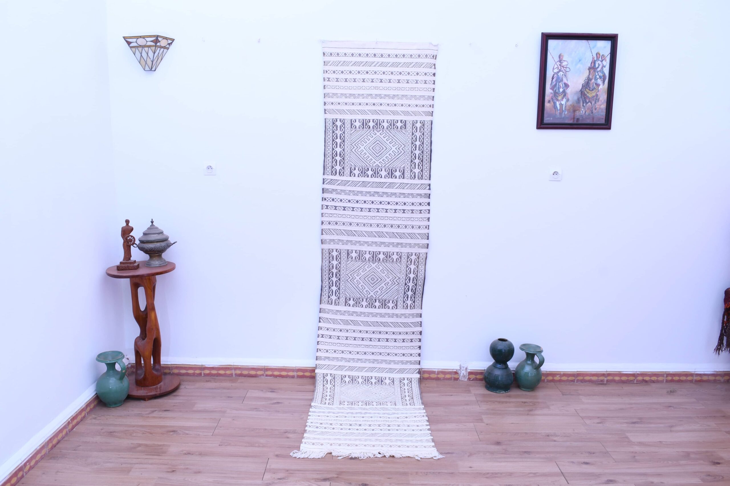 Откройте для себя элегантность этого марокканского ковра-килима «тифлет» размером 65 × 290 см, сотканного вручную из шерсти. Его замысловатые узоры и нейтральные тона украсят любой интерьер.