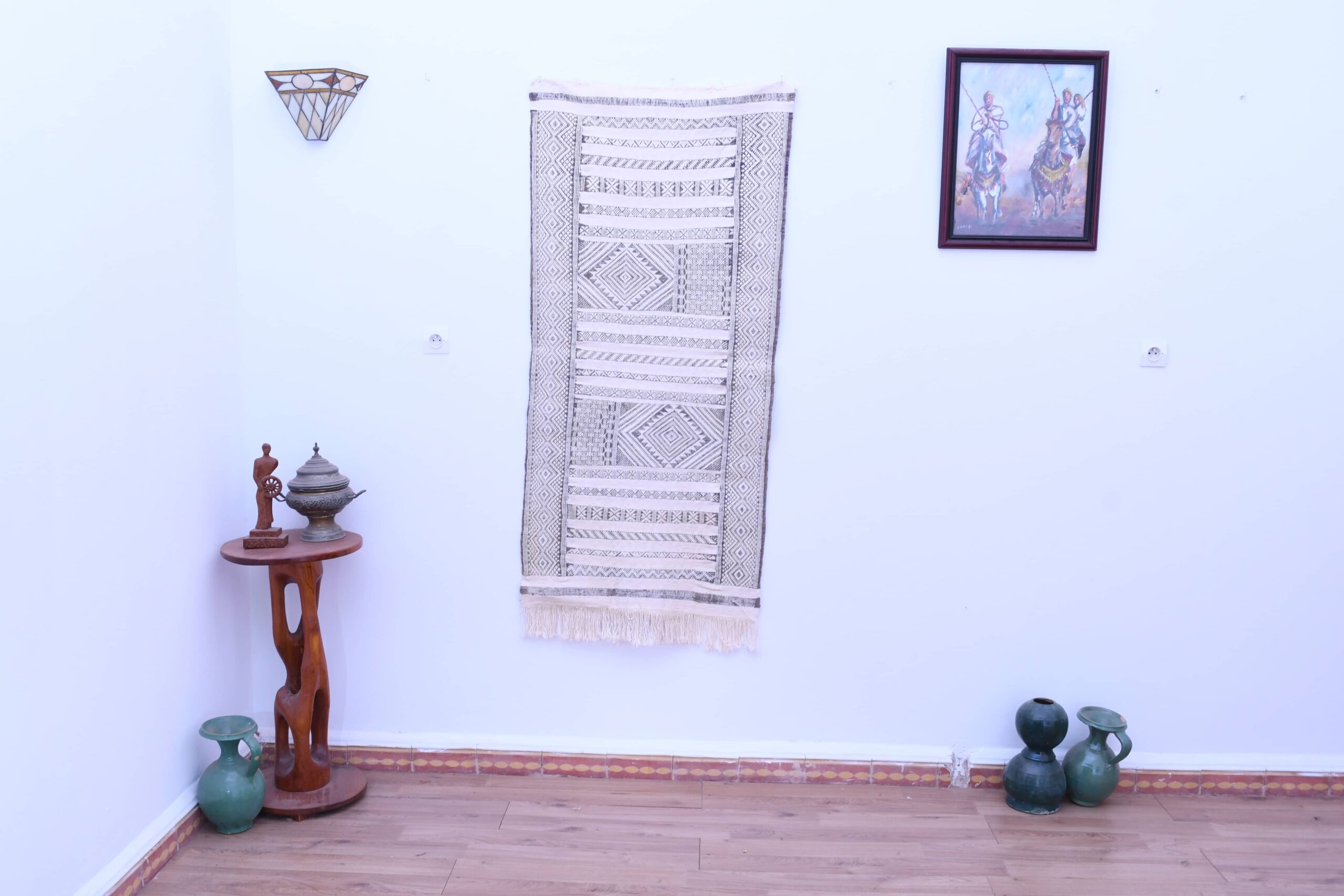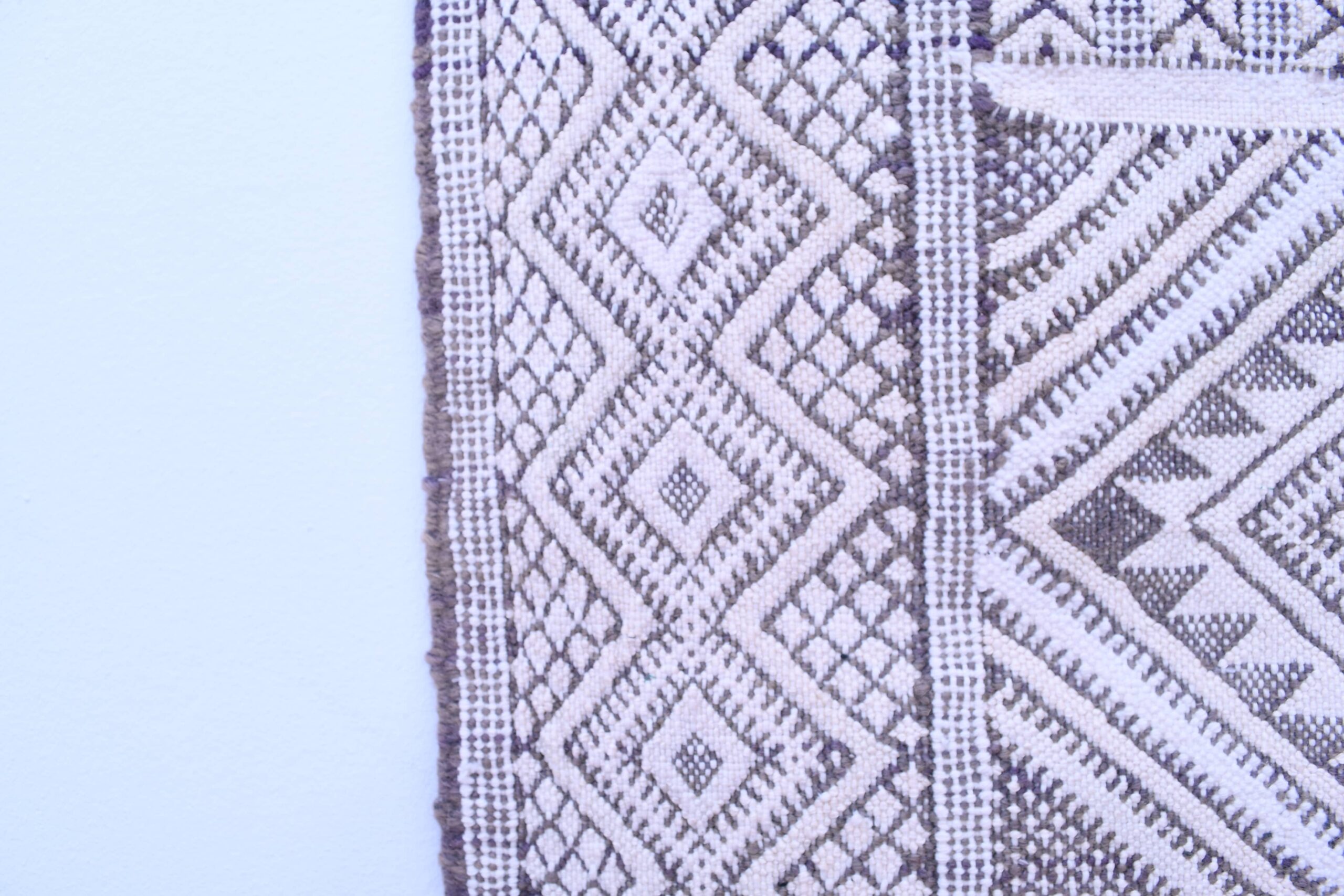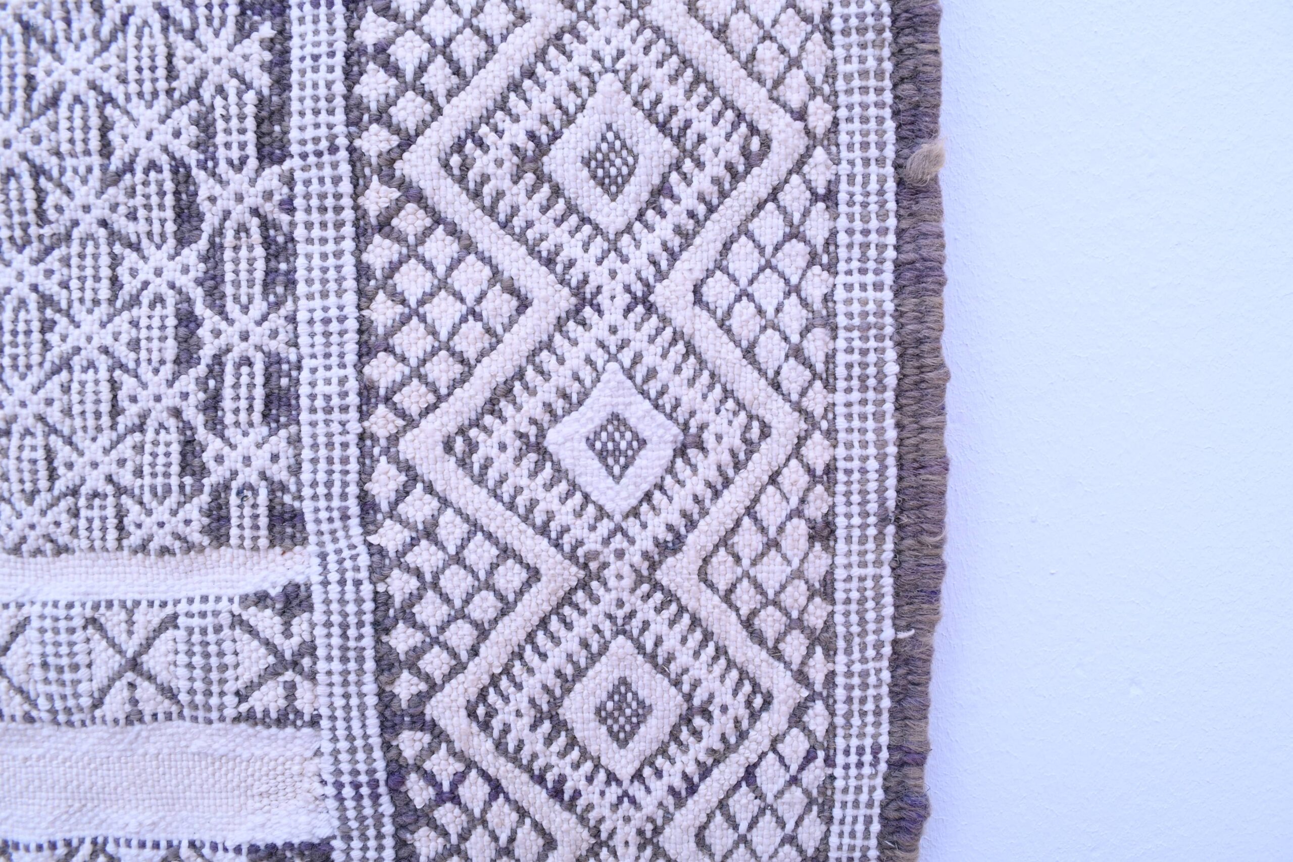 With its refined design and neutral colors, this Tiflet Kilim rug is perfect for enhancing the decor of living rooms, bedrooms, or entryways. Its size makes it an ideal choice for adding a touch of sophistication to smaller spaces or as a complementary piece in larger rooms. Pair it with wooden furniture and earthy tones to create a warm, inviting atmosphere.