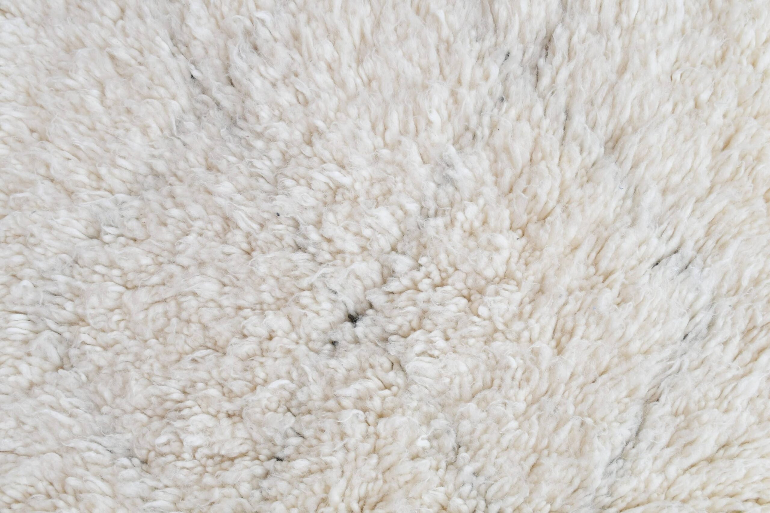 The color palette is true “neutral rug” perfection: warm ivory/cream wool with tiny black/charcoal accents that read classic black-and-white from a distance—easy to style and never overwhelming. The look is minimalist, boho, and Scandinavian-friendly, making it a great bedroom rug, nursery rug, or layered area rug in a modern farmhouse or coastal boho space. The wool pile is soft and fluffy, giving that comfortable, sink-in feel you want from a real Moroccan wool rug.