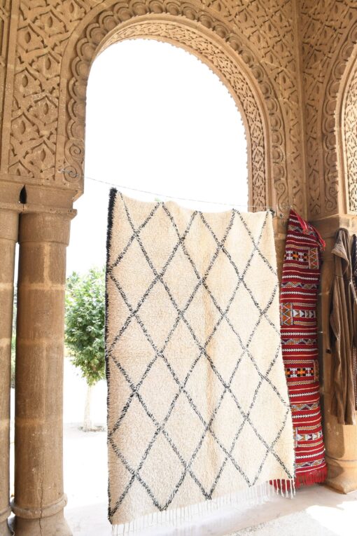The look is clean and elevated: soft ivory wool with simple black lines in a diamond grid (the iconic “black and white Moroccan rug” style many American buyers search for). The plush texture makes it comfortable underfoot and adds depth to neutral rooms. Use it as a living room rug with a linen sofa and wood tones, or as a bedroom area rug to soften hardwood floors. This wool rug layers beautifully with modern farmhouse, mid-century modern, coastal boho, and minimalist decor.