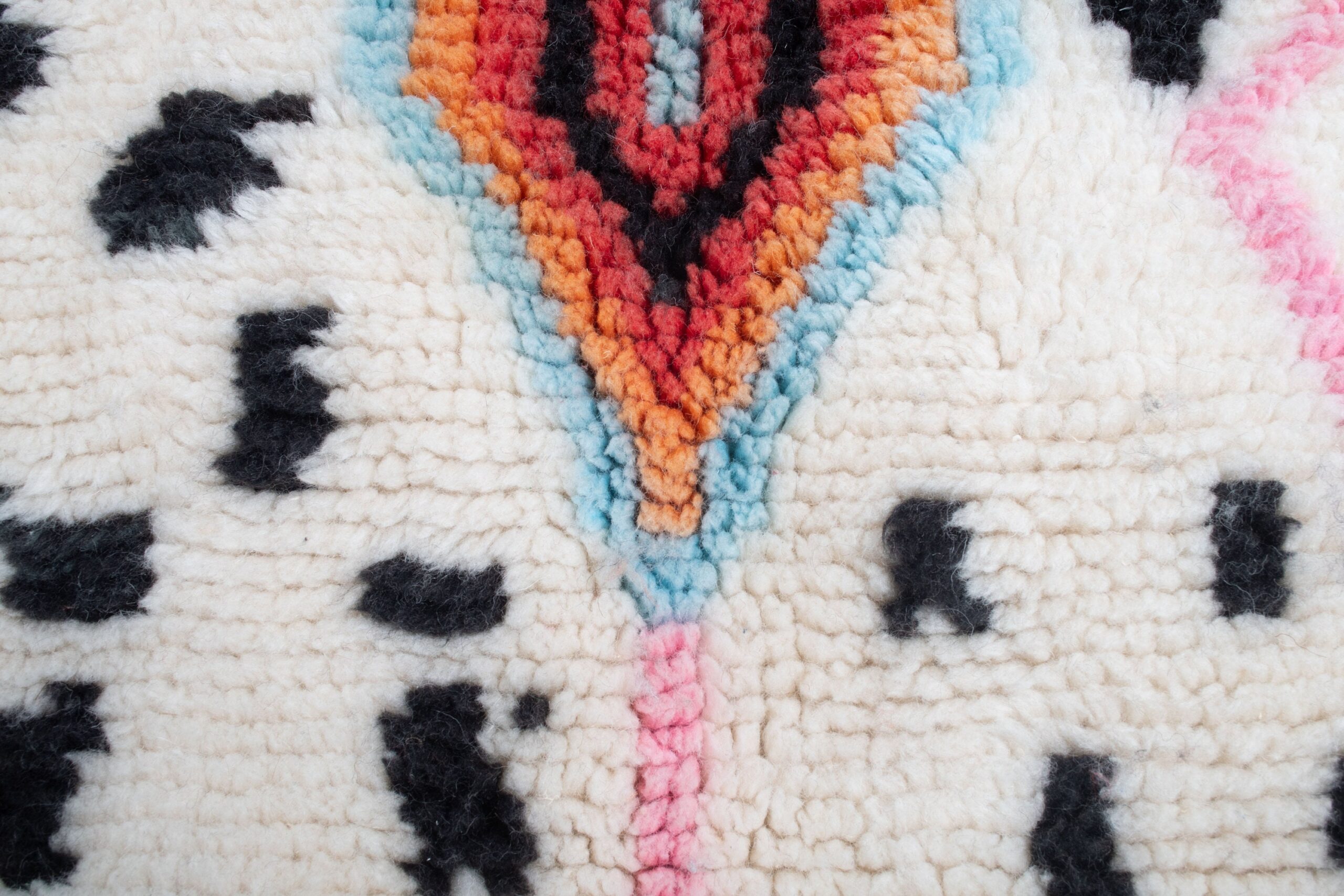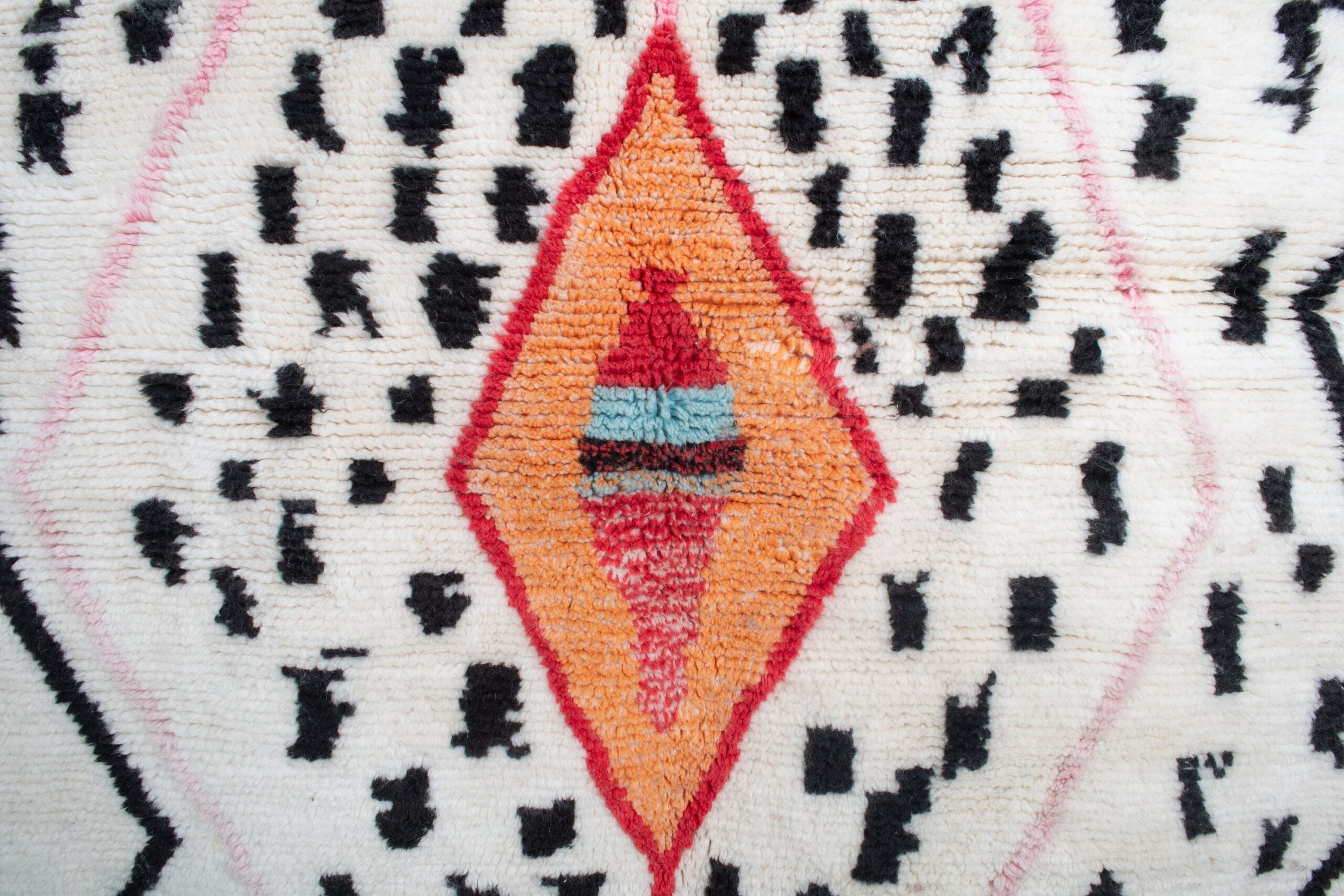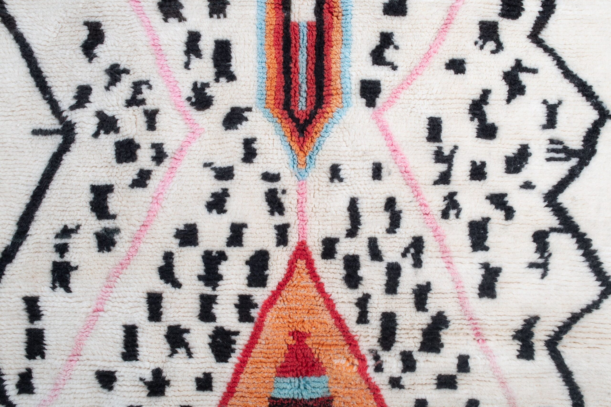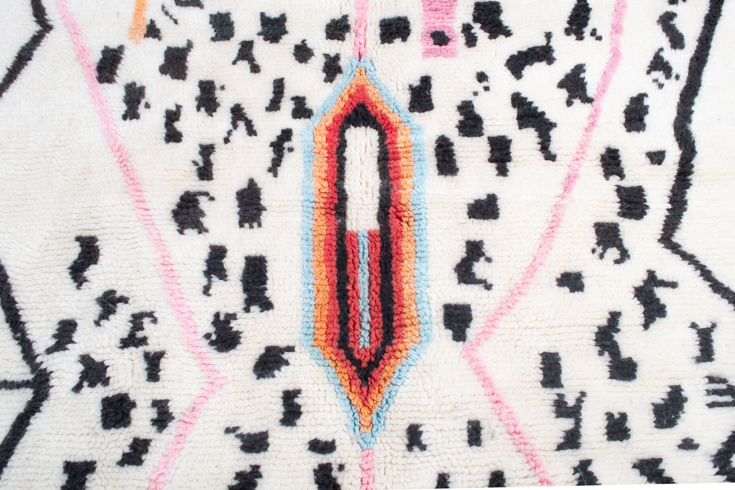 This handwoven Berber rug features a creamy white field scattered with charcoal-black marks, framed by bold black zigzag edges. Soft blush-pink lines create a large X across the rug, guiding the eye to the central tribal medallions: a warm orange diamond with red and turquoise details, plus a smaller sky-blue and black diamond near the top. The wool pile looks plush with a cozy, textured touch, finished with traditional fringe. It’s a statement boho rug that also works beautifully in minimalist, Scandinavian, and modern farmhouse spaces.