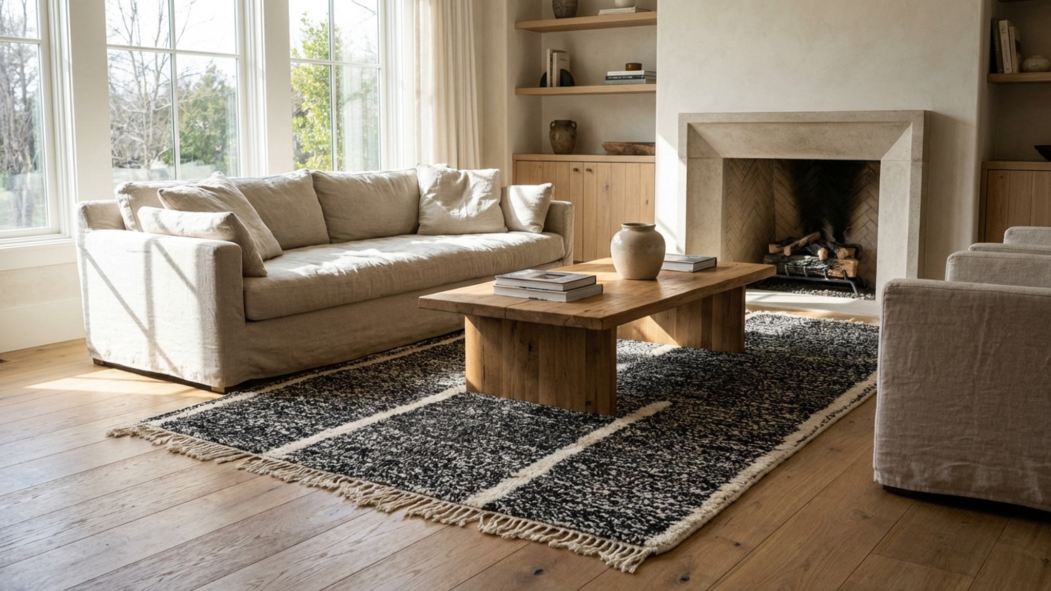 This authentic handmade Moroccan rug is a modern black and white wool rug designed for real life—soft underfoot, durable, and easy to style. This Moroccan rug works beautifully as a living room rug under a sofa and coffee table, or as a cozy bedroom area rug that warms up wood floors. Handwoven by 3rd generation Berber artisans and fair trade certified, it brings high-end texture and a clean, minimalist look to your home.