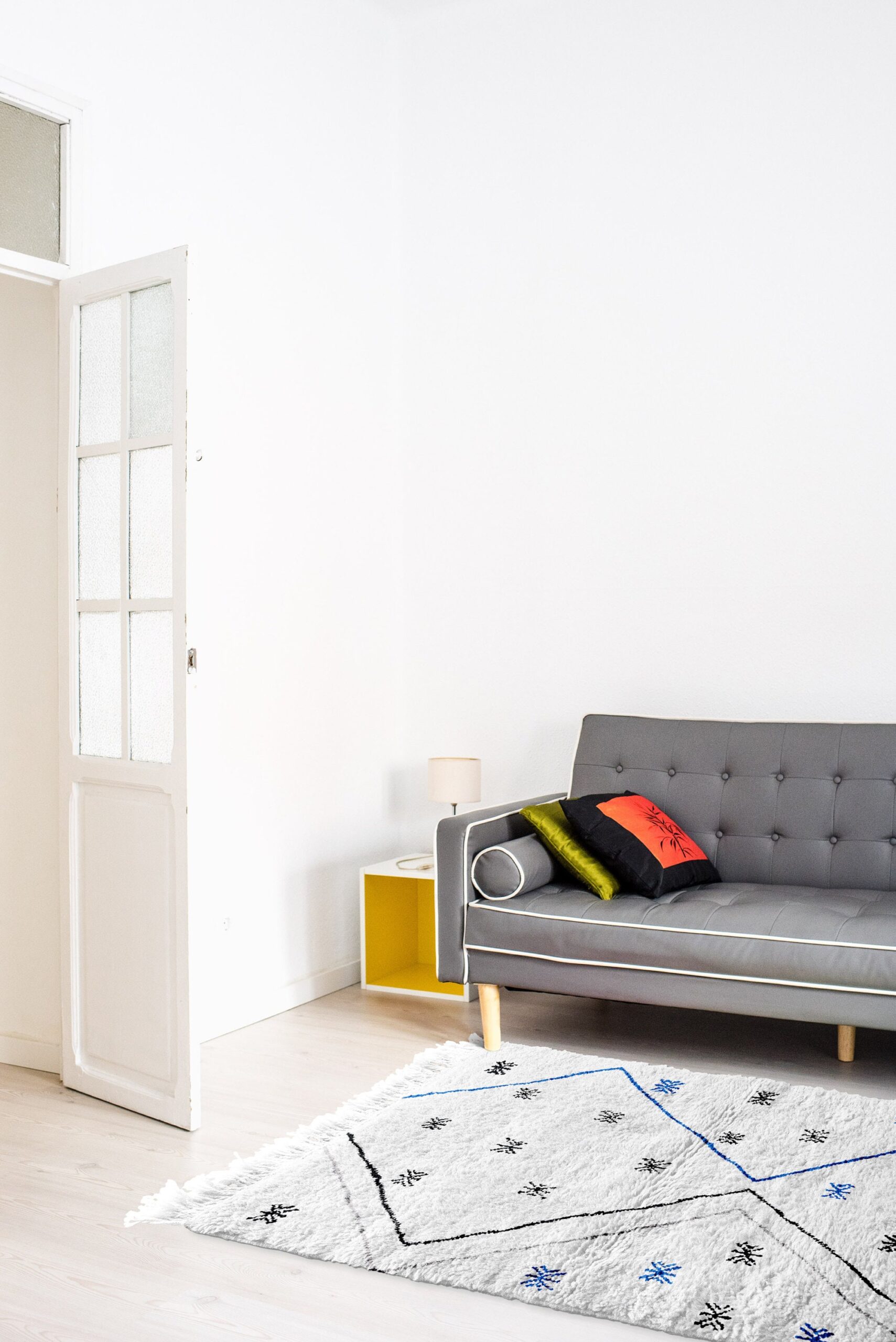 The color palette is buyer-friendly and versatile: creamy ivory wool with modern accents in black and cobalt/royal blue. The pattern feels minimalist and Scandinavian-friendly, while still giving that classic Moroccan rug character. Use it as a living room rug under a sofa and coffee table, or as a bedroom area rug where you want a soft landing every morning. This wool area rug pairs beautifully with modern farmhouse, mid-century modern, coastal boho, and clean neutral interiors.