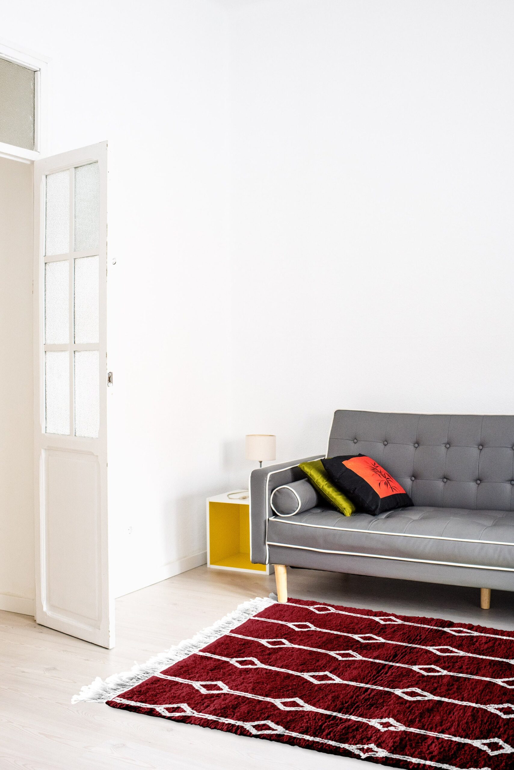 The color reads as deep wine/burgundy red with creamy ivory lines—an elevated take on a classic Moroccan diamond motif. This style works beautifully in boho spaces, modern farmhouse homes, mid-century modern rooms, and even minimalist interiors that need one warm focal point. The handwoven wool pile feels plush and inviting, helping to soften hardwood floors and reduce echo in open living rooms. If you’re styling a neutral sofa or light wood floors, this Moroccan wool rug adds instant contrast and character.