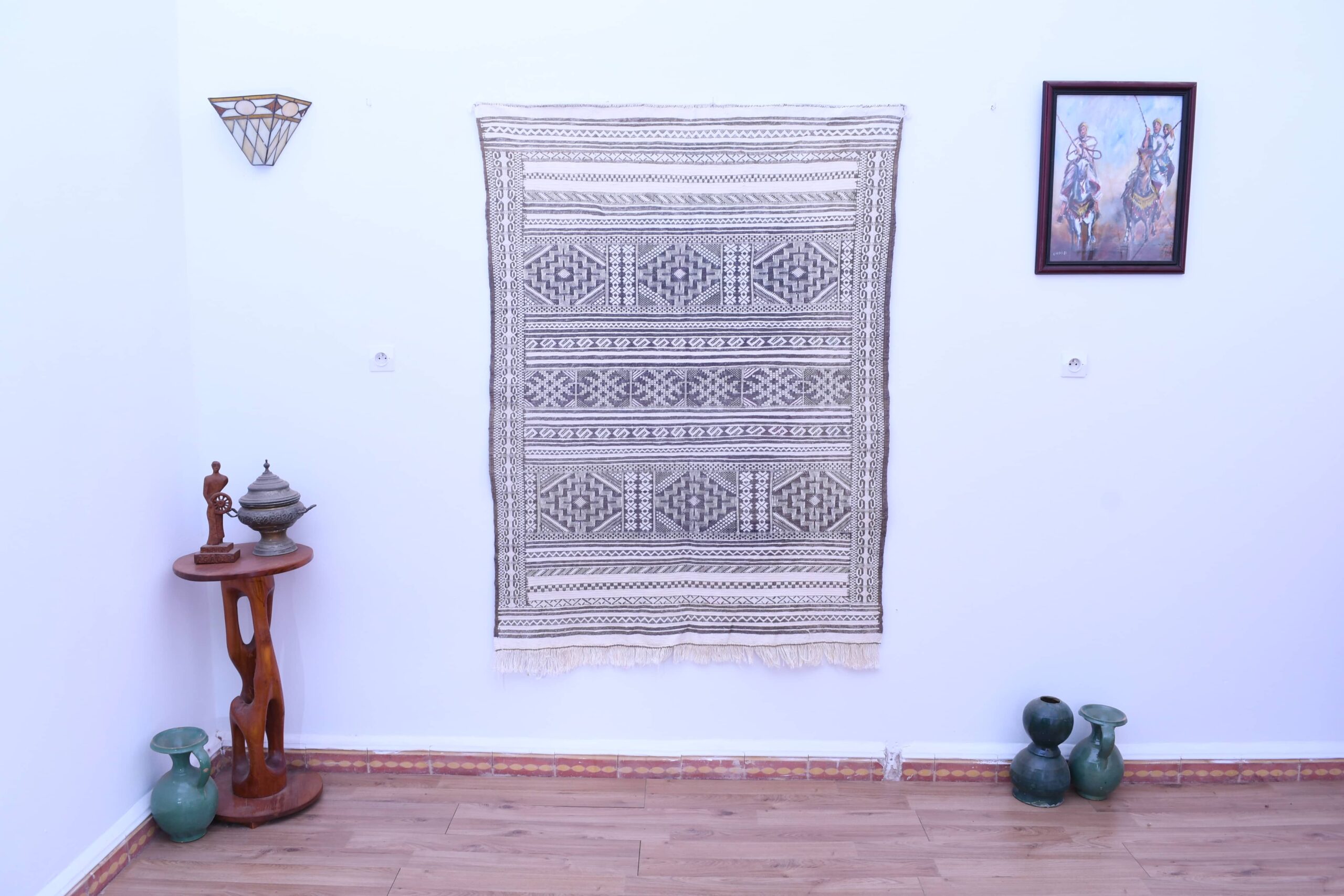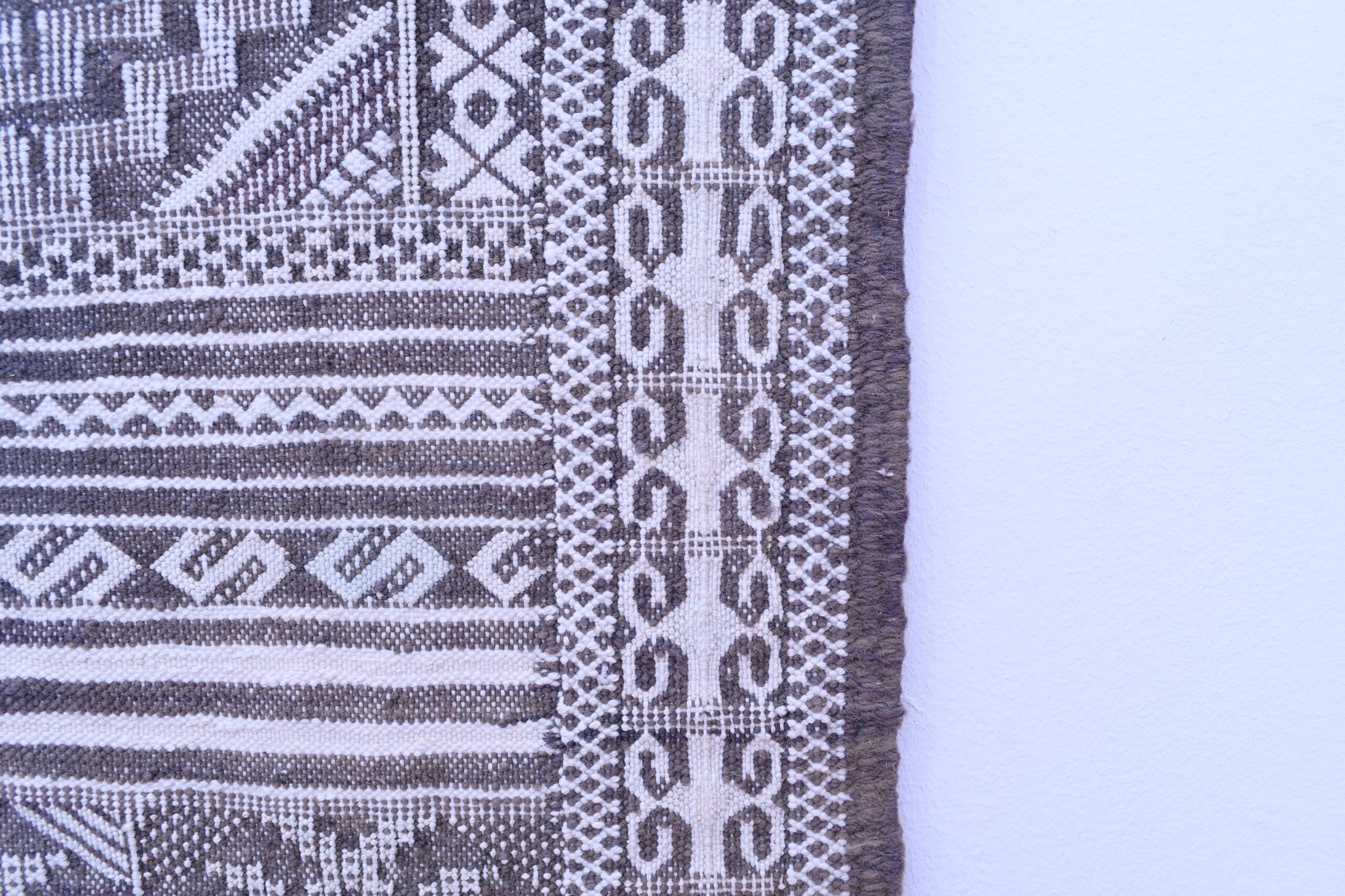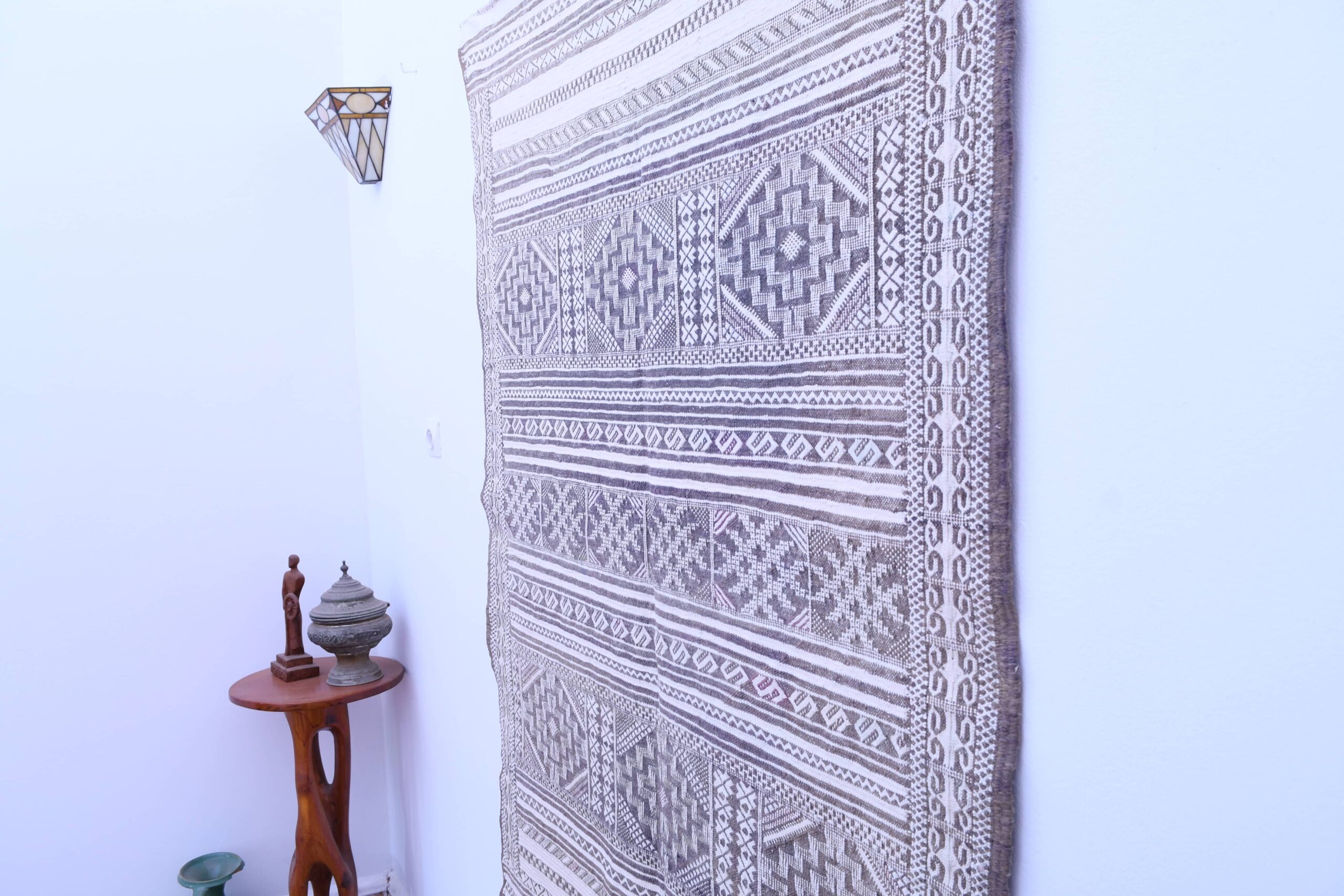 This Tiflet Kilim rug is perfect for enhancing the ambiance of living rooms, bedrooms, or study areas. Its neutral colors and elegant design make it an ideal match for both minimalist and eclectic decor themes. Whether placed under a coffee table or as a wall hanging, this rug adds a touch of Moroccan elegance to any space.