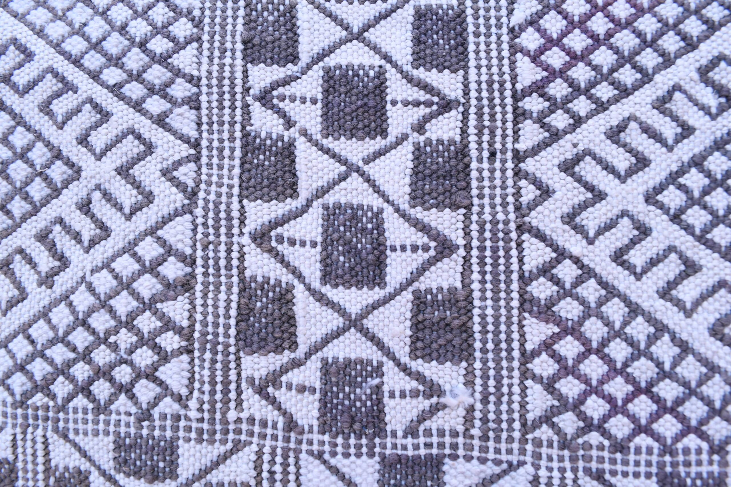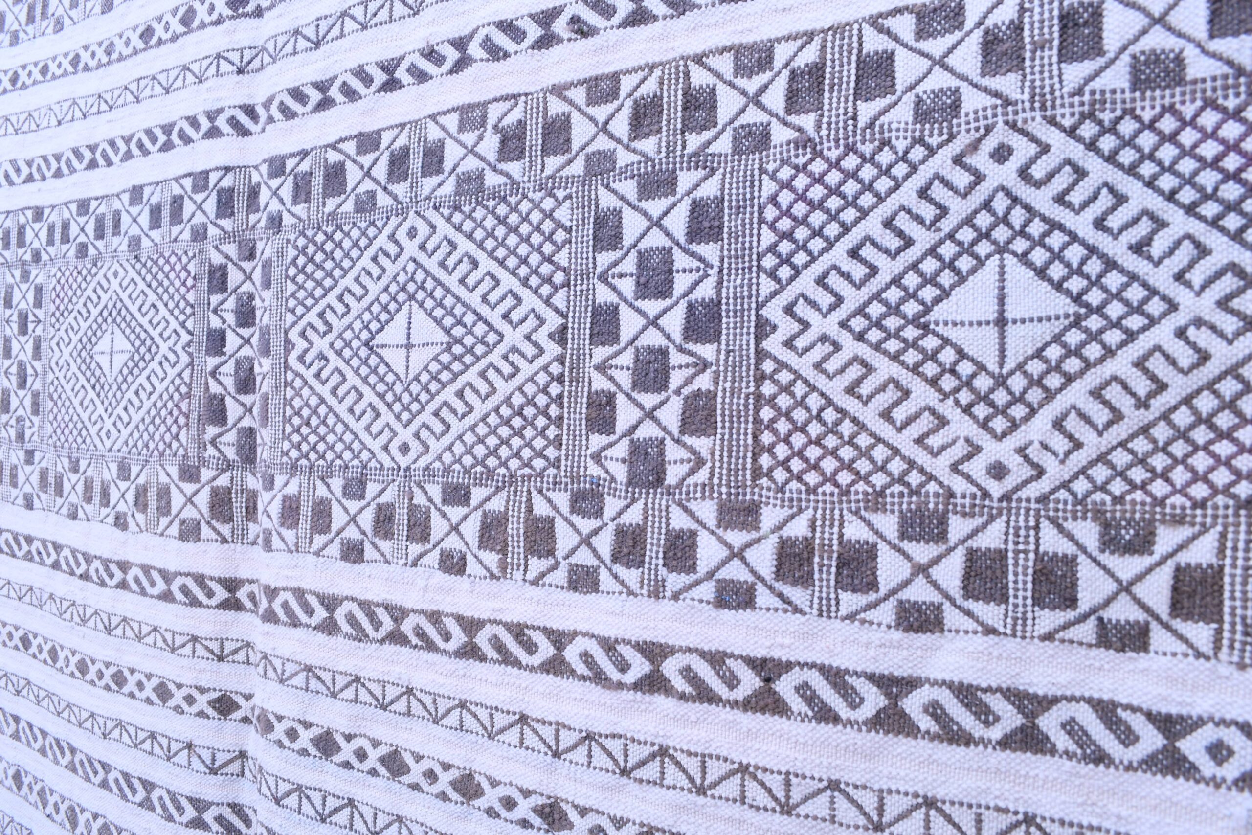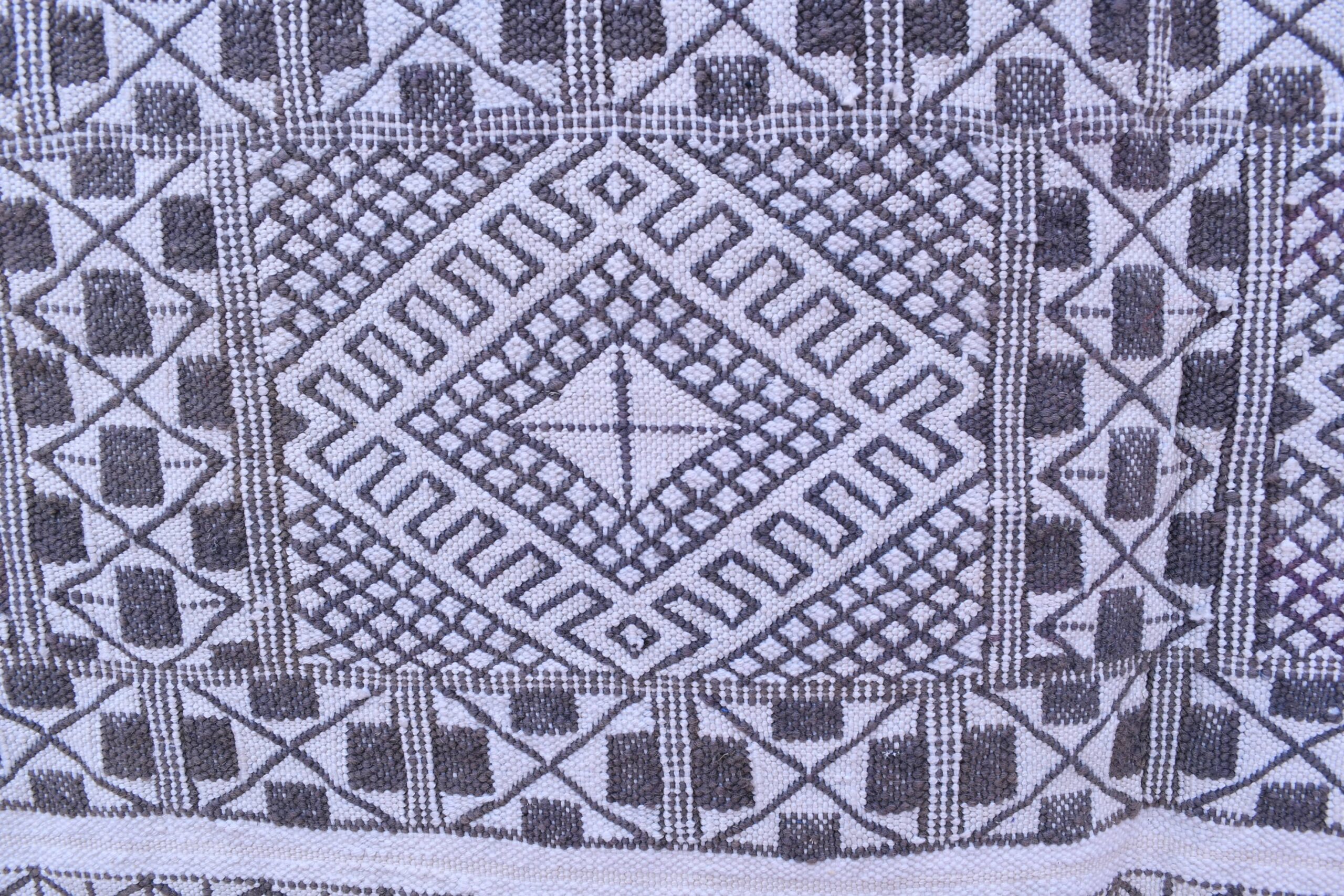 This Tiflet Kilim rug showcases an intricate geometric pattern, featuring a series of diamonds and linear motifs that echo traditional Moroccan artistry. The design is both captivating and versatile, making it a perfect centerpiece for any room.