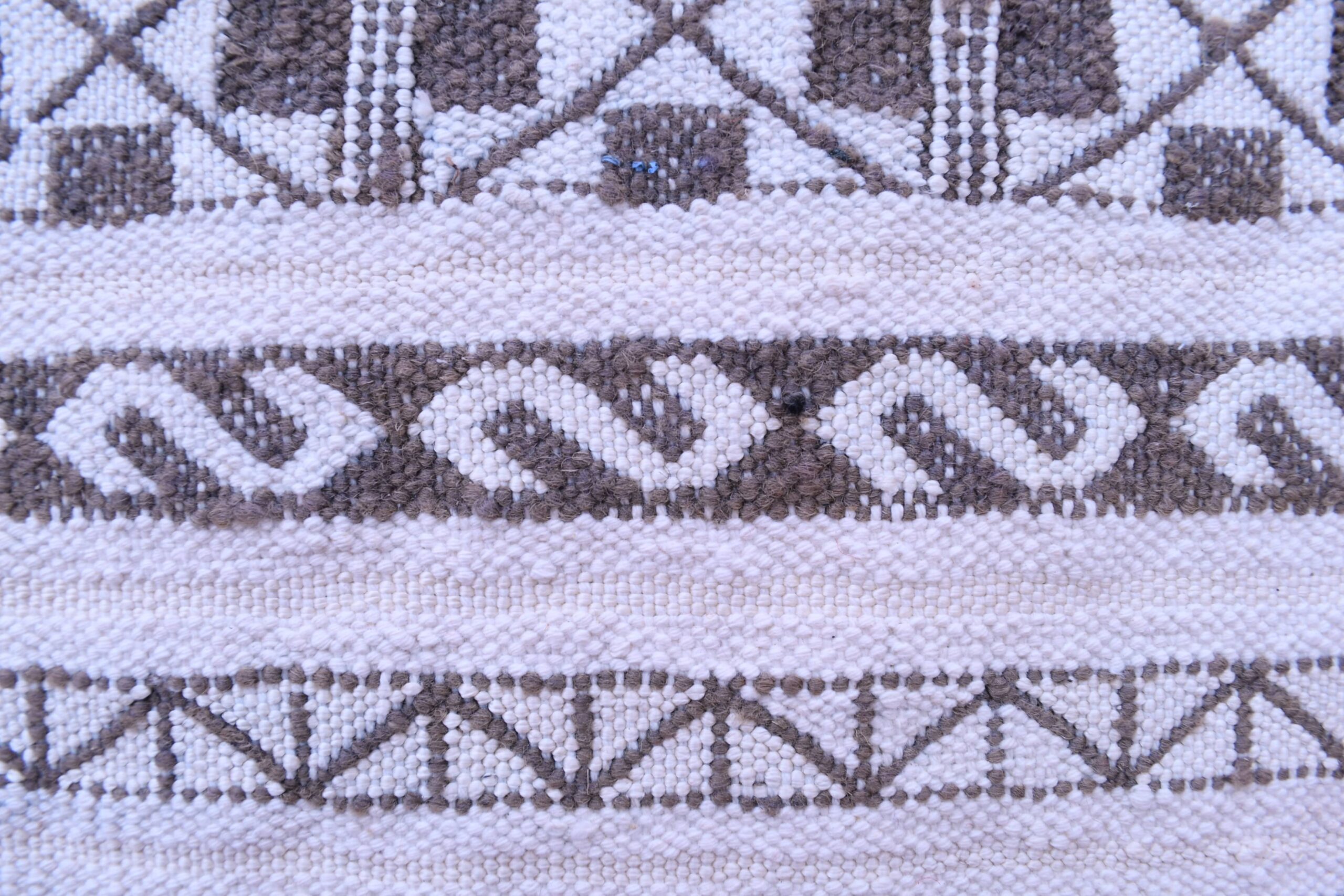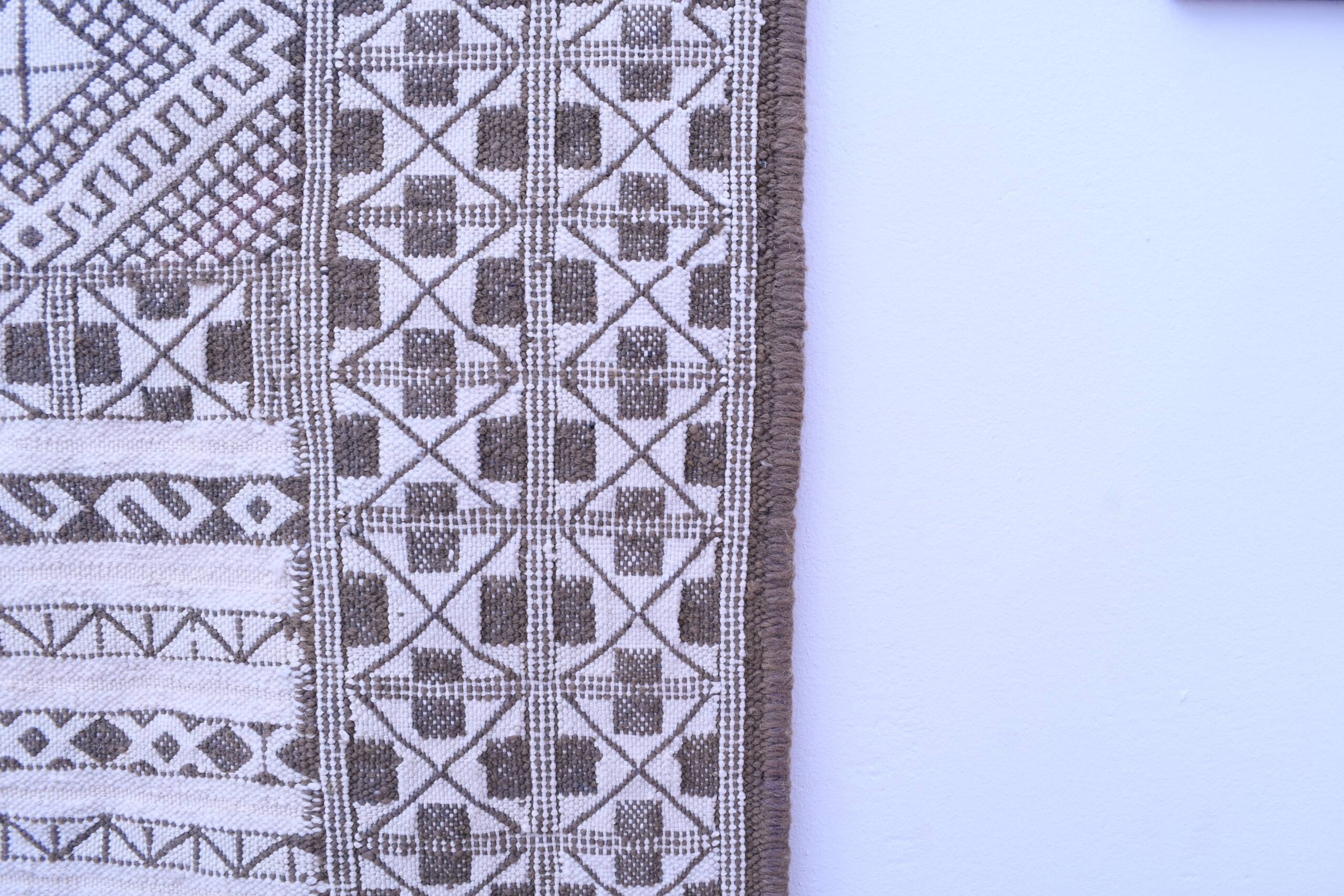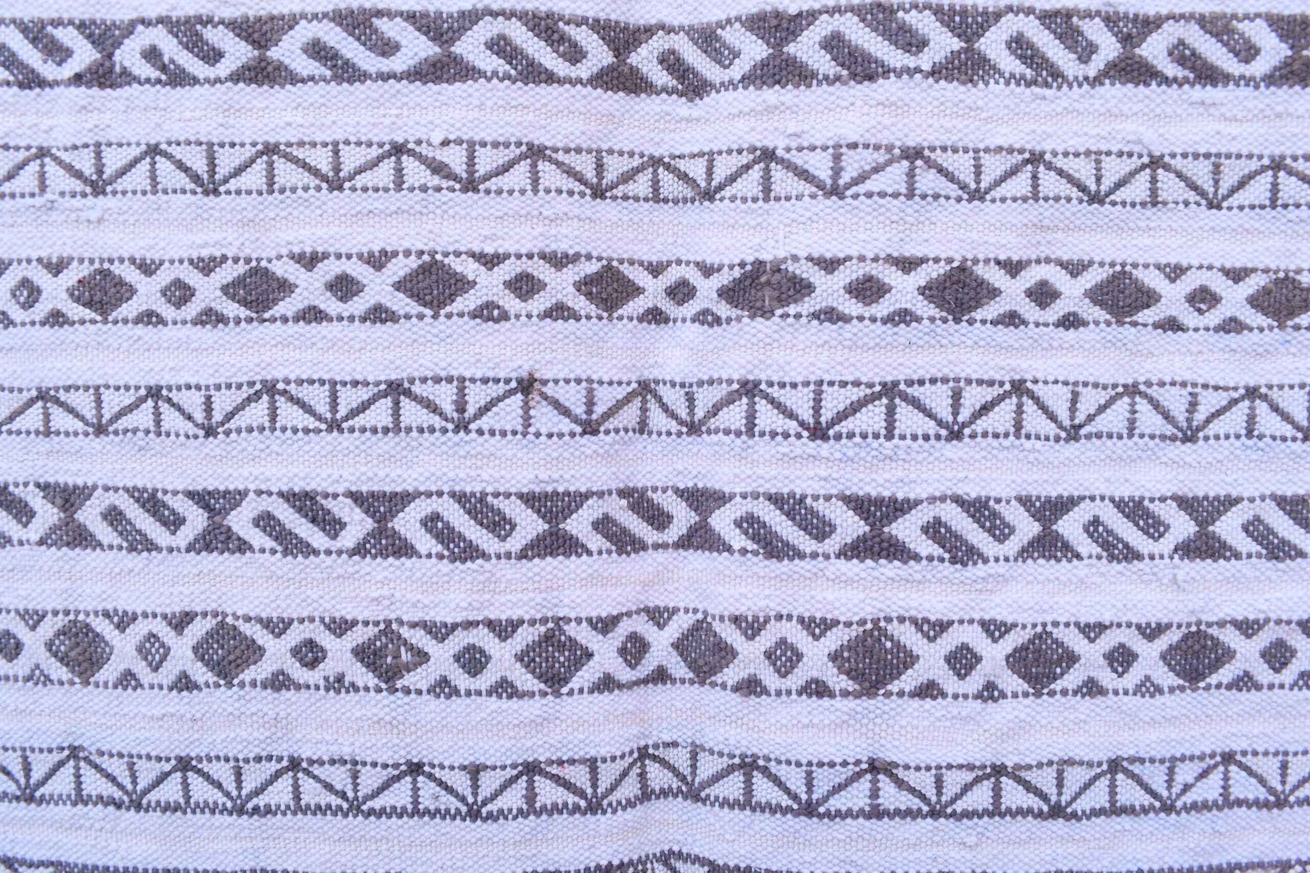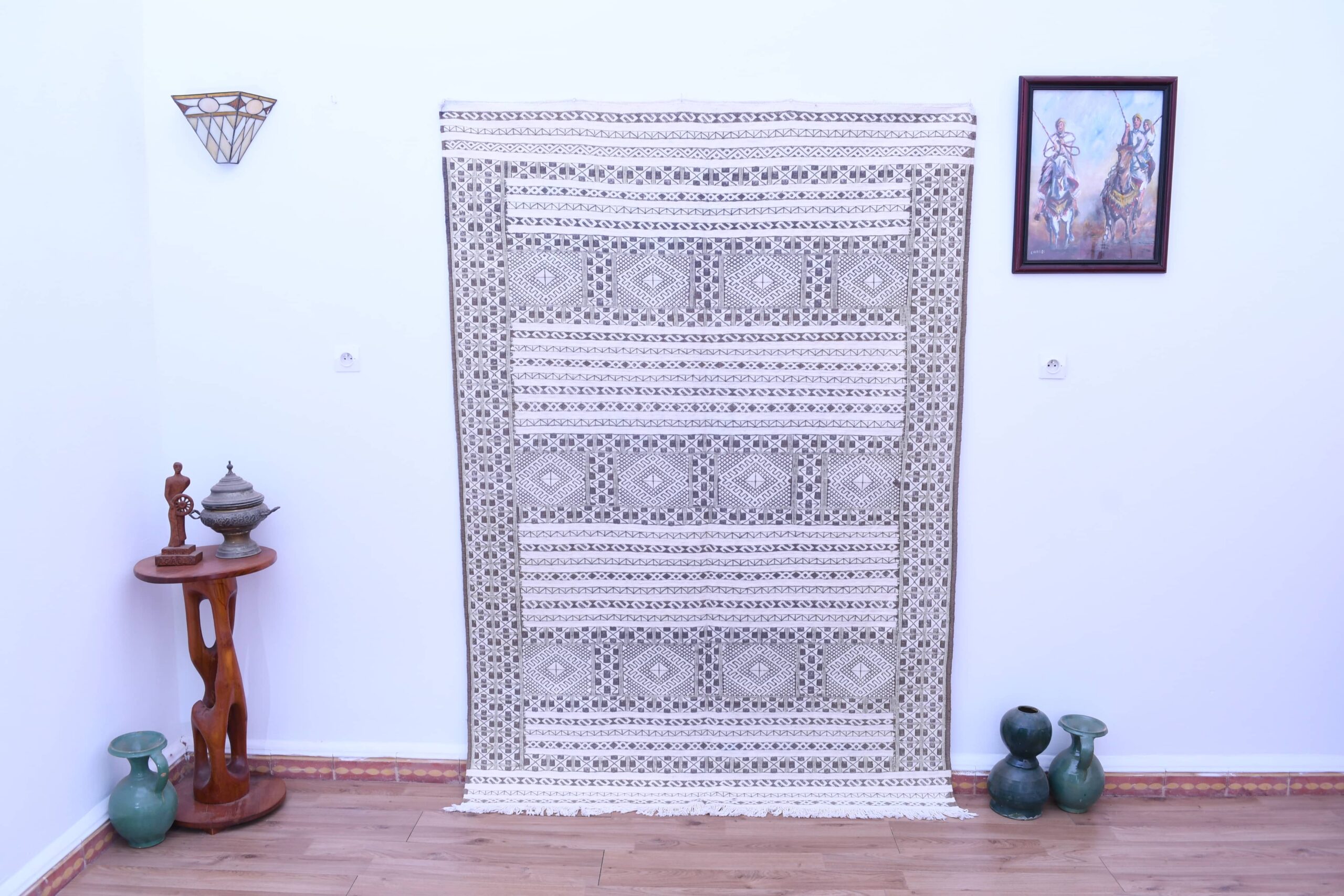 This Tiflet Kilim rug showcases an intricate geometric pattern, featuring a series of diamonds and linear motifs that echo traditional Moroccan artistry. The design is both captivating and versatile, making it a perfect centerpiece for any room.