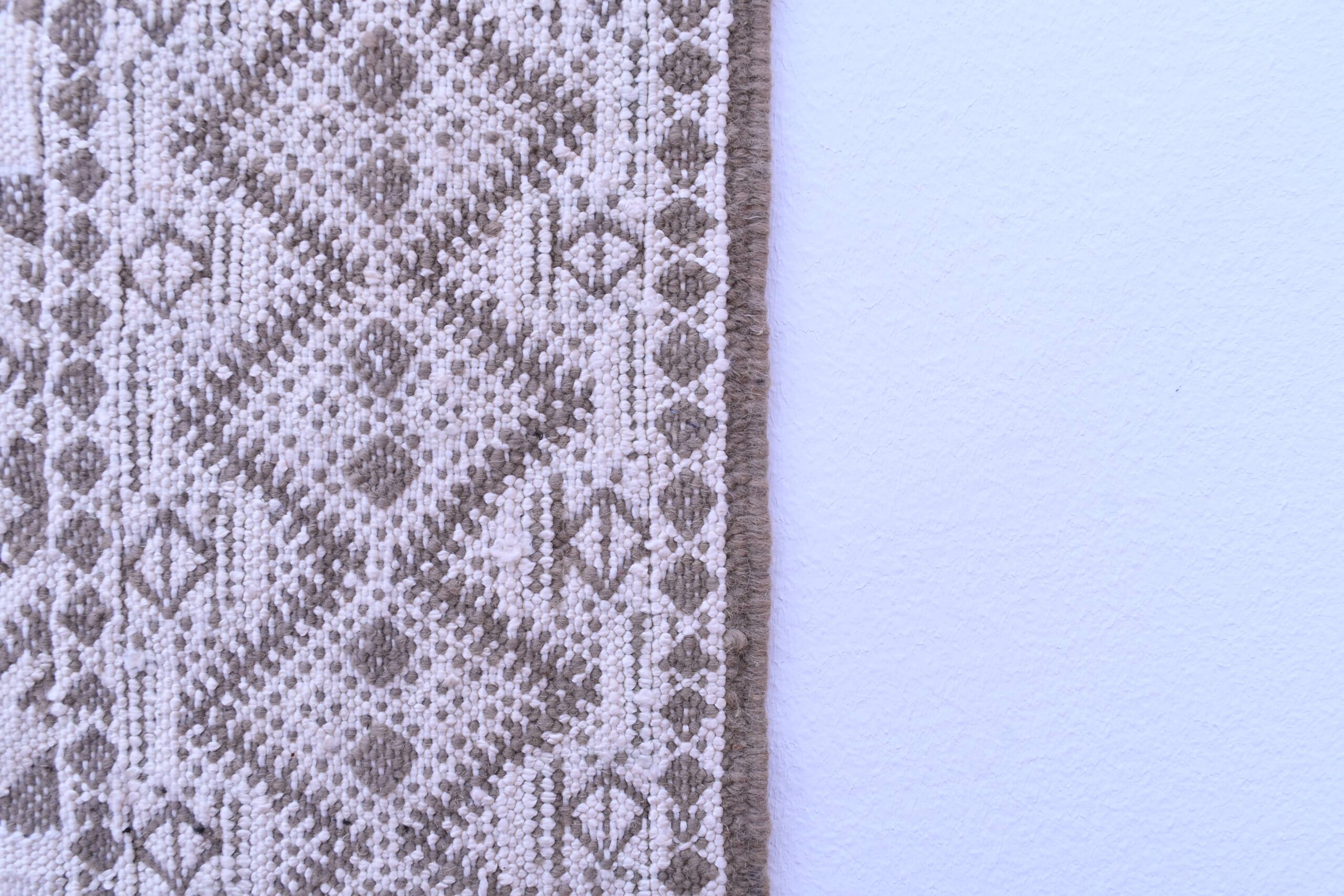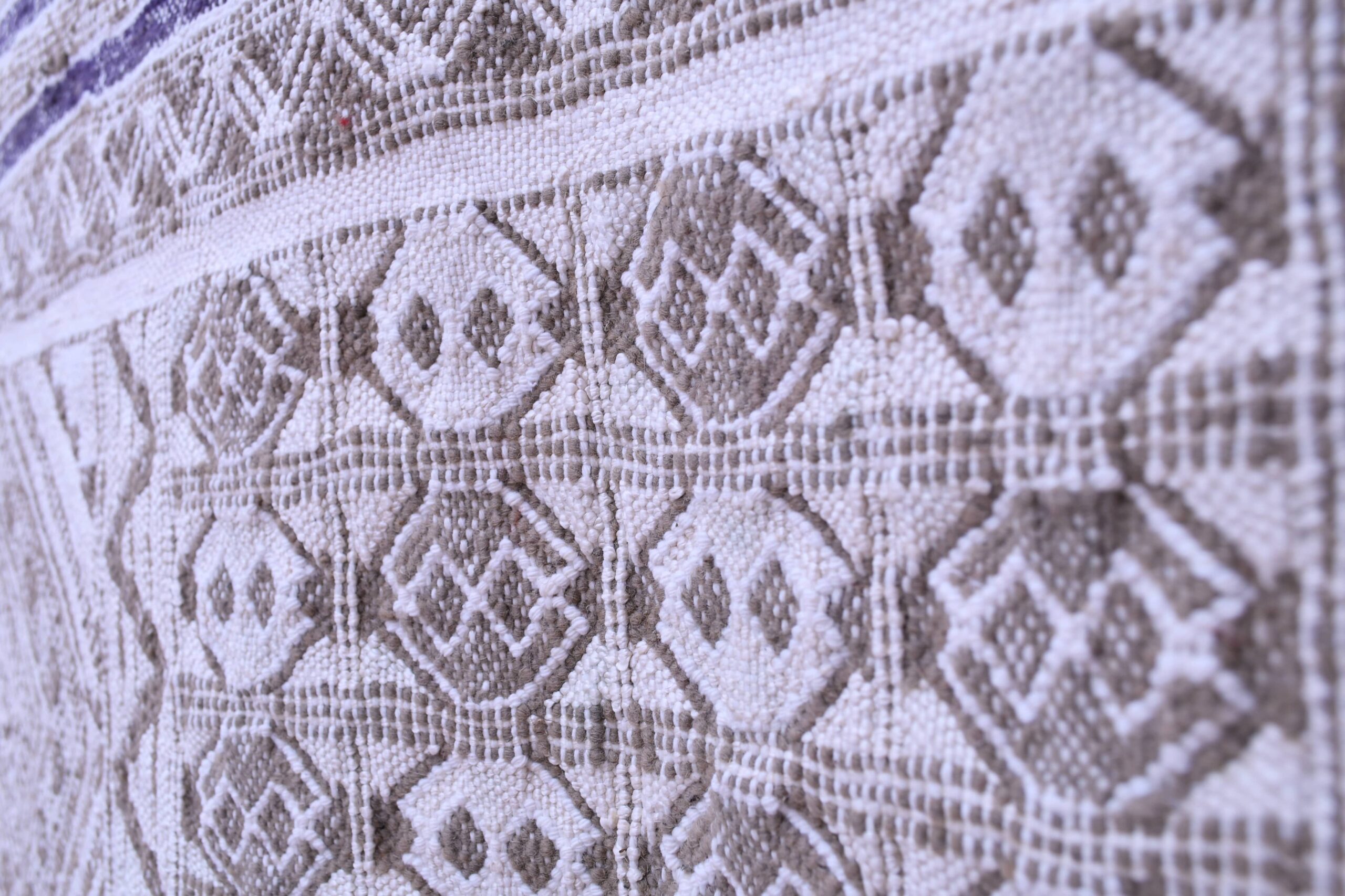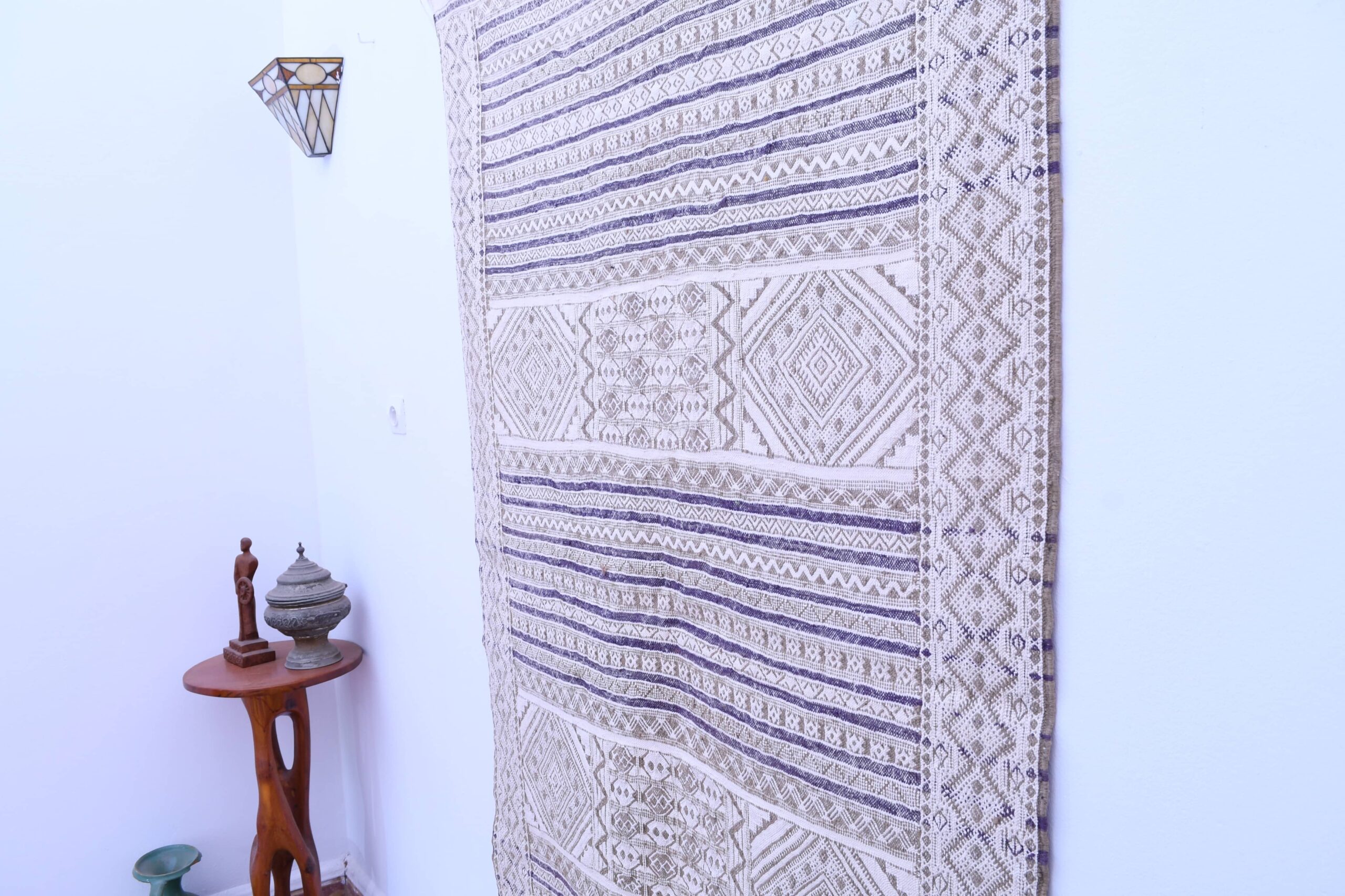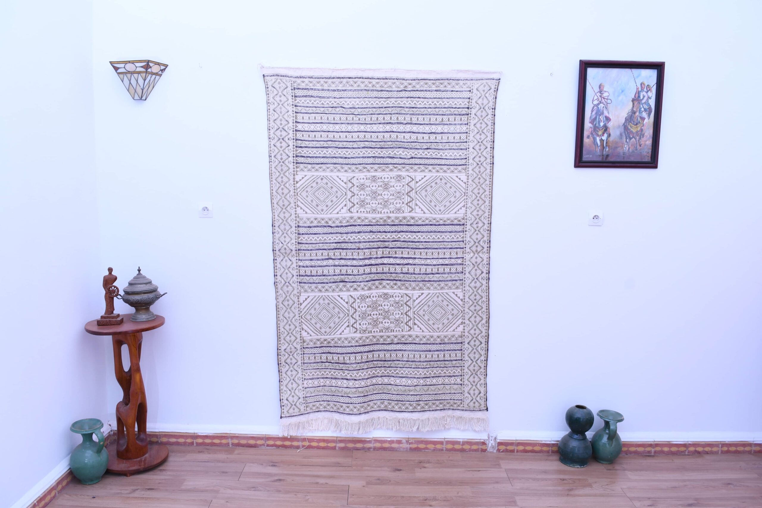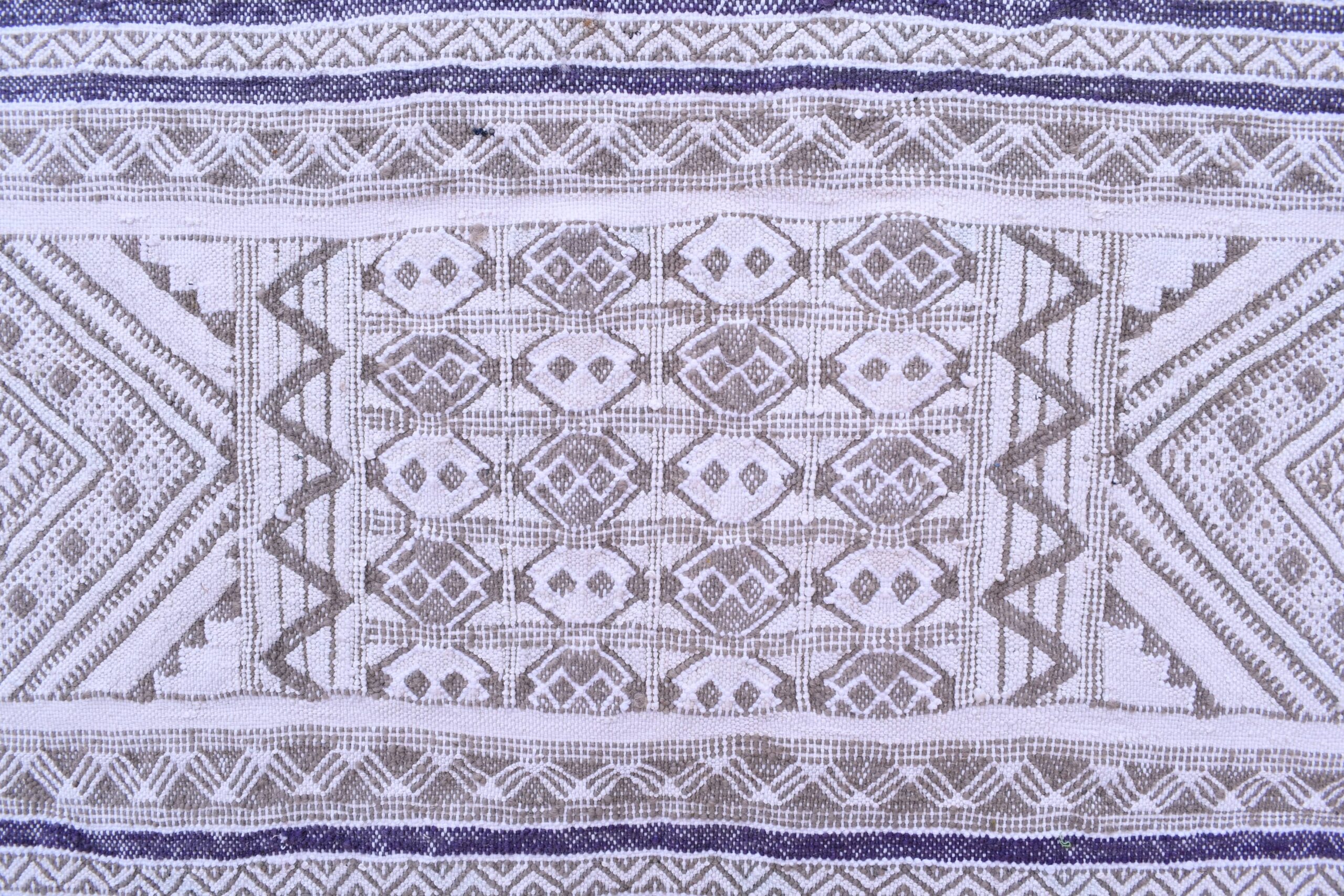 This stunning Tiflet Kilim rug measures 118.00 × 190.00 cm and showcases a traditional Moroccan design. The intricate geometric motifs, featuring diamond and zigzag patterns, are a testament to the rich cultural heritage of Moroccan craftsmanship.
