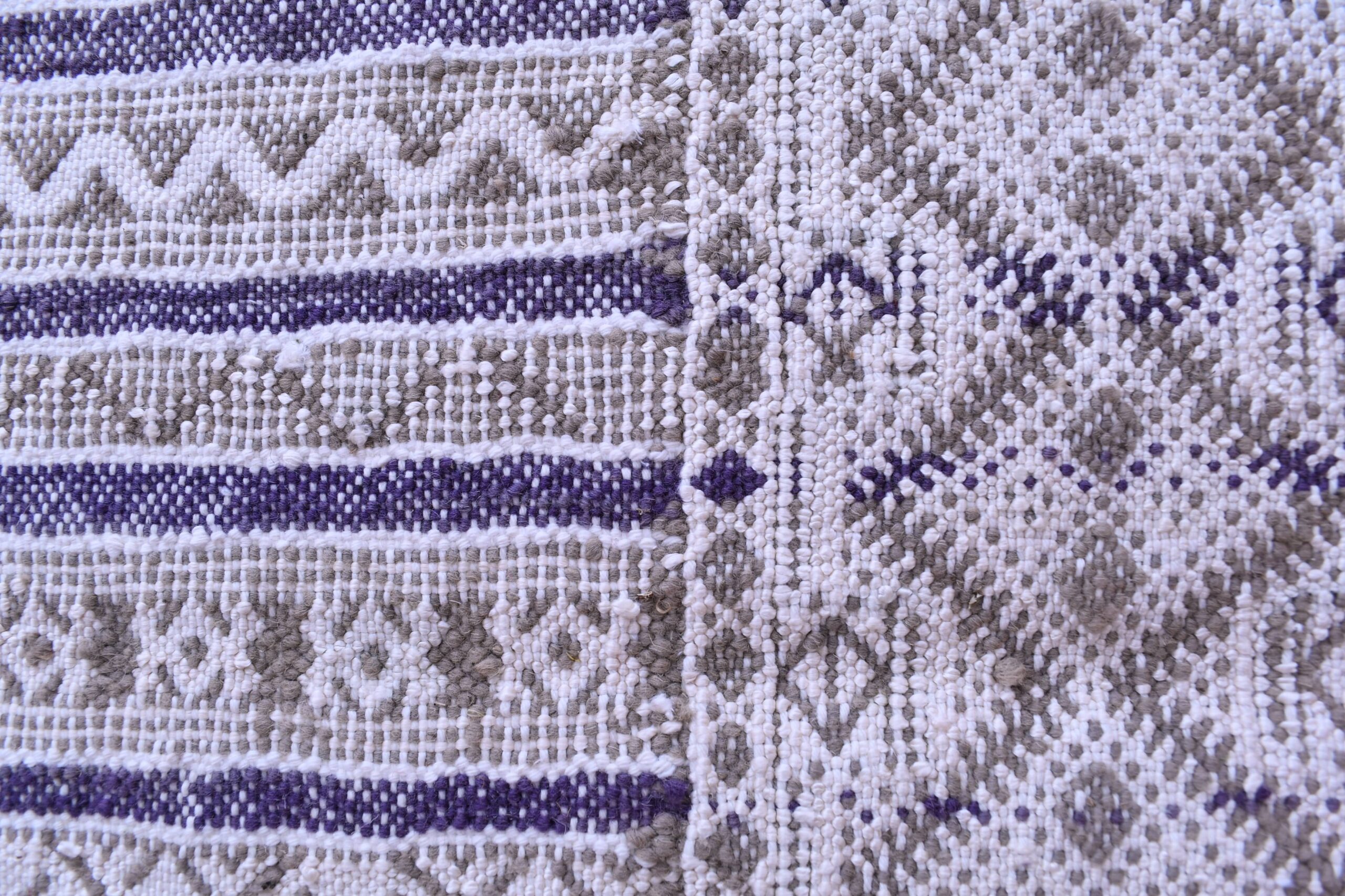 The rug’s color palette includes subtle shades of beige and cream, complemented by delicate hints of purple. This harmonious blend of colors creates a soothing and elegant aesthetic, making it an ideal addition to various interior styles.