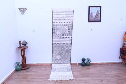 With its size of 72.00 × 303.00 cm, this Tiflet Kilim rug is ideal for placing in narrow spaces such as hallways or entryways, where it can serve as a striking focal point. Its neutral colors and intricate design make it an excellent match for minimalist, bohemian, or eclectic interiors, adding a touch of Moroccan elegance to any room.
