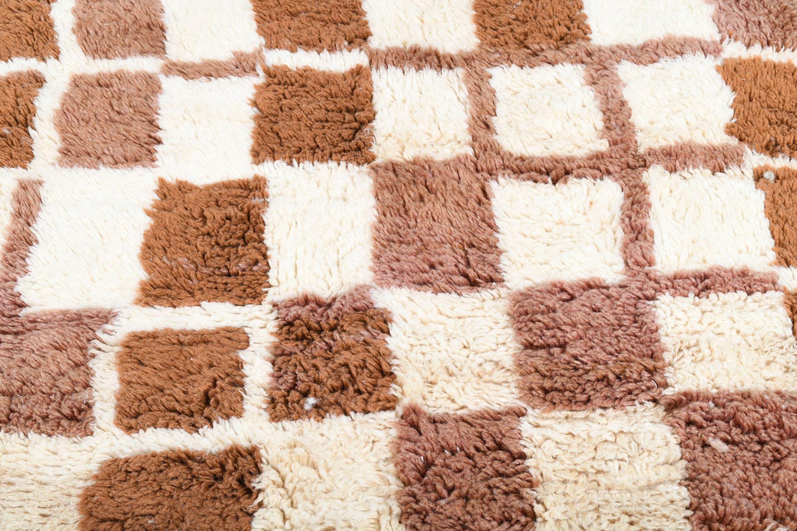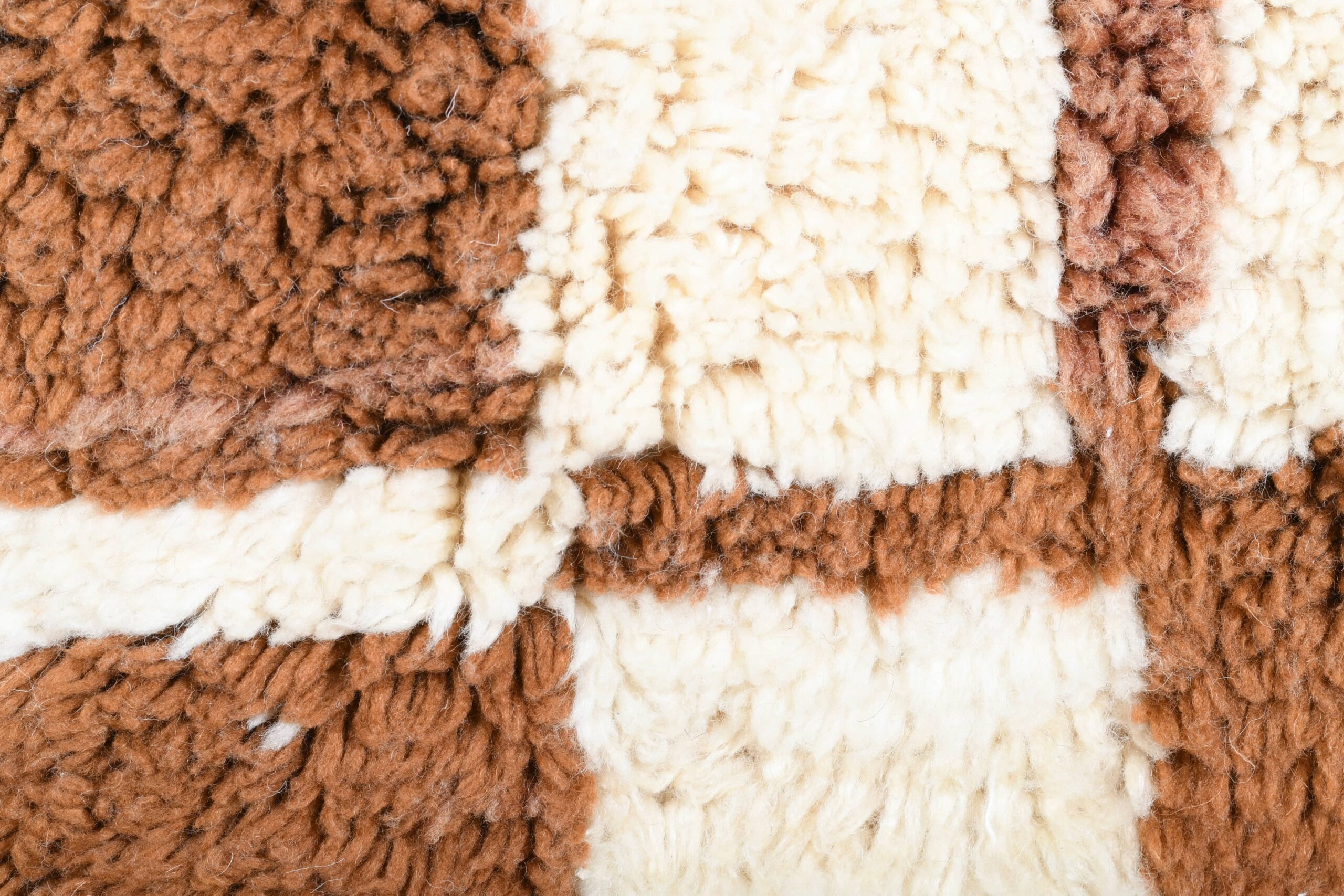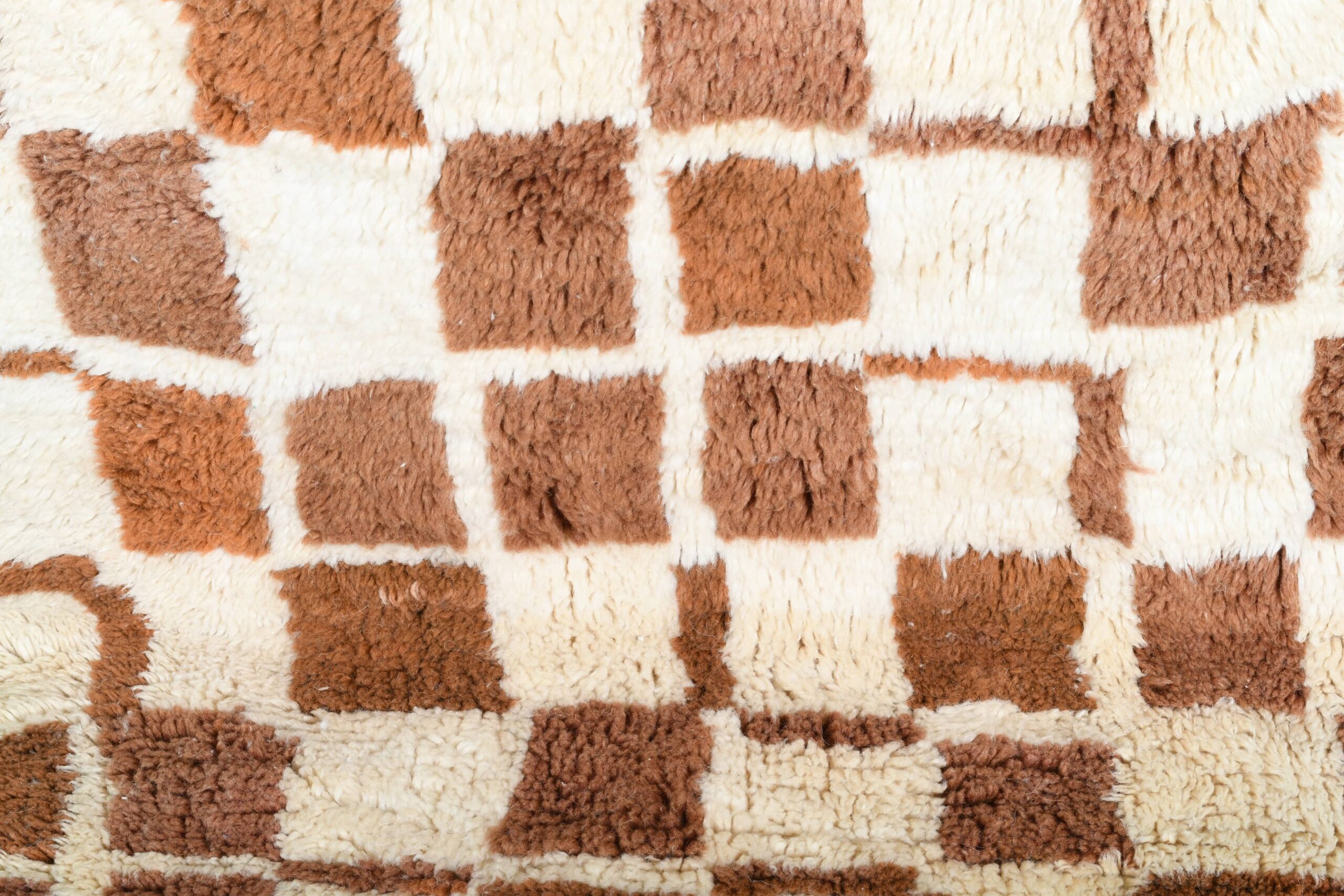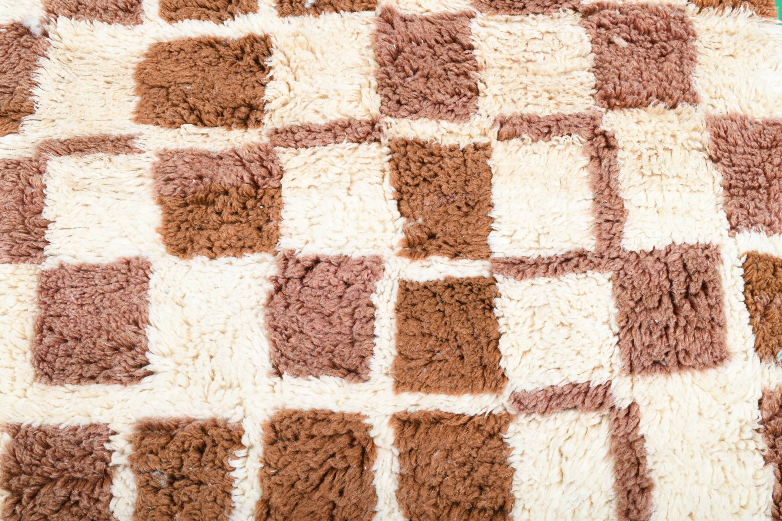 The palette is buyer-friendly and versatile: creamy ivory with caramel/cognac and mocha brown tones in a modern checkered grid. The soft wool pile feels plush and inviting underfoot—perfect if you want a minimalist, modern, or boho vibe without loud colors. This runner works beautifully in a long hallway, kitchen walkway, bedroom side runner, or as a grounding piece in a living room with neutral upholstery, wood floors, and warm earthy accents.