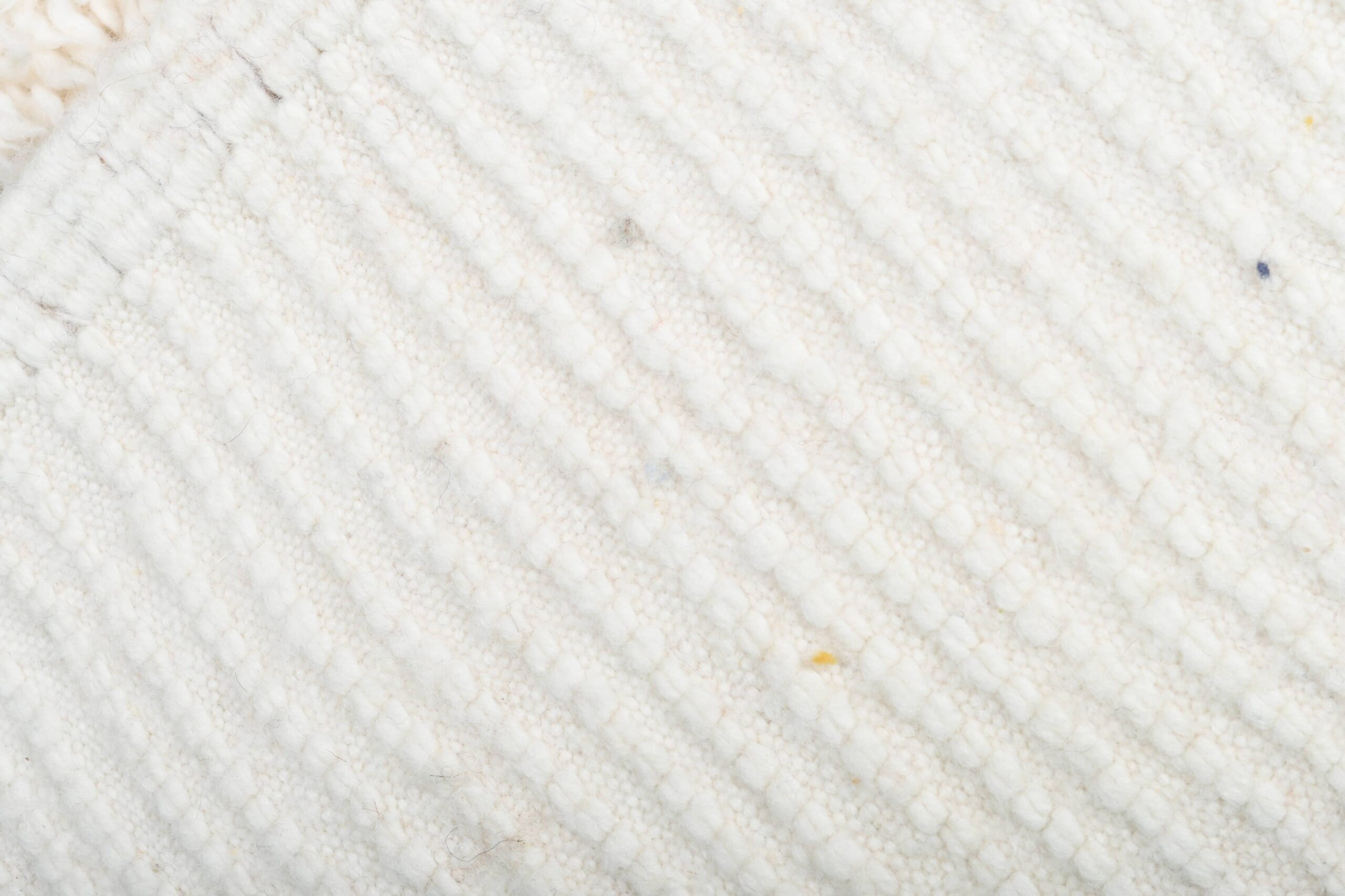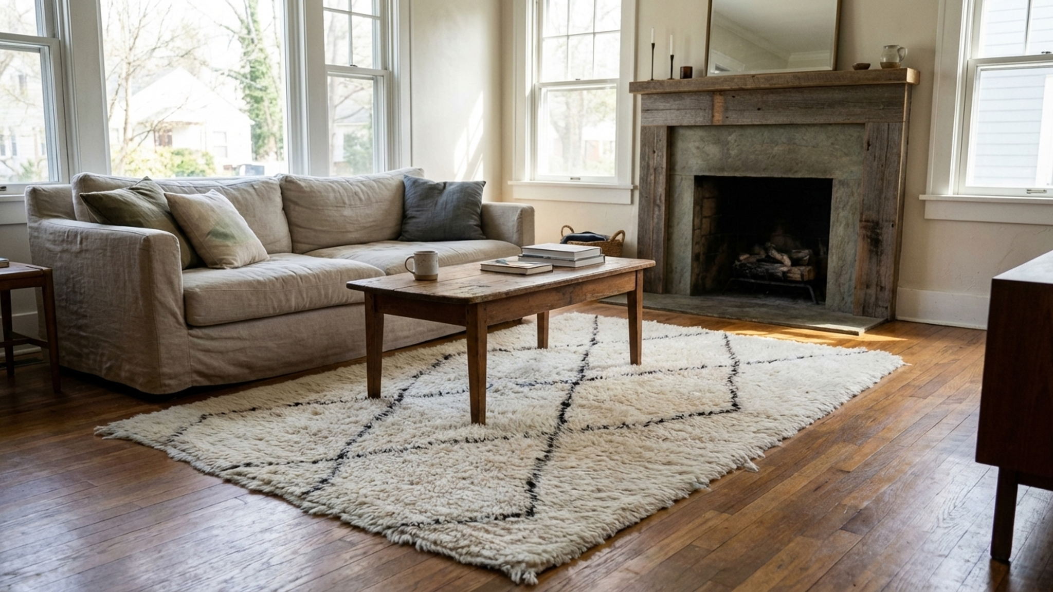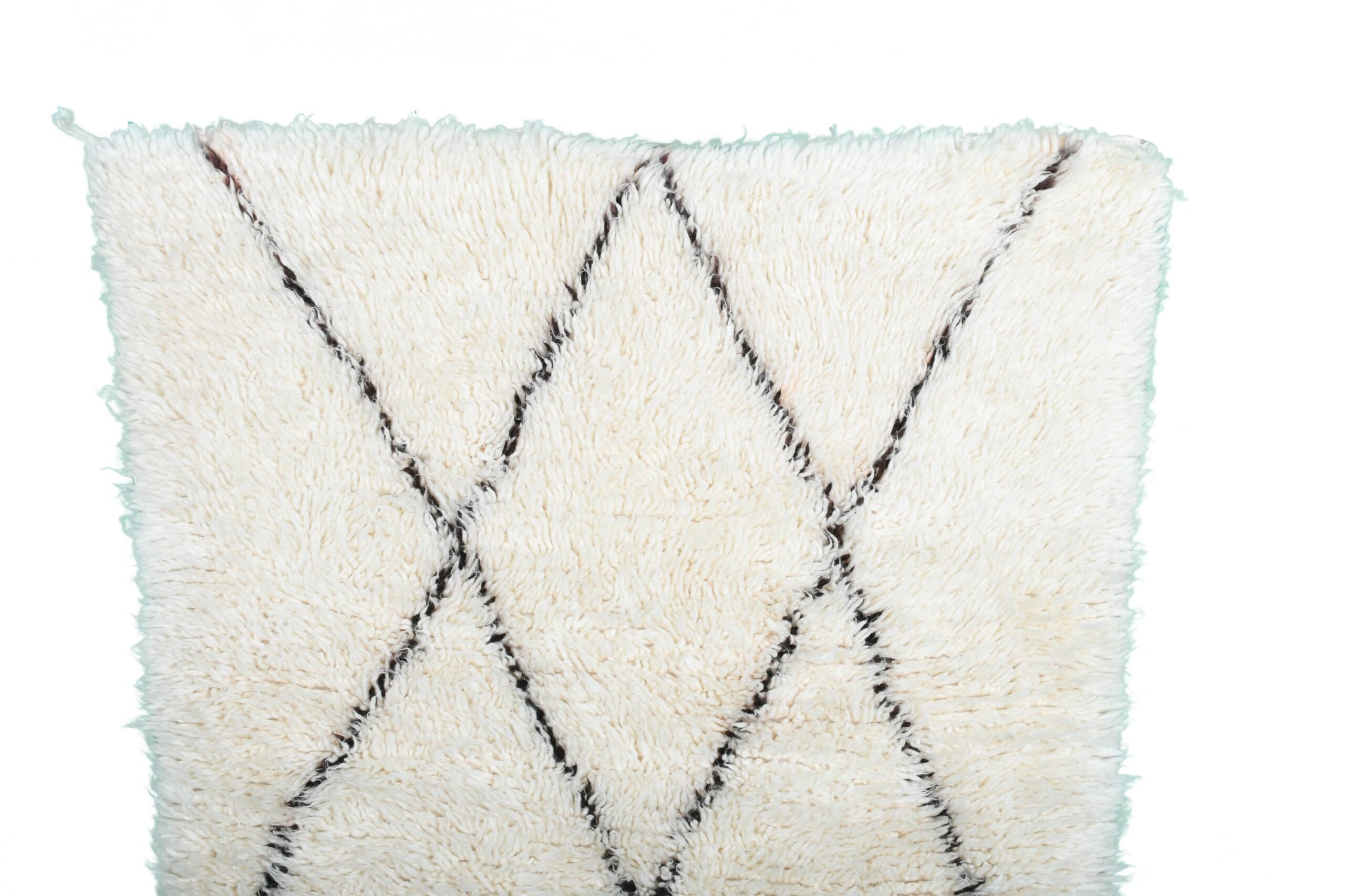 The color palette is the #1 reason customers choose this style: creamy ivory/white wool with thin black lines that read as modern and clean—not busy. This Moroccan wool rug adds texture without overwhelming your furniture, making it easy to style with neutral couches, wood floors, and layered textiles. Use it as a cozy bedroom rug for warm feet in the morning, or as a living room rug to soften a seating area. The pile is thick and inviting, with that classic handwoven character you can feel underfoot.