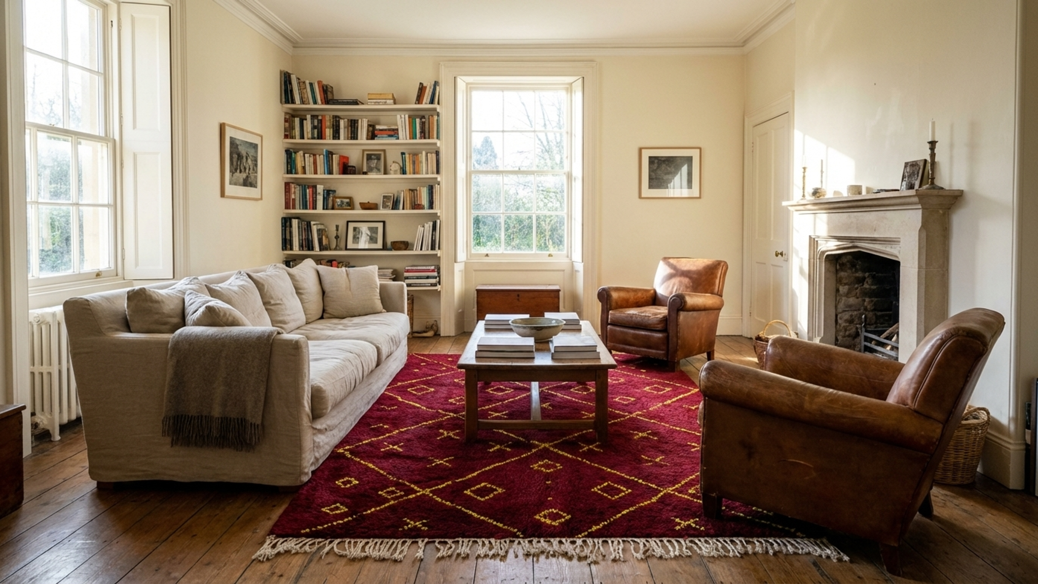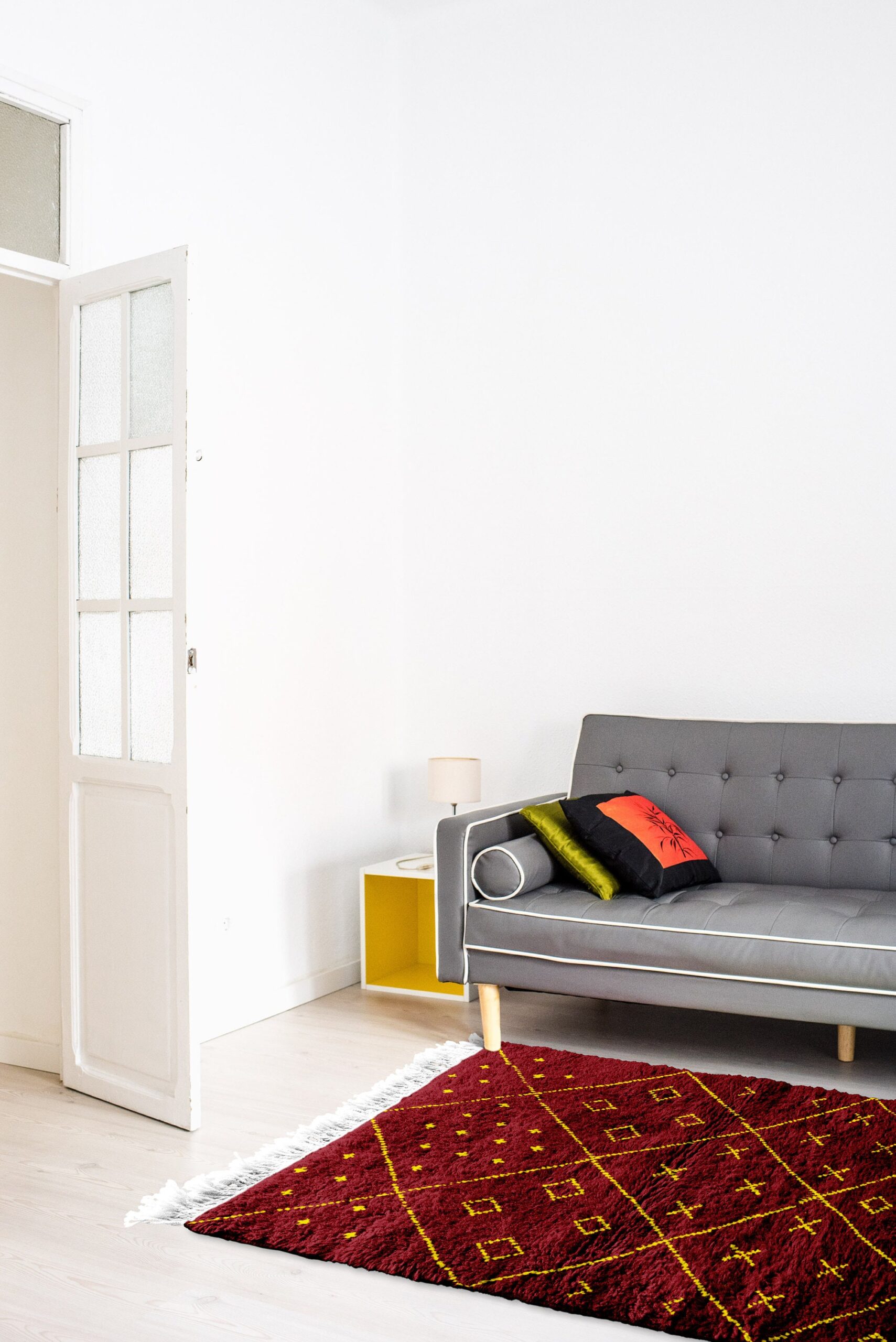 The deep wine/burgundy tone reads warm and inviting, while the bright yellow linework adds clean contrast that works with both modern and eclectic interiors. If you love boho decor but still want something polished, this geometric Moroccan area rug fits right in with mid-century modern furniture, modern farmhouse neutrals, or Scandinavian-style rooms that need a pop of color. The wool pile is cozy for bare feet, making it an ideal bedroom rug and a comfortable area rug for everyday lounging.